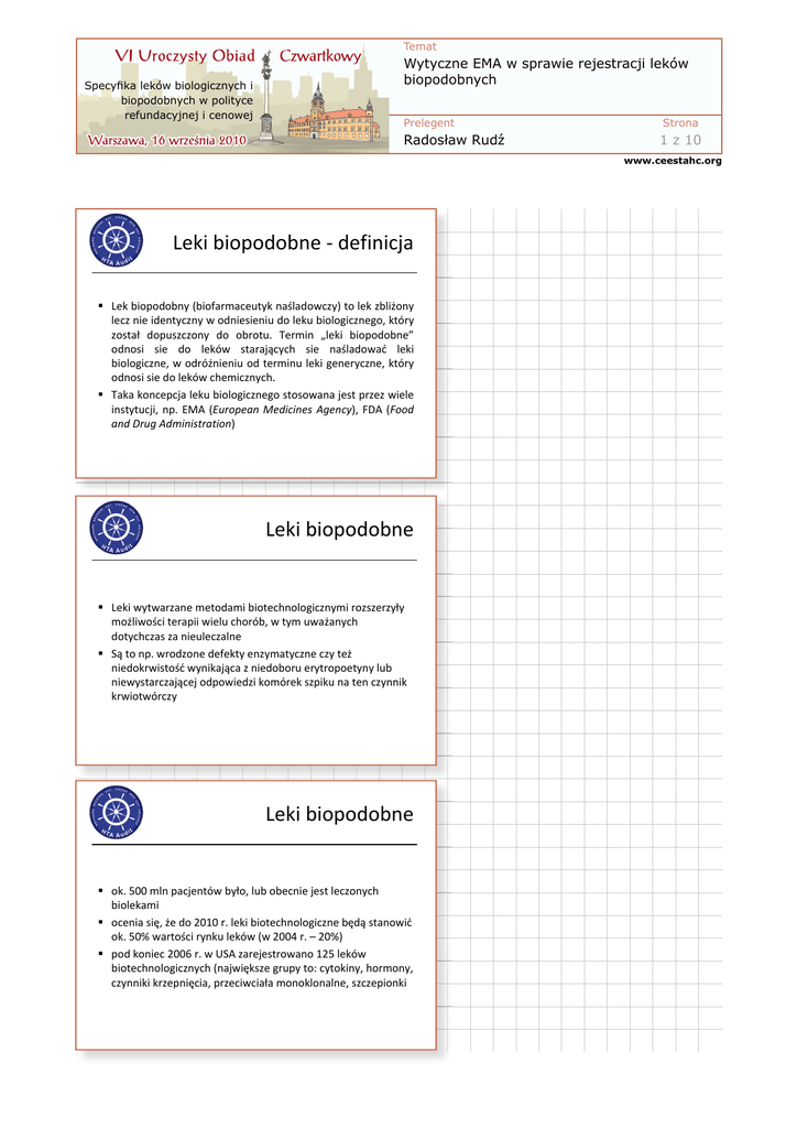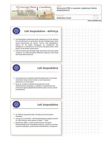 VI Uroczysty Obiad Specyfika leków biologicznych i biopodobnych w polityce refundacyjnej i cenowej Warszawa, 16 września 2010 Czwartkowy Temat Wytyczne EMA w sprawie rejestracji leków biopodobnych Prelegent Radosław Rudź Strona 1 z 10 www.ceestahc.org Leki biopodobne - definicja Lek biopodobny (biofarmaceutyk naƑladowczy) to lek zbliǏony lecz nie identyczny w odniesieniu do leku biologicznego, który zostaų dopuszczony do obrotu. Termin „leki biopodobne” odnosi sie do leków starajČcych sie naƑladowađ leki biologiczne, w odróǏnieniu od terminu leki generyczne, który odnosi sie do leków chemicznych. Taka koncepcja leku biologicznego stosowana jest przez wiele instytucji, np. EMA (European Medicines Agency), FDA (Food and Drug Administration) Leki biopodobne Leki wytwarzane metodami biotechnologicznymi rozszerzyųy moǏliwoƑci terapii wielu chorób, w tym uwaǏanych dotychczas za nieuleczalne SČ to np. wrodzone defekty enzymatyczne czy teǏ niedokrwistoƑđ wynikajČca z niedoboru erytropoetyny lub niewystarczajČcej odpowiedzi komórek szpiku na ten czynnik krwiotwórczy Leki biopodobne ok. 500 mln pacjentów byųo, lub obecnie jest leczonych biolekami ocenia siħ, Ǐe do 2010 r. leki biotechnologiczne bħdČ stanowiđ ok. 50% wartoƑci rynku leków (w 2004 r. – 20%) pod koniec 2006 r. w USA zarejestrowano 125 leków biotechnologicznych (najwiħksze grupy to: cytokiny, hormony, czynniki krzepniħcia, przeciwciaųa monoklonalne, szczepionki VI Uroczysty Obiad Temat Czwartkowy Wytyczne EMA w sprawie rejestracji leków biopodobnych Specyfika leków biologicznych i biopodobnych w polityce refundacyjnej i cenowej Prelegent Radosław Rudź Warszawa, 16 września 2010 Strona 2 z 10 www.ceestahc.org W 2004 roku zaczČų siħ proces wygasania ochrony patentowej na leki biologiczne I generacji: – czynniki stymulujČce wzrost granulocytów G-CSF: filgrastim, lenograstim – interferony a2a i a2b – erytropoetyny ɲ i ɴ Ochrona patentowa Preparat Wskazania kliniczne Patent w USA Nutropin zaburzenia wzrostu wygasá Patent w UE wygasá Abbokinase niedokrwienie wygasá wygasá Humulin cukrzyca wygasá wygasá Ceredase choroba Gauchera wygasá wygasá Streptase niedokrwienie wygasá wygasá Intron A zapalenie wątroby typu B i C wygasá wygasá Serostim zespóá wyniszczenia w AIDS wygasá nie dotyczy Humatrope zaburzenia wzrostu wygasá nie dotyczy Epogen, Procrit, Eprex niedokrwistoĞü 2013 (przedáuĪony) wygasá (2004) Neorecormon niedokrwistoĞü nie dotyczy wygasá (2006) TNKase zawaá serca wygasá (2005) wygasá (2005) Actimmune choroby ziarniniakowe 2012 wygasá (2004) Activase zawaá serca 2010 wygasá (2005) Proleukin HIV 2012 wygasá (2005) Neupogen hipoplazja szpiku 2015 wygasá (2006) Nowicki M., Zimmer-Nowicka J. Onkologia w Praktyce Klinicznej 2007; 3(3): 120-127 Pierwsze regulacje dotyczČce kwestii leków biopodobnych w kontekƑcie ich rejestracji zawarto w dyrektywie Parlamentu Europejskiego z 2004 r. (European Directive 2004/27/EC) EMEA (obecnie EMA) wydaųa zalecenia dotyczČce leków biopodobnych w 2005 r. VI Uroczysty Obiad Specyfika leków biologicznych i biopodobnych w polityce refundacyjnej i cenowej Warszawa, 16 września 2010 Czwartkowy Temat Wytyczne EMA w sprawie rejestracji leków biopodobnych Prelegent Radosław Rudź Strona 3 z 10 www.ceestahc.org Dossier rejestracyjne Podmiot ubiegajČcy siħ o dopuszczenie do obrotu na terenie Unii Europejskiej leku biopodobnego zobowiČzany jest do wskazania leku referencyjnego (leku biologicznego, którego struktura i dziaųanie sČ naƑladowane przez lek biopodobny, który zostaų juǏ dopuszczony do obrotu na terenie UE). Ten sam lek referencyjny musi byđ punktem odniesienia we wszystkich czħƑciach dossier rejestracyjnego: – jakoƑđ leku – bezpieczeŷstwo – skutecznoƑđ Wytyczne zwracajČ uwagħ na wysokČ zųoǏonoƑđ leków biologicznych oraz potencjalnie istotny wpųyw nawet niewielkich zmian w procesie produkcyjnym na skutecznoƑđ i profil bezpieczeŷstwa leków biologicznych Podmiot ubiegajČcy siħ o dopuszczenie do obrotu zobowiČzany jest do przeprowadzenia odpowiednich badaŷ klinicznych oraz do przedstawienia odpowiednich danych przedklinicznych Wymagane jest przeprowadzenie badania skutecznoƑci leku w odpowiednim wskazaniu lub wskazaniach rejestracyjnych VI Uroczysty Obiad Czwartkowy Specyfika leków biologicznych i biopodobnych w polityce refundacyjnej i cenowej Temat Wytyczne EMA w sprawie rejestracji leków biopodobnych Prelegent Radosław Rudź Warszawa, 16 września 2010 Strona 4 z 10 www.ceestahc.org JeƑli lek referencyjny ma kilka wskazaŷ, podmiot odpowiedzialny musi wykazađ skutecznoƑđ i bezpieczeŷstwo leku biopodobnego we wszystkich wskazaniach W pewnych przypadkach dane wykazujČce biopodobnoƑđ w jednym wskazaniu mogČ byđ ekstrapolowane na inne ZaleǏy to od: – praktyki klinicznej – dostħpnej literatury naukowej – dowodów wskazujČcych na taki sam mechanizm dziaųania i zaangaǏowanie tych samych receptorów we wszystkich wskazaniach Wymagania rejestracyjne substancja aktywna zastosowana w leku biopodobnym musi byđ podobna wg kryteriów molekularnych i biologicznych, do substancji aktywnej z leku referencyjnego postađ farmaceutyczna, siųa i droga podania leku biopodobnego powinny byđ identyczne w stosunku do leku referencyjnego w przypadku jakichkolwiek róǏnic niezbħdne jest dostarczenie dodatkowych dowodów na porównywalnoƑđ obu leków Lek generyczny a biopodobny w stosunku do leków biopodobnych nie moǏna zastosowađ pojħcia analogicznego do terminu „generyk” bČdǍ „biogeneryk” wytyczne EMA jednoznacznie stwierdzajČ, Ǐe, w przeciwieŷstwie do leków chemicznych, leków biotechnologicznych nie moǏna w prosty sposób kopiowađ VI Uroczysty Obiad Czwartkowy Specyfika leków biologicznych i biopodobnych w polityce refundacyjnej i cenowej Temat Wytyczne EMA w sprawie rejestracji leków biopodobnych Prelegent Radosław Rudź Warszawa