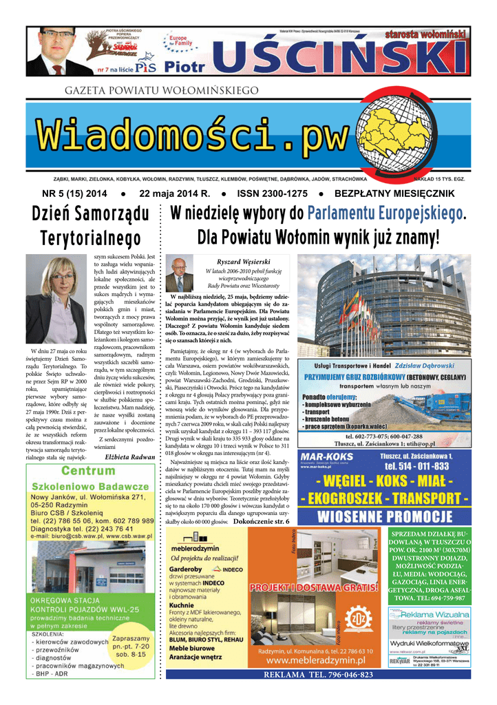 Wiadomości.pw reklama tel. 796-046-823 NR 5 (15) 2014 W dniu 27 maja co roku świętujemy Dzień Samorządu Terytorialnego. To polskie Święto uchwalone przez Sejm RP w 2000 roku, upamiętniające pierwsze wybory samorządowe, które odbyły się 27 maja 1990r. Dziś z perspektywy czasu można z całą pewnością stwierdzić, że ze wszystkich reform okresu transformacji reaktywacja samorządu terytorialnego stała się najwięk- ● WWW.WIADOMOSCIPW.PL 22 maja 2014 R. szym sukcesem Polski. Jest to zasługa wielu wspaniałych ludzi aktywizujących lokalne społeczności, ale przede wszystkim jest to sukces mądrych i wymagających mieszkańców polskich gmin i miast, tworzących z mocy prawa wspólnoty samorządowe. Dlatego też wszystkim koleżankom i kolegom samorządowcom, pracownikom samorządowym, radnym wszystkich szczebli samorządu, w tym szczególnym dniu życzę wielu sukcesów, ale również wiele pokory, cierpliwości i roztropności w służbie polskiemu społeczeństwu. Mam nadzieję, że nasze wysiłki zostaną zauważone i docenione przez lokalne społeczności. Z serdecznymi pozdrowieniami Elżbieta Radwan ● ISSN 2300-1275 ● BEZPŁATNY MIESIĘCZNIK Ryszard Węsierski W latach 2006-2010 pełnił funkcję wiceprzewodniczącego Rady Powiatu oraz Wicestarosty W najbliższą niedzielę, 25 maja, będziemy udzielać poparcia kandydatom ubiegającym się do zasiadania w Parlamencie Europejskim. Dla Powiatu Wołomin można przyjąć, że wynik jest już ustalony. Dlaczego? Z powiatu Wołomin kandyduje siedem osób. To oznacza, że o sześć za dużo, żeby rozpisywać się o szansach którejś z nich. Pamiętajmy, że okręg nr 4 (w wyborach do Parlamentu Europejskiego), w którym zamieszkujemy to cała Warszawa, osiem powiatów wokółwarszawskich, czyli: Wołomin, Legionowo, Nowy Dwór Mazowiecki, powiat Warszawski-Zachodni, Grodziski, Pruszkowski, Piaseczyński i Otwocki. Prócz tego na kandydatów z okręgu nr 4 głosują Polacy przebywający poza granicami kraju. Tych ostatnich można pominąć, gdyż nie wnoszą wiele do wyników głosowania. Dla przypomnienia podam, że w wyborach do PE przeprowadzonych 7 czerwca 2009 roku, w skali całej Polski najlepszy wynik uzyskał kandydat z okręgu 11 – 393 117 głosów. Drugi wynik w skali kraju to 335 933 głosy oddane na kandydata w okręgu 10 i trzeci wynik w Polsce to 311 018 głosów w okręgu nas interesującym (nr 4). Najważniejsze są miejsca na liście oraz ilość kandydatów w najbliższym otoczeniu. Tutaj mam na myśli najsilniejszy w okręgu nr 4 powiat Wołomin. Gdyby mieszkańcy powiatu chcieli mieć swojego przedstawiciela w Parlamencie Europejskim poszliby zgodnie zagłosować w dniu wyborów. Teoretycznie przełożyłoby się to na około 170 000 głosów i wówczas kandydat o największym poparciu dla danego ugrupowania uzyskałby około 60 000 głosów. Dokończenie str. 6 Sprzedam działkę budowlaną w Tłuszczu o pow. ok. 2100 m2 (30x70m) dwustronny dojazd, możliwość podziału, media: wodociąg, gazociąg, linia energetyczna, droga asfaltowa. Tel: 694-759-987 reklama tel. 796-046-823 2 Wiadomości.pw CO? GDZIE? KIEDY? WWW.WIADOMOSCIPW.PL MARKI TURYSTYCZNE: ■ Wycieczka autokarowa do Częstochowy, 09.06.2014, godzina 17:00. Po drodze do Marek planowany postój na obiad we własnym zakresie oraz zwiedzanie Żyrardowa (unikatowa, odbudowana współcześnie zabytkowa zabudowa dawnej fabryki) i kościoła Matki Bożej Pocieszenia z witrażami J. Mehoffera. Około godz. 20 Powrót na parking ul. Lisa Kuli 3 w Markach. Koszt wycieczki 145 zł w tym: ubezpieczenie NNW, nocleg ze śniadaniem, przejazd autokarem, obsługa przewodnicka. Wstępy opłacają uczestnicy indywidualnie. Obiady we własnym zakresie. Organizator wycieczki: Marecki Ośrodek Kultury. Pilot i przewodnik wycieczki: Elżbieta Zatorowska - historyk sztuki. DLA DZIECI: ■ Zarząd PZW Koło Miejskie nr 14 w Markach organizuje 1 czerwca 2014 r. na Kanale Królewskim w Nieporęcie (wjazd od strony miejscowości Małołęka – niebieska kładka dla pieszych) Festyn wędkarski z okazji Dnia Dziecka pod honorowym patronatem Burmistrza Miasta Marki. Zbiórka 8.30 – 9.00 w ramach festynu organizowane są liczne atrakcje, konkursy, gry i zabawy, w tym zawody spławikowe. Po zawodach około godz. 1200 poczęstunek dla uczestników i opiekunów (grill, napoje, herbata, kawa) Zapisy dzieci biorących udział w zawodach wędkarskich można dokonać u Skarbnika Koła w Sklepie wędkarskim „SIUPEX” Marki ul. Piłsudskiego 172 w terminie do dnia 30 maja 2014 r. do godz. 19.00 SPORTOWE: ■ 17 czerwca to dzień zmagań młodych piłkarzy (gimnazjaliści) z Powiatu Wołomińskiego. Miejsce rozgrywek: Marki, ul. Okólna 14 w Markach (Orlik przy Szkole Podstawowej nr 1).Turniej Piłkarski o Puchar im. bł. Bronisława Markiewicza w Markach jest organizowany przez Katolickie Gimnazjum w Markach przy wsparciu Urzędu Miasta Marki. Tegoroczny turniej zostanie rozegrany po raz szósty. Początek o godz. 10. Zmagania tradycyjnie komentuje ks. Marcin Rózański - dyrektor KG. KULTURALNE: RADZYMIN ■ ROKiS wspólnie z Biblioteką Publiczną w Radzyminie zapraszają na koncert zespołu Vena Valley, 31 maja 2014 r. (sobota) o godz. 18.00 do Miejskiej Sali Koncertowej przy ul. Konstytucji 3 Maja nr 15. Wstęp wolny. ■ 7.06.2014(sobota) godz.16:00 Inauguracja STARadzymin 2014, "Żabusie" - D.Gellner, M.Puzio, opracowanie muz. M. Puzio w wykonaniu zespołu dzieci z grupy teatralnej Biblioteki Miasta i Gminy Radzymin (klasy II, III) ■ godz.18:30"Bajkolandia" scenki z ulubionych bajek i lektur szkolnych w wykonaniu zespołu teatralnego Biblioteki Miasta i Gminy Radzymin (dzieci III-VI z Radzymina) teksty, opr. muz. M. Puzio ■ 8.06.2014 (niedziela), godz. 14:30 "Małe ZOO” przedstawienie Teatrzyku Malucha Biblioteki Miasta i Gminy Radzymin J.Brzechwa, M.Campbell, opr. muz M.Puzio (dzieci 4-6 lat) ■ godz.15.00 "Co w trawie piszczy"M.Płonowska, M.Konopn