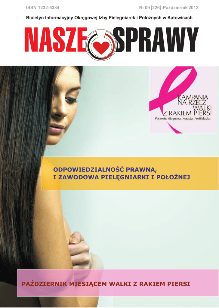 ISSN 1232-5384 Nr 09 [226] Październik 2012 Biuletyn Informacyjny Okręgowej Izby Pielęgniarek i Położnych w Katowicach NASZE SPRAWY ODPOWIEDZIALNOŚĆ PRAWNA, I ZAWODOWA PIELĘGNIARKI I POŁOŻNEJ PAŹDZIERNIK MIESIĄCEM WALKI Z RAKIEM PIERSI Kalendarium planowanych wydarzeń październik 2012 SPIS TREŚCI Kalendarium 2, 4 Z profilaktyą na ty 3 Wyciągi z protkołu posiedzeń ORPiP 5 Prawnik wyjaśnia 6 Polskie Pielęgniarki w Parlamencie Europejskim 7 Grypa 2012 8 Słów małych kilka o rzeczach wielkich Samokontrola piersi metodą tradycyjną tzw. kolistych ruchów Choroba nowotworow piersi Gra na czas 15 16 18 Amazonki w Jaworznie 23 Odpowiedzialność prawna a odpowiedzialność zawodowa pielęgniarki i położnej Zaangażowanie zasobów ludzkich w realizację zadań 24 10 26 Pielęgniarka w oddziałach rehabilitacji 28 Rola pielęgniarki w leczeniu bólu pooperacyjnego 30 Katolickie stowarzyszenie pielęgniarek i położnych polskich w katowicach 31 Zastosowanie implantów piersi pokrytych pianką poliuretanową 32 Kondolencje 34, 35 NASZE SPRAWY Wydawca: Okręgowa Izba Pielęgniarek i Położnych w Katowicach 40-027 Katowice, ul. Francuska 16 tel.: 32 209 04 15÷17, faks 32 209 19 26 Redaguje zespół w składzie: Małgorzata Maślanka - prowadząca Mariola Bartusek, Czesława Brylak-Kozdraś, Krystyna Cieślik, Dorota Kasińska, Barbara Kotlarz, Beata Ochocka, Paulina Reinhard, Bogusława Siciarz, Anna Stachulska, Iwona Woźniak. Reportaże, wywiady - Barbara Lemanik Realizacja poligraficzna: ZPW PLIK, 41-902 Bytom, ul. Siemianowicka 98 Nakład: 5500 egz. Redakcja zastrzega sobie prawo redagowania i skracania materiałów. Nie zamówionych materiałów nie zwraca. Redakcja nie zawsze podziela poglądy prezentowane w publikowanych materiałach. Autorzy proszeni są podawanie Redakcji wykazu wykorzystanych bibliografii. Autorzy proszeni są o podanie następujących danych: kontakt, nazwa zawodu, wykształcenie, pełniona funkcja w zakładzie pracy, nazwa zakładu pracy. Prosimy również o przysyłanie pocztą e-mail zdjęcia dowodowego w formacie pliku jpg (300 dpi). Zdjęcie na okładce z zasobów morgue File free photos Data wydania: 8 października 2012 2 Spotkanie Zespołu ds. Pielęgniarstwa Chirurgicznego. Siedziba Października OIPiP w Katowicach, godz. 15.00. 1 Spotkanie Zespołu ds. Pielęgniarstwa Kardiologicznego. Siedziba Października OIPiP w Katowicach, godz. 15.30. 2 3 Posiedzenie Okręgowej Rady PielęPaździernika gniarek i Położnych w Katowicach. Spotkanie Zespołu ds. Pielęgniarstwa Operacyjnego. Siedziba OIPiP Października w Katowicach, godz. 15.00. 3 V Ogólnopolska Konferencja Naukowo-Szkoleniowa „Rola personelu pielęgniarskiego i położnicze5 go w programie Szpital bez bólu Października w aspekcie monitorowania bólu i bezpieczeństwa”. Dom Lekarza w Katowicach. Spotkanie Kadry Zarządzającej w Pielęgniarstwie w Ośrodku Kształ5 cenia OIPiP w Łaziskach Górnych. Października Tematem spotkania będzie odpowiedzialność zawodowa i etyka w pracy pielęgniarki i położnej. Spotkanie pełnomocnych Przedstawicieli ORPiP. Siedziba OIPiP w Października Katowicach, godz. 10.00 i 12.00. 9 Spotkanie Zespołu ds. Pielęgniarstwa Diabetologicznego. Siedziba Października OIPiP w Katowicach, godz. 15.00. 9 10 Października Posiedzenie Komisji Kształcenia. II Ogólnopolska Konferencja Naukowo - Szkoleniowa nt. „Chirurgia małoinwazyjna - nowe wyzwania 11 w pracy pielęgniarek i położnych Października operacyjnych” organizowana przez Zespół ds. Pielęgniarstwa Operacyjnego. Ośrodek Kształcenia OIPiP w Łaziskach Górnych. 11 Października Posiedzenie Komisji Socjalnej. II Regionalna Konferencja Naukowo-Szkoleniowa na temat „Specyfika i różnorodność psychiatrii są17 dowej” organizowana przez Zespół Października ds. Pielęgniarstwa Psychiatrycznego. Ośrodek Kształcenia OIPiP w Łaziskach Górnych. Spotkanie Zespołu ds. Pielęgniarek Dializacyjnych. Siedziba OIPiP w Października Katowicach, godz. 15.00. 23 Z PROFILAKTYKĄ NA TY….. Kiedy przeglądam kolejne wnioski wpływające do komisji socjalnej,z przerażeniem uświadamiam sobie potęgę choroby, strasznej choroby, wyroku - nowotworu… Spośród wymienianych we wnioskach chorób najwięcej występuje właśnie nowotworów … Dziś, po dziesiątkach lat pracy słyszymy, że w pracy nie mamy czynników szkodliwych, że nasz sprzęt jest nowoczesny, najnowszej generacji i nie wywołuje skutków ubocznych… I być może ten funkcjonujący w ostatnich latach nie jest dla nas szkodliwy, ale ten funkcjonujących wiele lat wcześniej… stary, zdezelowany, używany bez pomiarów … A potem … rozpoznanie: nowotwór, leczenie, uporczywe dolegliwości jako skutki uboczne tegoż leczenia…. utrata włosów… odarcie z człowieczeństwa, kobiecości... odejście… smutek w oddziale… A my wciąż nie mamy czasu chorować, nie mamy czasu się leczyć, nie mamy czasu się nawet badać… aż w końcu dopada nas jedyna w swoim rodzaju sprawiedliwość na świecie - śmierć… czy tak być powinno ? NIE!! Dlatego póki możemy zadbajmy o siebie, namawiajmy i pilnujmy koleżanki, by chodziły na badania profilaktyczne, by żadna diagnoza i choroba nie były wyrokiem… Bo walkę z chorobą można wygrać – jeżeli się ją rozpocznie, odpowiednio wcześnie i z pełną świadomością, że można chorobę pokonać. Amazonki – super kobiety… bardziej kobiece niż my wszystkie razem… delikatne, wrażliwe, ale jednocześnie silniejsze od nas, niczego nie oczekujące, a raczej pragnące dawać.. Dawać siebie innym… Ceniące i celebrujące każdą wywalczoną chwilę życia. One wiedzą jak dbać o siebie i innych, nie pozwalają sobie na chwile słabości, bo wiedzą o niej tak wiele, bo tę słabość już przeszły, mają ją za sobą… I swoją postawą potrafią nam tak wiele przekazać: że trzeba o siebie zadbać, że można przejść trudną drogę i wyjść na 