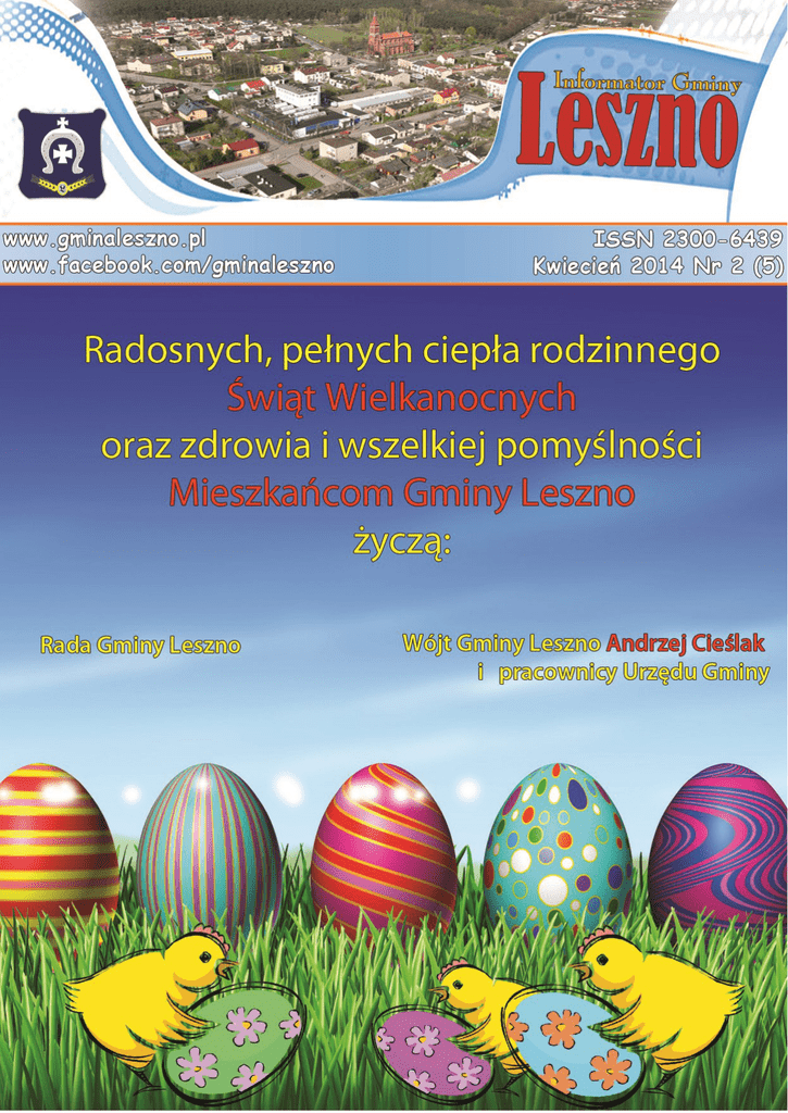 Gmina Leszno przystąpiła do Programu „Gmina dla Rodziny” W dniu 30 stycznia br. Rada Gminy Leszno podjęła Uchwałę Nr XLII/272/2014 w sprawie podjęcia działań zmierzających do polepszenia warunków życiowych Rodzin Wielodzietnych zamieszkałych na terenie Gminy Leszno. Przez Rodzinę Wielodzietną należy rozumieć rodzinę zamieszkującą na terenie Gminy Leszno (także rodzina zastępcza), składającą się z rodziców (jednego rodzica), mającą na utrzymaniu troje i więcej dzieci do 18 roku życia lub 24 roku życia, jeśli dziecko uczy się lub studiuje w trybie stacjonarnym. Podjęta uchwała ma na celu: a) zwiększenie członkom Rodziny Wielodzietnej dostępności do zajęć organizowanych przez: świetlice gminne, Zespół Sportowo Rekreacyjny w Lesznie, Centrum Kultury w Błoniu (kino) oraz Miejski Ośrodek Sportu i Rekreacji w Sochaczewie (pływalnia), b) umożliwienie członkom Rodziny Wielodzietnej korzystania z ulg w opłatach za gospodarowanie odpadami komunalnymi oraz w zakresie dostaw wody i odprowadzania ścieków, c) poprawę warunków materialnych i wzmocnienie kondycji Rodzin Wielodzietnych. Realizacja powyższych celów będzie odbywała się poprzez: a) umożliwienie członkom Rodziny Wielodzietnej dostępu do oferty kina w Ośrodku Kultury w Błoniu poprzez stosowanie 20% zniżki od obowiązującej ceny biletów, b) umożliwienie członkom Rodziny Wielodzietnej korzystania na preferencyjnych zasadach (20% zniżki od obowiązujących cen biletów z pływalni) Miejskiego Ośrodka Sportu i Rekreacji w Sochaczewie, c) umożliwienie dzieciom i młodzieży korzystania z zajęć organizowanych przez świetlice gminne, d) umożliwienie członkom Rodziny Wielodzietnej korzystania z zajęć organizowanych przez Zespół Sportowo Rekreacyjny w Lesznie, e) umożliwienie członkom Rodziny Wielodzietnej korzystania z ulgi w opłacie za gospodarowanie odpadami komunalnymi poprzez stosowanie 20% zniżki, f) umożliwienie członkom Rodziny Wielodzietnej korzystania z ulgi w opłacie w zakresie dostawy wody i odprowadzania ścieków poprzez stosowanie 20% zniżki. Rodzina, która chciałaby skorzystać z Programu „Gmina dla Rodziny” powinna złożyć wniosek o wydanie „Karty Rodziny 3+” potwierdzającej możliwość korzystania z powyższych uprawnień. Karta Rodziny 3+ jest kartą imienną, ważną z innym dokumentem ze zdjęciem potwierdzającym tożsamość i wydawana jest na wniosek rodzica bądź opiekuna prawnego. Formularz wniosku dostępny jest na stronie www.gminaleszno.pl lub w Urzędzie Gminy Leszno, pokój nr 7. W przypadku rodzin za- 2 stępczych do wniosku należy dołączyć kopię dokumentu potwierdzającego ustanowienie rodziny zastępczej dla małoletnich dzieci, natomiast w przypadku dzieci uczących się, powyżej 18 roku życia, do wniosku należy dołączyć dokument potwierdzający kontynuowanie nauki. Karta Rodziny 3+ wydawana jest na rok. Wypełniony wniosek należy złożyć w sekretariacie Urzędu Gminy Leszno, pokój nr 30 lub w Ośrodku Pomocy Społecznej w Lesznie, pokój Nr 7. Kartę odbiera osobiście przedstawiciel rodziny, a okres oczekiwania na jej wyrobienie wynosi do 15 dni od dnia złożenia wniosku. Regulamin przyznawania, wydawania i korzystania z Karty Rodziny 3+ dla rodzin wielodzietnych zamieszkałych na terenie Gminy Leszno dostępny jest w siedzibie OPS lub na stronie www.gminaleszno.pl Wszelkich dodatkowych informacji na temat Programu „Gmina dla rodziny” udziela pracownik Ośrodka Pomocy Społecznej w Lesznie, pokój nr 7, tel. 22 725 80 05 wew. 122. UG Leszno „Można żyć inaczej...!” Ośrodek Pomocy Społecznej w Lesznie informuje, że rozpoczyna nabór do udziału w VII edycji projektu systemowego pod nazwą „Można żyć inaczej – aktywna integracja społeczna w Gminie Leszno”. Projekt jest współfinansowany ze środków Unii Europejskiej, w ramach Europejskiego Funduszu Społecznego Programu Operacyjnego Kapitał Ludzki, Priorytet VII Promocja integracji społecznej, Działanie 7.1, Podziałanie 7.1.1 Rozwój i upowszechnianie aktywnej integracji przez ośrodki pomocy społecznej. Uczestnikiem projektu może być osoba spełniająca następujące warunki: 1. jest mieszkańcem gminy Leszno 2. jest osobą niepełnosprawną 3. jest osobą uczącą się 4. jest osobą bezrobotną 5. jest osobą w wieku aktywności zawodowej 6. nie brała wcześniej udziału w projektach systemowych. W ramach projektu zapewniamy: 1. kursy zawodowe m.in. kurs komputerowy, obsługi biurowej 2. spotkania grupowe i indywidualne z psychologiem 3. spotkania grupowe i indywidualne z doradcą zawodowym 4. zmianę wizerunku 5. wyjazd do kina i teatru 6. wsparcie finansowe 7. catering i serwis kawowy podczas zajęć 8. materiały szkoleniowe. Okres realizacji projektu: 1.09. — 31.12.2014r. Udział w projekcie jest bezpłatny. Do projektu zostanie zakwalifikowanych 11 osób. Szczegółowe informacje można uzyskać w Ośrodku Pomocy Społecznej w Lesznie, Aleja Wojska Polskiego 21, pokój nr 15, tel. 22/7258155 Informator Gminy Leszno nr 2(5) Kierownik Ośrodka Pomocy Społecznej w Lesznie Mirosława Dziadkiewicz Gmina Leszno z lotu ptaka Zapraszamy Państwa do obejrzenia najnowszych zdjęć lotniczych prezentujących uroki naszej gminy, które znajdują się na stronie www.gminaleszno.pl. Zdjęcia zostały wykonane 29 marca br., przy sprzyjającej pogodzie. Plan pierwszego lotu obejmował część zachodnią naszej gminy. Pozostałe fotografie dostępne będą w najbliższym możliwym terminie. Fot. Marianów od strony wschodniej Wójt Gminy Leszno ogłasza trzeci przetarg ustny nieograniczony na sprzedaż nieruchomości stanowiącej własność Gminy Leszno Fot. Jezioro Tomczyn Fot. Centrum Leszna Fot. Leszno od strony południowej Nieruchomość gruntowa niezabudowana (położona: województwo mazowieckie, powiat warszawski zachodni, gmina Leszno) w obrębie Leszno PGR, oznaczona jako działka ew. nr 7/17 o pow. 22 378 