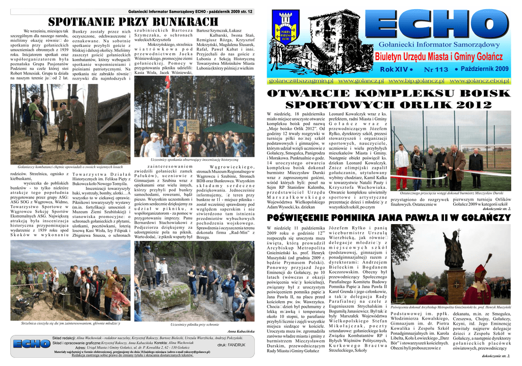 We wrześniu, miesiącu tak szczególnym dla naszego narodu, mieliśmy okazję również do spotkania przy gołanieckich umocnieniach obronnych z 1939 roku. Inicjatorem spotkań oraz współorganizatorem była poznańska Grupa Pasjonatów Podziemi na czele której stoi Robert Menesiak. Grupa ta działa na naszym terenie już od 2 lat. Bunkry zostały przez nich oczyszczone, odchwaszczone i oznakowane. Na sobotnie spotkanie przybyli goście z bliskiej i dalszej okolicy. Mieliśmy zaszczyt gościć gołanieckich kombatantów, którzy wzbogacili spotkanie wspomnieniami i pieśniami patriotycznymi. Na spotkaniu nie zabrakło również rozrywki dla najmłodszych i szubinieckich Bartosza Szymczaka, o schronach wałeckich Krzysztofa Mokrzyńskiego, strzelnica w i a t r ó w k o w a p o d przewodnictwem Jacka Wiśniewskiego, promocyjne ziemi gołanieckiej. Pomocy w przygotowaniu pikniku udzielili: Kasia Wisła, Jacek Wiśniewski, Bartosz Szymczak, Łukasz Kalbarski, Iwona Stań, Remigiusz Rózga, Krzysztof Mokrzyński, Magdalena Ślusarek, Rafał, Paweł Kabat i inni. Przyjechali do nas goście z Lubonia z Sekcją Historyczną Towarzystwa Miłośników Miasta Lubonia (którzy później z wielkim Uczestnicy spotkania obserwujący inscenizację historyczną Gołanieccy kombatanci chętnie opowiadali o swoich wojennych losach rodziców. Strzelnica, ognisko z kiełbaskami, wycieczka do pobliskich bunkrów - to tylko niektóre atrakcje tego popołudnia przygotowane przez grupy ASG: ASG SOG z Wągrowca, Widmo, To w a r z y s t w o S p o r t o w e w Wągrowcu Sekcję Sportów Ekstremalnych ASG. Największą atrakcją była inscenizacja historyczna przypominająca wydarzenie z 1939 roku spod Skoków w wykonaniu To w a r z y s t w a D z i a ł a ń Historycznych im. Feliksa Pięty z Bukowca koło Nowego Tomyśla. Inscenizacji towarzyszyły huki, wystrzały, bomby, ulotki… A wszystko to w ciekawej oprawie. Piknikowi towarzyszyły wystawy (m.in. fortyfikacji umocnień z Muzeum Ziemi Szubińskiej) i stanowiska promocyjne: o schronach gołanieckich z płytami, ulotkami, pocztówkami, loterią losową Kasi Wisła, Izy Filipiak i Zbigniewa Snusza, o schronach zainteresowaniem zwiedzili gołaniecki zamek Pałuków), uczniowie z Gimnazjum z Szubina wraz z opiekunami oraz wielu innych, którzy przybyli pod bunkry samochodami, rowerami, bądź pieszo. Wszystkim uczestnikom i gościom serdecznie dziękujemy za udział w pikniku, a współorganizatorom - za pomoc w przygotowaniu imprezy. Panu Bernardowi Stachowiakowi z Podjeziorza dziękujemy za udostępnienie pola na piknik. Warto dodać, że piknik wsparty był Strzelnica cieszyła się dużym zainteresowaniem, głównie młodzieży Wągrowieckiego, stronach Muzeum Regionalnego w Wągrowcu i Szubinie, Stronach BDB oraz Bunkrowca. Wszystkim składamy serdeczne podziękowania. Jednocześnie informujemy, że teren przy bunkrze nr 11 - miejsce pikniku został wcześniej sprawdzony pod względem saperskim i nie stwierdzono tam istnienia przedmiotów wybuchowych pochodzenia wojskowego. Sprawdzenia i oczyszczenia terenu dokonała firma „Rad-Min” z Brzegu. Uczestnicy pikniku przy schronie Anna Kabacińska Skład redakcji: Alina Wachowiak - redaktor naczelny, Krzysztof Rakoczy, Bartosz Bielecki, Urszula Wierzbicka, Andrzej Połczyński. Skład i opracowanie graficzne:Krzysztof Rakoczy, Anna Kabacińska Korekta: Alina Wachowiak Adres: Urząd Miasta i Gminy Gołańcz, ul. dr. P. Kowalika 2, 62 - 130 Gołańcz . Redakcja zastrzega sobie prawo do zmiany tytułu i skracania dostarczanych tekstów. Gołaniecki Informator Samorządowy Biuletyn Urzędu Miasta i Gminy Gołańcz Rok XIV 113 Październik 2009 W niedzielę, 18 października miało miejsce uroczyste otwarcie kompleksu boisk pod nazwą „Moje boisko Orlik 2012”. Od godziny 12 trwały rozgrywki w turnieju piłki nożnej szkół podstawowych i gimnazjów, w którym udział wzięli uczniowie z Gołańczy, Smogulca, Panigrodza i Morakowa. Punktualnie o godz. 14 uroczystego otwarcia kompleksu boisk dokonał burmistrz Mieczysław Durski wraz z zaproszonymi gośćmi, wśród których byli: poseł na Sejm RP Stanisław Kalemba, przedstawiciel Urzędu Marszałkowskiego Województwa Wielkopolskiego Adam Wysocki, ks. dziekan Leonard Kowalczyk wraz z ks. prefektem, radni Miasta i Gminy G o ł a ń c z w r a z z przewodniczącym Józefem Ryłko, dyrektorzy szkół, prezesi stowarzyszeń i organizacji sportowych, nauczyciele, uczniowie i wielu przybyłych mieszkańców Miasta i Gminy. Następnie obiekt poświęcił ks. dziekan Leonard Kowalczyk. Znicz olimpijski zapalił gołańczanin, utytułowany wybitny chodziarz, Kamil Kalka w towarzystwie Natalii Pauty i K r z y s z t o f a Wa c h o w i a k a . Otwarcie kompleksu uświetniły Ostatecznego przecięcia wstęgi dokonał burmistrz Mieczysław Durski sportowe i artystyczne przystąpiono do rozgrywek pierwszym turnieju Orlików prezentacje dzieci i młodzieży z Gołańcz 2009 w kategorii szkół finałowych. Ostatecznie w wszystkich szkół, po czym dokończenie str. 2. W niedzielę 11 października 2009 roku o godzinie 12 00 rozpoczęła się uroczysta msza święta, którą prowadził Arcybiskup Metropolita Gnieźnieński ks. prof. Henryk Muszyński (od grudnia 2009 r. będzie Prymasem Polski). Ponowny przyjazd Jego Eminencji do Gołańczy, po 10 latach (wówczas z okazji poświęcenia wieży kościelnej), związany był z uroczystym poświęceniem pomnika papieża Jana Pawła II, na placu przed kościołem pw. św. Wawrzyńca. Chociaż dzień był pochmurny z lekką mżawką i temperaturą około 10 stopni, to parafianie przybyli licznie i zajęli wszystkie miejsca siedzące w kościele. Uroczysta msza św. zgromadziła zarówno władze miasta i gminy z burmistrzem Mieczysławem Durskim, przewodniczącym Rady Miasta i Gminy Gołańcz J ó z e f e m Ry ł k o i p a n i ą wiceburmistrz Urszulą Wi e r z b i c k ą , j a k r ó w n i e ż delegacje młodzieży z miejscowych