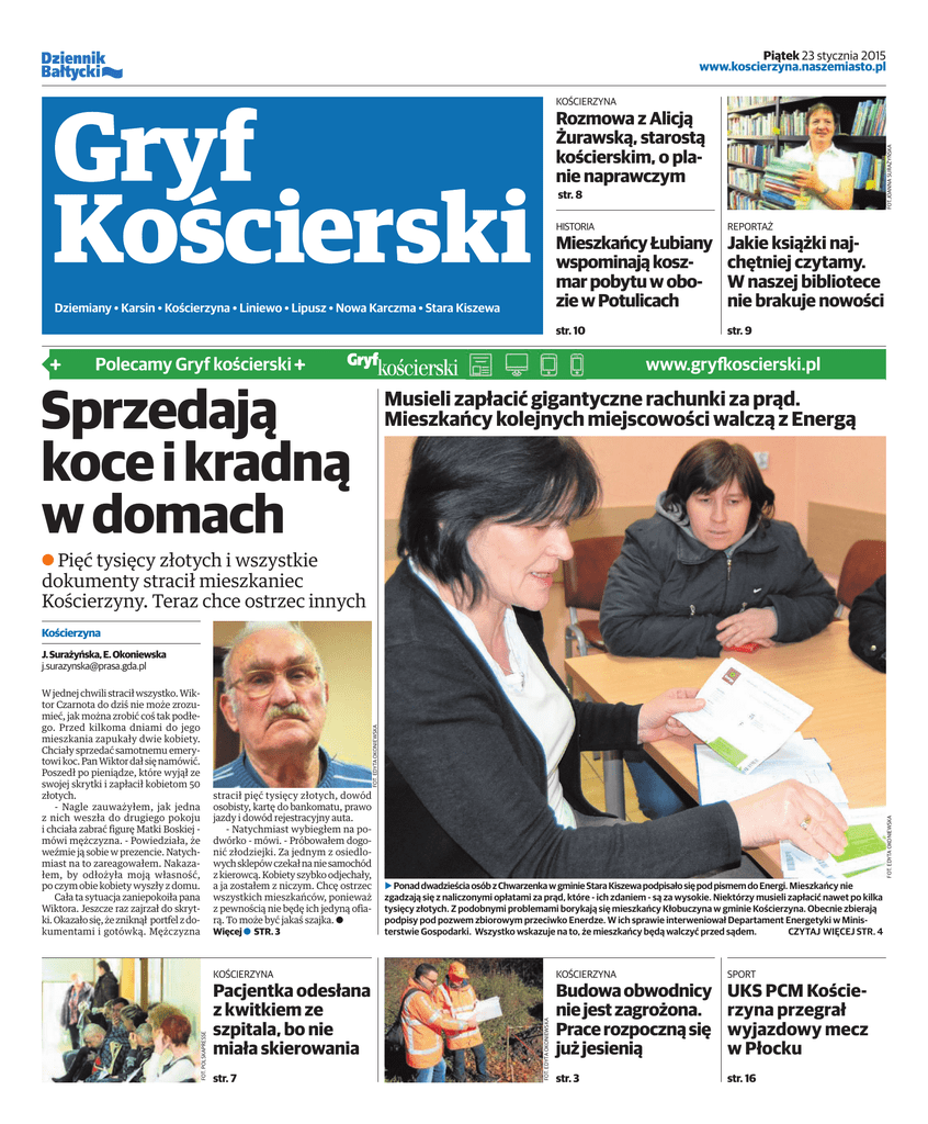 Piątek 23 stycznia 2015 www.koscierzyna.naszemiasto.pl KOŚCIERZYNA FOT.JOANNA SURAŻYŃSKA Rozmowa z Alicją Żurawską, starostą kościerskim, o planie naprawczym str. 8 Dziemiany • Karsin • Kościerzyna • Liniewo • Lipusz • Nowa Karczma • Stara Kiszewa HISTORIA REPORTAŻ Mieszkańcy Łubiany wspominają koszmar pobytu w obozie w Potulicach Jakie książki najchętniej czytamy. W naszej bibliotece nie brakuje nowości str. 10 str. 9 Polecamy Gryf kościerski www.grykoscierski.pl Sprzedają koce i kradną w domach Musieli zapłacić gigantyczne rachunki za prąd. Mieszkańcy kolejnych miejscowości walczą z Energą A Pięć tysięcy złotych i wszystkie dokumenty stracił mieszkaniec Kościerzyny. Teraz chce ostrzec innych Kościerzyna J. Surażyńska, E. Okoniewska [email protected] b Ponad dwadzieścia osób z Chwarzenka w gminie Stara Kiszewa podpisało się pod pismem do Energi. Mieszkańcy nie zgadzają się z naliczonymi opłatami za prąd, które - ich zdaniem - są za wysokie. Niektórzy musieli zapłacić nawet po kilka tysięcy złotych. Z podobnymi problemami borykają się mieszkańcy Kłobuczyna w gminie Kościerzyna. Obecnie zbierają podpisy pod pozwem zbiorowym przeciwko Enerdze. W ich sprawie interweniował Departament Energetyki w Ministerstwie Gospodarki. Wszystko wskazuje na to, że mieszkańcy będą walczyć przed sądem. CZYTAJ WIĘCEJ STR. 4 KOŚCIERZYNA KOŚCIERZYNA SPORT Pacjentka odesłana z kwitkiem ze szpitala, bo nie miała skierowania Budowa obwodnicy nie jest zagrożona. Prace rozpoczną się już jesienią UKS PCM Kościerzyna przegrał wyjazdowy mecz w Płocku str. 3 str. 16 str. 7 FOT. EDYTA OKONIEWSKA FOT. POLSKAPRESSE stracił pięć tysięcy złotych, dowód osobisty, kartę do bankomatu, prawo jazdy i dowód rejestracyjny auta. - Natychmiast wybiegłem na podwórko - mówi. - Próbowałem dogonić złodziejki. Za jednym z osiedlowych sklepów czekał na nie samochód z kierowcą. Kobiety szybko odjechały, a ja zostałem z niczym. Chcę ostrzec wszystkich mieszkańców, ponieważ z pewnością nie będę ich jedyną ofiarą. To może być jakaś szajka. A Więcej a STR. 3 FOT. EDYTA OKONIEWSKA FOT. EDYTA OKONIEWSKA W jednej chwili stracił wszystko. Wiktor Czarnota do dziś nie może zrozumieć, jak można zrobić coś tak podłego. Przed kilkoma dniami do jego mieszkania zapukały dwie kobiety. Chciały sprzedać samotnemu emerytowi koc. Pan Wiktor dał się namówić. Poszedł po pieniądze, które wyjął ze swojej skrytki i zapłacił kobietom 50 złotych. - Nagle zauważyłem, jak jedna z nich weszła do drugiego pokoju i chciała zabrać figurę Matki Boskiej mówi mężczyzna. - Powiedziała, że weźmie ją sobie w prezencie. Natychmiast na to zareagowałem. Nakazałem, by odłożyła moją własność, po czym obie kobiety wyszły z domu. Cała ta sytuacja zaniepokoiła pana Wiktora. Jeszcze raz zajrzał do skrytki. Okazało się, że zniknął portfel z dokumentami i gotówką. Mężczyzna 02//tygodnik 27 Od redaktora Joanna SurażyńskaBączkowska stycznia upływa termin składania wniosków o przyznanie Medalu im. Matki Teresy z Kalkuty. Wszyscy zainteresowani mogą je kierować do Powiatowego Centrum Pomocy Rodzinie w Kościerzynie. Warto wspomnieć, że będzie to już XII edycja przyznania wspomnianych medali. Przypomnijmy, że Medal im. Matki Teresy z Kalkuty jest nagrodą przyznawaną dla osób oraz instytucji, a także organizacji, które działają na rzecz osób niepełnosprawnych z terenu powiatu kościerskiego. Medale są przyznawane w trzech kategoriach. (WM) Z przymrużeniem oka Kanapa, książka, kocyk... asada znanej aktorki Agaty Kuleszy trzy razy K - kanapa, książka, kocyk sprawdza się w przypadku innych kobiet. Taki wieczór, kiedy czytana historia całkowicie nas pochłania, tracimy poczucie czasu, zapominamy o całym świecie, to prawdziwy, bezcenny relaks. Wisława Szymborska miała rację mówiąc, że czytanie książek to najpiękniejsza zabawa, jaką sobie ludzkość wymyśliła. Czytanie rozwija wyobraźnię, uczy myślenia, poprawia pamięć, zwiększa zdolność koncentracji, zmusza mózg do aktywności, relaksuje, wycisza, obniża poziom stresu. Jednym słowem mnóstwo korzyści. Pytanie tylko, co czytać? W końcu, jak pisał Charles Dickens, są książki, których grzbiety i okładki stanowią najlepszą ich część. Trudno wymagać, by ktoś, kto nie czyta książek, rozpoczął tę przygodę np. od “Ulissesa” Jamesa Joyce’a. Być może najlepsze są najprostsze rozwiązania, więc czytajmy po prostu to, co nas naprawdę interesuje. W końcu niewiele rzeczy ma na człowieka tak wielki wpływ jak pierwsza książka, która od razu trafia do jego serca. Niestety, bywa też inaczej. Czasami nieodpowiednią książką możemy zniechęcić do czytania i narobić więcej szkód niż pożytku. Wędrówka przez literackie pozycje nie zawsze jest łatwa. Zatem książki, tak jak ludzi, z którymi się przyjaźnimy, trzeba odpowiednio dobierać. O tym, jakie książki najchętniej czytają mieszkańcy pow. kościerskiego, piszemy w tygodniku na s. 9. Jak zawsze polecam także nowy numer Gryfa Kościerskiego+, a w nim m.in. wideo na temat problemów mieszkańców z Energą oraz sukcesu popularnej Budowlanki w rankingu szkół. Na www. gryfkoscierski.pl dowiesz się sporo na temat grypy i kuchni, która zimą nas rozgrzeje. a Gryf Kościerski Piątek, 23 stycznia 2015 DRUGA STRONA FOT. UG LINIEWO Z Młodzi prezentują swój talent FOT. MACIEJ WAJER W sali widowiskowej w Liniewie odbył się koncert pod tytułem “Gramy, śpiewamy i tańczymy dla mamy i taty”. Dzieci i młodzież miały okazję do zaprezentowania swoich talentów wokalnych i tanecznych. Rodzice byli bardzo zadowoleni i jednocześnie dumni z występu swoich pociech. (WM) b A co panie tutaj sobie przeglądają na komputerze - zdaje się pytać radny Tomasz Dargacz przewodniczącą Rady Miasta Teresę Preis i Helenę Kaszubows