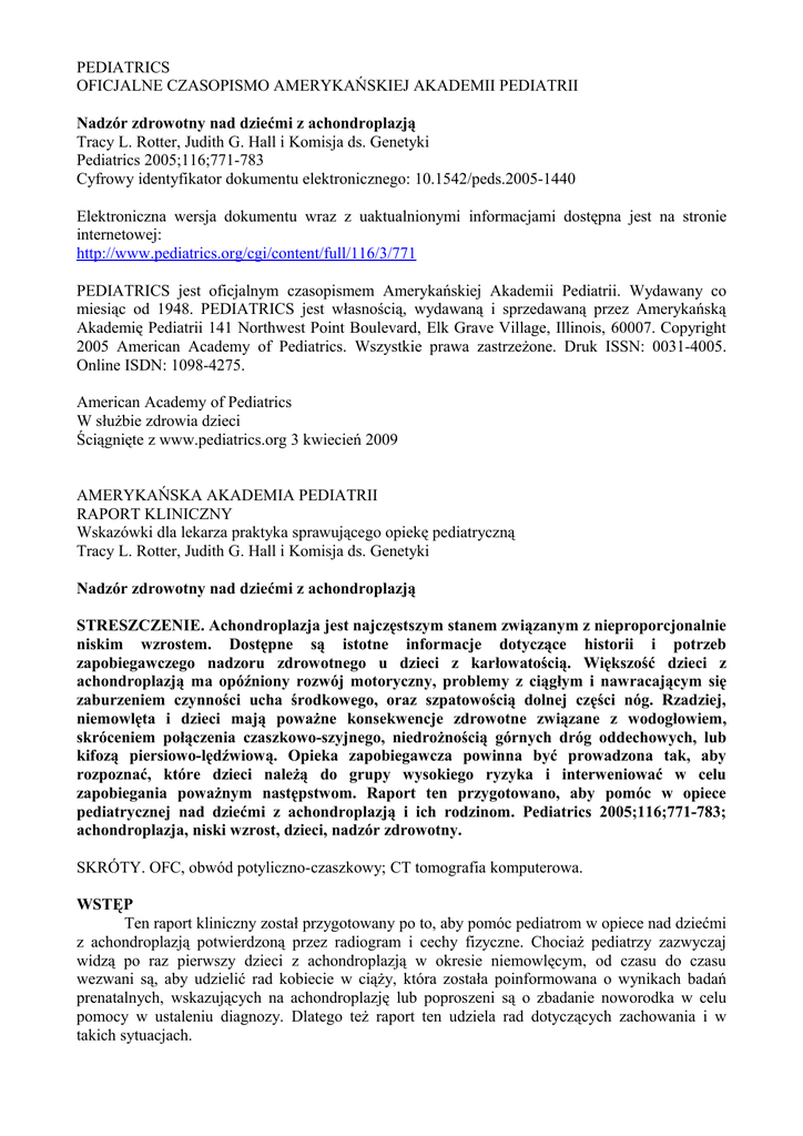 PEDIATRICS OFICJALNE CZASOPISMO AMERYKAŃSKIEJ AKADEMII PEDIATRII Nadzór zdrowotny nad dziećmi z achondroplazją Tracy L. Rotter, Judith G. Hall i Komisja ds. Genetyki Pediatrics 2005;116;771-783 Cyfrowy identyfikator dokumentu elektronicznego: 10.1542/peds.2005-1440 Elektroniczna wersja dokumentu wraz z uaktualnionymi informacjami dostępna jest na stronie internetowej: http://www.pediatrics.org/cgi/content/full/116/3/771 PEDIATRICS jest oficjalnym czasopismem Amerykańskiej Akademii Pediatrii. Wydawany co miesiąc od 1948. PEDIATRICS jest własnością, wydawaną i sprzedawaną przez Amerykańską Akademię Pediatrii 141 Northwest Point Boulevard, Elk Grave Village, Illinois, 60007. Copyright 2005 American Academy of Pediatrics. Wszystkie prawa zastrzeżone. Druk ISSN: 0031-4005. Online ISDN: 1098-4275. American Academy of Pediatrics W służbie zdrowia dzieci Ściągnięte z www.pediatrics.org 3 kwiecień 2009 AMERYKAŃSKA AKADEMIA PEDIATRII RAPORT KLINICZNY Wskazówki dla lekarza praktyka sprawującego opiekę pediatryczną Tracy L. Rotter, Judith G. Hall i Komisja ds. Genetyki Nadzór zdrowotny nad dziećmi z achondroplazją STRESZCZENIE. Achondroplazja jest najczęstszym stanem związanym z nieproporcjonalnie niskim wzrostem. Dostępne są istotne informacje dotyczące historii i potrzeb zapobiegawczego nadzoru zdrowotnego u dzieci z karłowatością. Większość dzieci z achondroplazją ma opóźniony rozwój motoryczny, problemy z ciągłym i nawracającym się zaburzeniem czynności ucha środkowego, oraz szpatowością dolnej części nóg. Rzadziej, niemowlęta i dzieci mają poważne konsekwencje zdrowotne związane z wodogłowiem, skróceniem połączenia czaszkowo-szyjnego, niedrożnością górnych dróg oddechowych, lub kifozą piersiowo-lędźwiową. Opieka zapobiegawcza powinna być prowadzona tak, aby rozpoznać, które dzieci należą do grupy wysokiego ryzyka i interweniować w celu zapobiegania poważnym następstwom. Raport ten przygotowano, aby pomóc w opiece pediatrycznej nad dziećmi z achondroplazją i ich rodzinom. Pediatrics 2005;116;771-783; achondroplazja, niski wzrost, dzieci, nadzór zdrowotny. SKRÓTY. OFC, obwód potyliczno-czaszkowy; CT tomografia komputerowa. WSTĘP Ten raport kliniczny został przygotowany po to, aby pomóc pediatrom w opiece nad dziećmi z achondroplazją potwierdzoną przez radiogram i cechy fizyczne. Chociaż pediatrzy zazwyczaj widzą po raz pierwszy dzieci z achondroplazją w okresie niemowlęcym, od czasu do czasu wezwani są, aby udzielić rad kobiecie w ciąży, która została poinformowana o wynikach badań prenatalnych, wskazujących na achondroplazję lub poproszeni są o zbadanie noworodka w celu pomocy w ustaleniu diagnozy. Dlatego też raport ten udziela rad dotyczących zachowania i w takich sytuacjach. Istotne nowe informacje pojawiły się od publikacji pierwszego zalecenia odnośnie nadzoru zdrowotnego dla dzieci z achondroplazja.1 W szczególności, wiele nowych informacji ukazało się na temat genetyki cząsteczkowej schorzenia.2 Dodatkowo, pojawiło się pełniejsze zrozumienie tego w jaki sposób można zminimalizować lub uniknąć pewnych poważnych komplikacji.3 Te nowe informacje są zawarte w tym raporcie, który zmienia pierwsze zalecenie. Achondroplazja jest najczęstszym stanem związanym z nieproporcjonalnie niskim wzrostem w dużym stopniu.4 Diagnozy można zazwyczaj dokonać na podstawie cech klinicznych i bardzo specyficznych cech radiogramu, który zawiera zmniejszoną podstawę czaszki, kwadratowy kształt miednicy z małym wcięciem kulszowym, krótkie wyrostki kręgowe, skrócenie (bliższe) długich kości dotyczące proksymalnych części kończyn, trzy palce dłoni równej długości, normalnej długości tułów, częściowa przepuszczalność dla promieni rentgenowskich w bliższej udowej części kończyny i (do połowy dzieciństwa) charakterystyczny kształt w jodełkę dalszej udowej nasady kości długiej. Inne bliskie karłowatości choroby takie jak hipochondroplazja i dysplazja tanatoforyczna stanowią część oddzielnej diagnozy, ale achondroplazja może być zazwyczaj łatwo odróżniona od nich, ponieważ zmiany przy hipchondroplazji są łagodniejsze, a zmiany w dysplazji tanatoforycznej są bardziej poważne i niezmiennie latalne. Achondroplazja jest schorzeniem autosomalnym dominującym, ale w około 75% przypadków wykazuje nowe dominujące mutacje. Achondroplazja jest spowodowana przez mutację w genie, który koduje czynnik wzrostu fibroblastu receptora rodzaju 3 (FGFR3).5-7 Ponieważ prawie wszystkie przyczynowe mutacje zachodzą w dokładnie tym samym miejscu genu7, badanie molekularne daje jasność diagnozy. Nie jest konieczne, aby poddać badaniom cząsteczkowym każde dziecko w diagnozą kliniczną achondroplazji. Jednakże badanie FGFR3 powinno być przeprowadzone u dzieci, które mają w jakikolwiek sposób nietypowe oznaki lub w przypadkach, gdy odróżnienie od podobnych schorzeń, takich jak hipochondroplazja, nie jest pewne. Dzieci takie powinny być skierowane na badania genetyki klinicznej. Posiadamy już dużą wiedzę na temat historii achondroplazji, którą możemy przekazać rodzicom. 3,8 Przeciętny wzrost dorosłego człowieka z achondroplazją to około 4 stopy dla mężczyzny i kobiet (rysunek 1 i 2).9 Najczęstszym powikłaniem pojawiającym się w dorosłym życiu jest zwężenie światła kanału kręgowego w odcinku piersiowo-lędźwiowym z uciskiem na rdzeń kręgowy i korzenie nerwowe.10,11 Jest to najczęściej leczone przez chirurgiczne odciążenie, o ile jest to zdiagnozowane wcześnie. Większość dzieci z achondroplazją radzi sobie dobrze. Jednakże dzieci cierpiące na achondroplazję zazwyczaj mają opóźniony rozwój motoryczny (rys. 3),12,13 zapalenie ucha środkowego, i szpatawość dolnej części nóg.14 Rzadziej niemowlęta i dzieci mogą mieć poważne konsekwencje zdrowotne związane z wodogłowiem, skróceniem połącze