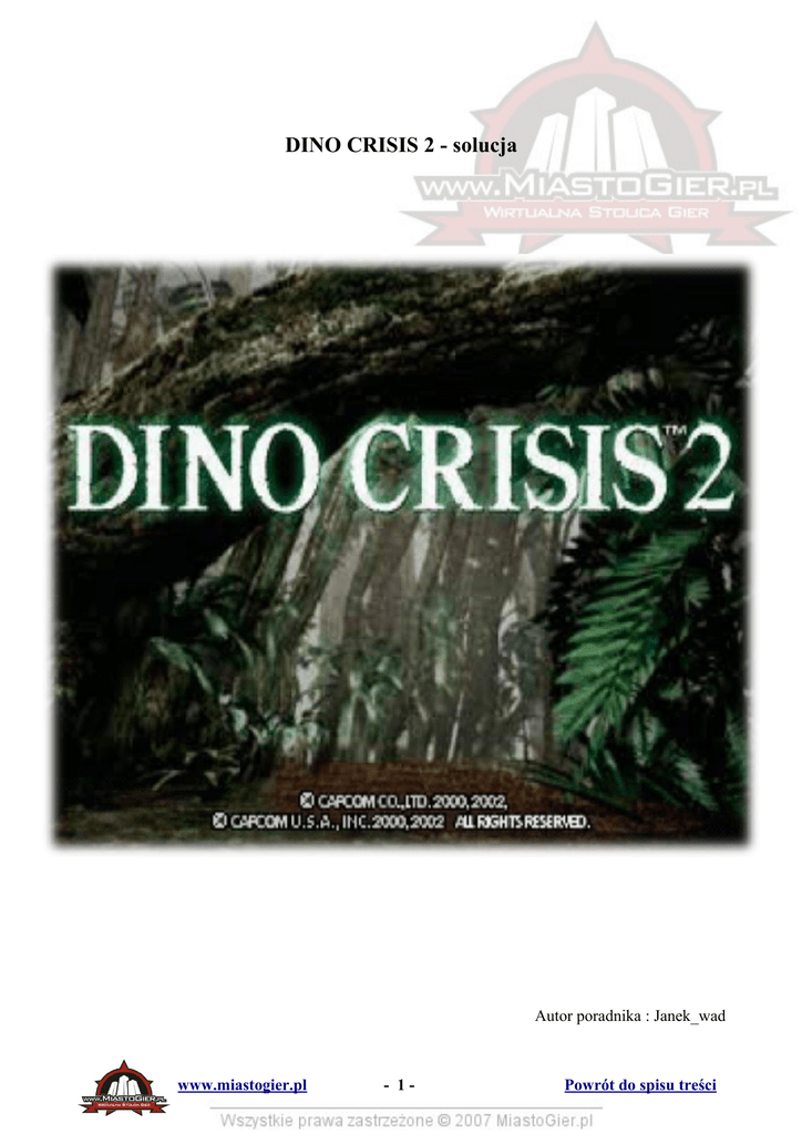 DINO CRISIS 2 - solucja Autor poradnika : Janek_wad www.miastogier.pl - 1- Powrót do spisu treści 1. Bohaterowie.................................................................................................................................3 2. Bronie 2.1. Dylan – main weapons......................................................................................................... 4 2.2. Dylan – sub weapons............................................................................................................5 2.3. Regina – main weapons........................................................................................................6 2.4. Regina – sub weapons.......................................................................................................... 7 2.5. Sub weapons (pozostałe)...................................................................................................... 8 3. Medykamenty............................................................................................................................. 9 4. Przydatne dodatki.................................................................................................................... 10 5. Rozdział I : Dylan – pierwsza wyprawa wgłąb dżungli...................................................... 11 6. Rozdział II : Dylan – Military Facility................................................................................... 14 7. Rozdział III : Regina – na ratunek Dylanowi........................................................................ 16 8. Rozdział IV : Dylan – w poszukiwaniu silnika...................................................................... 18 9. Rozdział V : Regina - 3rd Energy Facility oraz Underwater............................................... 21 10. Rozdział VI : Dylan – droga do Edward City.......................................................................... 24 11. Rozdział VII : Dylan – Edward City.......................................................................................25 12. Rozdział VIII : Regina – Missile Silo....................................................................................... 27 13. Rozdział IX : Dylan – koniec historii........................................................................................ 28 14. Bonusy......................................................................................................................................... 29 www.miastogier.pl - 2- Powrót do spisu treści Dylan Żołnierz TRATu. Niewielką zwrotność i szybkość nadrabia siłą oraz potężnymi pukawkami, którymi potrafi świetnie się posługiwać. W swoim arsenale posiada również maczetę, niezbędną do usuwania zarośli porastających niektóre drzwi. Regina Znana już doskonale z pierwszej części gry. Członkini oddziału S.O.R.T.. Szybka i zwinna, chociaż w końcowych etapach gry nie dysponuje tak silnymi broniami, jak jej towarzysz z TRATu – Dylan. David Przyjaciel Dylana. Chociaż spotykamy go tylko kilkakrotnie, zazwyczaj w tych najbardziej odpowiednich momentach. Trzykrotnie ratuje Reginę i Dylana z niemałych opresji. Znakomicie pilotuje helikopter. www.miastogier.pl - 3- Powrót do spisu treści Shotgun Podstawowa broń Dylana. Skuteczna tylko na słabsze gady, pokroju Velocilaptorów. Znakomicie sprawdza się w walce na krótkim dystansie, kiedy to dobrze wymierzonym strzałem potrafi odrzucić dwóch przeciwników na raz. Solid Cannon Niszczy cele siłą wibracji. Wytwarzane pole energetyczne razi wroga przez kilka sekund. Broń dosyć mocna i przydatna w początkowych etapach rozgrywki. Niestety, nie możemy atakować kilku gadów jednocześnie, przez co otaczające nas z kilku stron dinozaury osiągają przewagę. Flame Launcher Spory zasięg, okupiony niską siłą ataku. Zaskakująco dobrze sprawdza się w licznych potyczkach z Allozaurami. Antitank Rifle Potężna broń przeciwpancerna. Bardzo duża siła ataku i spory zasięg czynią z Antitank Rifle zdecydowanie najefektywniejszą pukawkę w grze. Nieskuteczna tylko w starciach z T-Rexem i Gigantozaurem, których – jak się przekonacie - nie da się zabić w konwencjonalny sposób. Rocket Launcher Najmocniejsza broń Dylana. Niestety, w parz z ogromną siłą ataku nie idą: szybkość oraz zasięg. Ze względu na swą wagę i gabaryty, nie umożliwia prowadzenia ciągłego ostrzału. www.miastogier.pl - 4- Powrót do spisu treści Machete Pokaźnych rozmiarów nóż, używany głównie do ścinania blokujących drogę pnączy. Machete Improved Ulepszona maczeta. Kompletnie nieopłacalna inwestycja. Tym bardziej, że tego typu sprzętu używamy tylko i wyłącznie do ścinania blokujących drzwi pnączy. Chociaż zawsze możemy wyskoczyć na takiego Allozaura z bronią białą w ręku ... www.miastogier.pl - 5- Powrót do spisu treści Hand Gun Jedna z najsłabszych broni w grze. Przydatna tylko i wyłącznie w czasie pierwszej wyprawy Reginy wgłąb dżungli. W miarę skuteczna tylko i wyłącznie na Velocilaptory, a i te padają dopiero po kilku celnych strzałach. Flame Launcher Warto kupić jeszcze przed pierwszą wizytą w lokacji zanieczyszczonej przez trujące rośliny. Znajdziemy ją w ekwipunku zarówno Reginy, jak i Dylana. Jak już wcześniej pisałem, skuteczna w starciach z Allozaurami. Submachine Gun Dwa szybkostrzelne karabinki. Ich największa wada to bardzo mała siła ataku, choć po zwiększeniu pojemności magazynka strzela się tym czymś bardzo przyjemnie. Heavy Machine Gun Zdecydowanie najlepsza broń Reginy. Niezła siła rażenia oraz ogromna szybkość wypluwanych z lufy pocisków sprawiają, że atakujące dinozaury padają jak kaczki. Szczególnie skuteczna w starciach z Plezjozaurami oraz Velocilaptorami. Missile Pod Bardzo duża siła ataku i ogromny zasięg sprawiają, że jest to najpotężniejsza broń w całej grze. Odpowiednik wyrzutni rakiet Dylana. Missile Pod wystrze