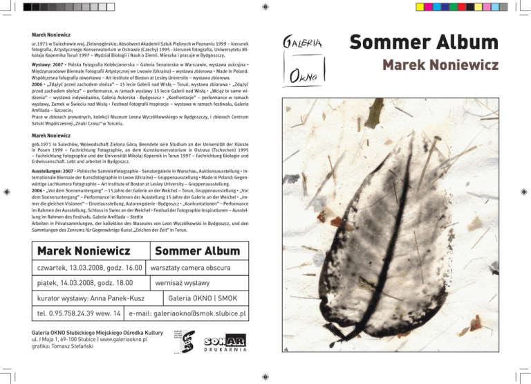 Marek Noniewicz ur.1971 w Sulechowie woj. Zielonogórskie; Absolwent Akademii Sztuk Pięknych w Poznaniu 1999 – kierunek fotografia, Artystycznego Konserwatorium w Ostrawie (Czechy) 1995 - kierunek fotografia, Uniwersytetu Mikołaja Kopernika Toruń 1997 – Wydział Biologii i Nauk o Ziemii. Mieszka i pracuje w Bydgoszczy. Wystawy: 2007 · Polska Fotografia Kolekcjonerska – Galeria Senatorska w Warszawie, wystawa aukcyjna · Międzynarodowe Biennale Fotografii Artystycznej we Lwowie (Ukraina) – wystawa zbiorowa · Made In Poland: Współczesna fofografia otworkowa – Art Institute of Boston at Lesley University – wystawa zbiorowa. 2006 · „Zdążyć przed zachodem słońca” – 15 lecie Galerii nad Wisłą – Toruń, wystawa zbiorowa · „Zdążyć przed zachodem słońca” – performance, w ramach wystawy 15 lecie Galerii nad Wisłą · „Wciąż te same widzenia” – wystawa indywidualna, Galeria Autorska - Bydgoszcz · „Konfrontacje” – performance w ramach wystawy, Zamek w Świeciu nad Wisłą · Festiwal Fotografii Inspiracje – wystawa w ramach festiwalu, Galeria Amfilada – Szczecin; Prace w zbiorach prywatnych, kolekcji Muzeum Leona Wyczółkowskiego w Bydgoszczy, i zbiorach Centrum Sztuki Współczesnej „Znaki Czasu” w Toruniu. Marek Noniewicz geb.1971 in Sulechów, Woiwodschaft Zielona Góra; Beendete sein Studium an der Universität der Künste in Posen 1999 – Fachrichtung Fotographie, an dem Kunstkonservatorium in Ostrava (Tschechen) 1995 – Fachrichtung Fotographie und der Universität Mikolaj Kopernik in Torun 1997 – Fachrichtung Biologie und Erdwissenschaft. Lebt und arbeitet in Bydgoszcz. Ausstellungen: 2007 · Polnische Sammlerfotographie - Senatorgalerie in Warschau, Auktionsausstellung · Internationale Biennale der Kunstfotographie in Lwow (Ukraine) – Gruppenausstellung · Made In Poland: Gegenwärtige Lochkamera Fotographie – Art Institute of Boston at Lesley University – Gruppenausstellung. 2006 · „Vor dem Sonnenuntergang” – 15 Jahre der Galerie an der Weichel – Torun, Gruppenausstellung · „Vor dem Sonnenuntergang” – Performance im Rahmen der Ausstellung 15 Jahre der Galerie an der Weichel · „Immer die gleichen Visionen” – Einzelausstellung, Autorengalerie - Bydgoszcz · „Konfrontationen” – Performance im Rahmen der Ausstellung, Schloss in Swiec an der Weichel · Festival der Fotographie Inspirationen – Ausstellung im Rahmen des Festivals, Galerie Amfilada – Stettin Arbeiten in Privatsammlungen, der kollektion des Museums von Leon Wyczółkowski in Bydgoszcz, und den Sammlungen des Zenrums für Gegenwärtige Kunst „Zeichen der Zeit” in Torun. Marek Noniewicz czwartek, 13.03.2008, godz. 16.00 piàtek, 14.03.2008, godz. 18.00 Sommer Album warsztaty camera obscura wernisa˝ wystawy kurator wystawy: Anna Panek-Kusz tel. 0.95.758.24.39 wew. 14 Galeria OKNO | SMOK e-mail: [email protected] Galeria OKNO S∏ubickiego Miejskiego OÊrodka Kultury ul. I Maja 1, 69-100 S∏ubice | www.galeriaokno.pl grafika: Tomasz Stefaƒski Sommer Album Marek Noniewicz Sommer Album Sommer Album 2007 Nieprzypadkowo, myśląc nad tytułem nowej serii prac, sięgnąłem do języka Goethego. Wydawało mi się, a właściwie jestem pewien w tych dwóch mm jest coś takiego, co oddaje klimat lata. Te dwie litery przywołują mi na myśl kota przeciągającego się w lipcowym upalnym słońcu, łagodny półmrok bukowego lasu, zmarszczoną wieczorną bryzą taflę jeziora... Może, dlatego że są bezdźwięczne muszą bardziej kojarzyć się z obrazem. Nim wreszcie udało mi się wpaść na pomysł zachowania tych obrazów dla fotografii, długo musiałem wywoływać je w wyobraźni. W istocie miałem może zamiar stworzenia sobie za pomocą obrazu czegoś na kształt tajemniczego ogrodu, miejsca przeobrażenia się przyrody i fotografii. Było więc tak, że szukałem miejsc, które takie sytuacje prowokowały. Świadomość złożoności zjawisk przyrody podsunęła mi pomysł, by spróbować odwzorować je przez procesy fotograficzne. Pejzaż bowiem pozwala się odkrywać na wiele sposobów, moim ulubionym był ten, w którym wzrok ogarniał przestrzeń w szerszym planie, a następnie znajdował jakiś detal, który stawał się swego rodzaju mottem całości. Powstałe w ten sposób fotografie były więc pewną wypadkową widzenia. Jakieś echa moich letnich eskapad z camera obscura odżywały już później w ciemni w czasie kolejnych etapów przygotowywania zdjęć: wyboru papieru, nakładaniu emulsji i dobrania jednego lub dwóch negatywów do naświetlenia. Początkowo pejzaż, który zatrzymywałem, zachowywał pozory czytelności. Jednak z chwilą, gdy zacząłem łączyć negatywy, wyobraźnia wzięła górę. Stało się więc tak, że potęga form natury pozwoliła mi wyzwalać kształty, których nie przewidywałem. Ich interpretacja jest równie trudna, jak próba tłumaczenia haiku, gdzie forma jest nierozerwalnie związana z treścią i obie wzajemnie się przenikają. Możliwe, że fotografia jest takim alfabetem, którego próby przełożenia na słowa są w rzeczywistości niemożliwe i co krok wywołują konflikt interpretacji. Nicht ohne Grund habe ich Goethes Sprache gewählt, als ich über den Titel meiner neuen Serie von Arbeiten nachdachte. Ich glaube, ich bin mir sogar sicher, dass in diesen zwei mm so etwas steckt, was die Atmosphäre des Sommers widerspiegelt. Diese zwei Buchstaben rufen bei mir das Bild einer Katze hervor, die sich in der Julisonne streckt, oder die sanfte Dämmerung eines Buchenwaldes, die Seewasseroberfläche, die mit durch einen leichten Wind hervorgerufenen Wellen bedeckt ist… vielleicht verbinde ich sie mit Bildern, da sie so still sind. Ehe ich auf die Idee kam, diese Bilder in der Fotographie festzuhalten, musste ich sie lange in meinem Gedächtnis hervorrufen. Im Grunde hatte ich vielleicht die Absicht mir dank der Bilder etwas in der Art eines geheimnisvollen G