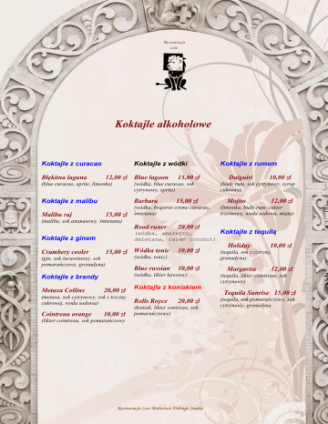 Koktajle alkoholowe Koktajle z curacao Koktajle z wódki Błękitna laguna 12,00 zł Blue lagoon 15,00 zł (blue curacao, sprite, limonka) (wódka, blue curacao, sok cytrynowy, sprite) Koktajle z malibu Barbara 15,00 zł Road runer 20,00 zł Malibu raj 15,00 zł (malibu, sok ananasowy, śmietana) (wódka, amaretto, śmietana, carem coconut) Koktajle z ginem Crambery cooler (gin, sok żurawinowy, sok pomarańczowy, grenadyna) 15,00 zł Wódka tonic 10,00 zł Blue russian 10,00 zł 20,00 zł (metaxa, sok cytrynowy, sok z trzciny cukrowej, woda sodowa) Cointreau orange (wódka, tonic) (wódka, likier kawowy) Koktajle z brandy Metaxa Collins (wódka, brązowe creme curacao, śmietana) 10,00 zł Koktajle z koniakiem Rolls Royce 20,00 zł (koniak, likier contreau, sok pomarańczowy) Koktajle z rumem Daiguiri 10,00 zł Mojito 12,00 zł (biały rum, sok cytrynowy, syrop cukrowy) (limonka, biały rum, cukier trzcinowy, woda sodowa, mięta) Koktajle z tequilą Holiday 10,00 zł Margarita 12,00 zł (tequila, sok z cytryny, grenadyna) (tequila, likier cointreau, sok cytrynowy) Tequila Sunrise 15,00 zł (tequila, sok pomarańczowy, sok cytrynowy, grenadyna (likier cointreau, sok pomarańczowy 1