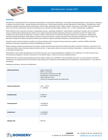 Refraktometr model J357 PROMOCJA! Automatyczny refraktometr J357 jest urzadzeniem wyposażonym w uklad peltiera stabilizujący i kontrolujący temperatuję próbki w czasie pomiaru, stabilizacja ta odbywa się zarówno od dołu – poprzez powierzchnie pryzmatu jak i od góry poprez pokrywę również wyposażoną w układ peltiera. Zaprojektowany został specjalnie pod katem potrzeb przemysłu spożywczego i chemicznego, zapewniając pomiar indeksu refrakcji, oraz pomiary w skali BRIX, cieżaru własciwego moczu oraz 100 skal uzytkownika. Pomiary te wykonywane są w szerokim zakresie indeksu refrakcji (1,26 – 1,70 RI) z dokładnością ±0.00004 RI. Dzięki elektronicznemu odczytowi eliminuje on subiektywośc odczytu, zwiększając dokąłdnośc i powtarzalność uzyskiwanych wyników. Jak we wszytskich naszych refraktometrach laboratoryjnych również w tym modelu zastosowano płytką studzienkę pomiarową (o nachyleniu ścianek 10°) dzieki czemu urządzenie jast bardzo łatwe do utrzymania w czystości. Próbka umieszcana jest na szafirowym pryzmacie odpornym na zarysowanie, i stabilizowana termicznie poprzez wbudowane układy Peltiera, zarówno od strony pryzmatu jak i pokrywy bez konieczności stosowania zewnetrzych łaźni wodnych itp. Sterowanie urządzeniem odbywa się poprzez bardzo prosty interferjs i wygodny wyświetlacz dotykowy o dużej powierzchni roboczej. Oczywiście oprócz kontroli temperatury próbki nasz system umozłiwa roznież stosowanie korety temperatury zgodnie z tabelami ICUMSA, jakkolwiek stabilizacja temperatury gwarantuje uzyskiwanie dokąłdniejszych wyników. Należy pamiętać że tabele wykorzystywane do przeliczen korekty temperaturowej oprocowane zostały dla wodnych roztworów sacharowy i stosownie ich do innego typu próbek zawsze powoduje zwiększenie błedu pomiaru. Z tego powodu zalecamy stosoenie stabilizacji temperatury – wówczas próbka jest mierzona w wymaganej temperaturze. Refraktometry nasze zostały zaprojektowane dla potrzeb przemysłu, już na etapie projektowania uwzględnio w nich odpornośc na trudene warunki pracy, minimalizację wymaganych czynności serwisowych czy tez łatwość obługi – pomiar po nacisnieciu jednego klawisza. Refraktometr J357 umozliwa przeprowadzenie pomiarów indeksu refrakcji lub w skali BRIX, ciezaru właściwego dla moczu czy innych dowolnych 100 skali możłiwywych do zaprogramowania dla uzytkownika. Jego kalibracja jest możłiwa do przeprowadzenia przez uzytkowania z wykorzystaniem 1, 2 lub nawet 10 standardów. Podstawowe parametry techniczne refraktometru: Skale pomiarowe Indeks refrakcji (RI) BRIX (% sacharozy) Skorygowany temperaturowo BRIX Skorygowany temperaturowo RI Ciężar właściwy moczu 100 skal do zaprogramowania dla użytkownika Zakres pomiarowy 1.26 – 1.70 RI, 0 – 100 BRIX Rozdzielczość 0.00001 RI 0.01 BRIX Powtarzalność ±0.00002 RI, ±0.0l5 BRIX Dokładność ±0.00004 RI, ±0.03 BRIX Długość fali 589.3nm DONSERV ul. Spisaka 31, 02-495 Warszawa tel.: 22 863 19 30, fax: 22 863 19 33 [email protected], www.donserv.pl Materiał pryzmatu Sztuczny szafir Źródło światła Dioda LED (czas zżycia: > 1,000,000 pomiarów) Czas odpowiedzi Odczyty ciągłe lub programowane przez użytkownika opóźnienie (dla większości wypadków mniejszy niż 30 s) Porty komunikacyjne 2 porty RS232 1 port równoległy (drukarkowy – CENTRONICS) Dostępny adapter do USB[1] Wyjście analogowe 0-10 volts, 4-20 mA Zakres kontroli temperatury 15ºC – 100ºC lub opcjonalnie 10 - 120°C Dokładność kontroli temperatury ±0.05ºC Zakres temperatury pracy urządzenia 10°C – 40°C Zakres korekty temperatury 18°C – 80°C (zgodnie z tabelami ICUMSA dla czystych roztworów sacharozy) Pomiar i kontrola temperatury Powierzchnia pryzmatu i pokrywy Kalibracja Z wykorzystaniem standardów wody i NIST (1,2 lub 10 punktowa) Wymiary i waga D: 39.5cm S: 25.5cm W: 13cm / 10.4kg Zasilanie 100-240 volts, 50 Hz – 60 Hz Zastosowanie: Refraktometr J357 jest refraktometrem automatycznym z oferty Rudolf Reserach Analytical, przeznaczonym dla zastosowań w przemyśle chemicznym oraz w nauce gdzie wymagany jest największy zakres pomiarowy i kontrola termiczna próbek. Refraktometr Rudolph J357 jest przeznaczony dla: Przemysłu spożywczego Przemysłu chemicznego i petrochemicznego (w tym tworzyw sztucznych) Szkół i uniwersytetów - Edukacja DONSERV ul. Spisaka 31, 02-495 Warszawa tel.: 22 863 19 30, fax: 22 863 19 33 [email protected], www.donserv.pl Badan produktów naturalnych Badań substancji zapachowych i smakowych Producent: RUDOLPH RESEARCH ANALYTICAL [1] Opcjonalne wyposażenie – o szczegóły prosimy pytać naszych przedstawicieli Link do pliku źródłowego DONSERV ul. Spisaka 31, 02-495 Warszawa tel.: 22 863 19 30, fax: 22 863 19 33 [email protected], www.donserv.pl