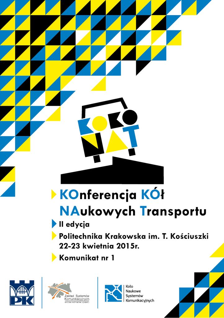 KOnferencja KOł NAukowych Transportu II edycja Politechnika Krakowska im. T. Kościuszki 22-23 kwietnia 2015r. Komunikat nr 1 ORGANIZATORZY KONFERENCJI ź Politechnika Krakowska im. Tadeusza Kościuszki, Zakład Systemów Komunikacyjnych ź Koło Naukowe Systemów Komunikacyjnych PK KOMITET NAUKOWO-PROGRAMOWY Przewodniczący dr hab. inż. Andrzej SZARATA, prof. PK – Politechnika Krakowska Sekretarz naukowy dr inż. Tomasz KULPA – Politechnika Krakowska Członkowie: ź ź ź ź ź ź ź ź ź ź ź ź ź ź ź ź prof. dr hab. inż. Włodzimierz CZYCZUŁA – Politechnika Krakowska prof. dr hab. inż. Andrzej RUDNICKI – Politechnika Krakowska dr hab. Mariusz CZEPCZYŃSKI, prof. UG – Uniwersytet Gdański dr hab. inż. Stanisław GACA, prof. PK – Politechnika Krakowska dr hab. inż. Vitalij NAUMOV – Kharkiv Nationaly AvtomobilnoDorozniy Universytet dr hab. inż. Wiesław STAROWICZ, prof. PK – Politechnika Krakowska dr hab. inż. Lidia ŻAKOWSKA – Politechnika Krakowska dr inż. Marek BAUER – Politechnika Krakowska dr inż. Janusz BOHATKIEWICZ – Politechnika Lubelska dr inż. Mariusz DUDEK – Politechnika Krakowska dr inż. Tomasz DYBICZ – Politechnika Warszawska dr inż. Szymon FIEREK – Politechnika Poznańska dr inż. Andrzej KRYCH – Politechnika Poznańska dr inż. arch. Anna LOWER – Politechnika Wrocławska dr inż. Bogusław MOLECKI – Politechnika Wrocławska mgr inż. Krystian BIRR – Politechnika Gdańska Przewodniczący KOMITET ORGANIZACYJNY mgr inż. Rafał KUCHARSKI – Politechnika Krakowska Członkowie: ź Krystian BANET – Koło Naukowe Systemów Komunikacyjnych ź Sylwia ROGALA – Koło Naukowe Systemów Komunikacyjnych PATRONAT HONOROWY JM Rektor Politechniki Krakowskiej prof. dr hab. inż. Kazimierz FURTAK Komitet Nauki SITK RP PATRONAT MEDIALNY Konferencja Kół Naukowych Transportu ź ź ź ź ź ź ź ź ź ź ź ź ź ź ź ź ź TEMATYKA KONFERENCJI Planowanie systemów komunikacyjnych Prognozowanie podróży Modelowanie podróży i ruchu Inżynieria ruchu Logistyka Transport lotniczy Operacji transportowe Transport publiczny Urbanistyka i zagospodarowanie przestrzenne Optymalizacja systemów transportowych Telematyka ITS Transport kolejowy Polityka transportowa Ekonomika transportu Sterowanie ruchem Rozwój i modernizacja infrastruktury TERMIN I MIEJSCE KONFERENCJI Termin: 22-23 kwietnia 2015r. Miejsce obrad: Politechnika Krakowska im. Tadeusza Kościuszki, ul. Warszawska 24, 31-155 Kraków INFORMACJE I KONTAKT Aktualne informacje o konferencji będą zamieszczane na stronie internetowej: konferencja.knsk.org Dodatkowe informacje można uzyskać pod adresem: [email protected] KOSZTY UDZIAŁU W KONFERENCJI Odpłatność za udział 1 osoby wynosi 150 zł (netto). Opłata obejmuje: ź obiady oraz przerwy kawowe 22 i 23 kwietnia, ź spotkanie koleżeńskie, ź materiały konferencyjne. ZGŁOSZENIA Zgłoszenia na konferencję według szablonu zamieszczonego na stronie www.konferencja.knsk.org prosimy przesyłać na adres mailowy: [email protected]. Termin nadsyłania zgłoszeń to 16 lutego 2015r. dla autorów referatów oraz 20 marca 2015 r. dla uczestników bez referatu. Autorzy trzech najlepszych prezentacji zostaną nagrodzeni, a najciekawszy referat (po spełnieniu wymagań edytorskich) zostanie opublikowany w Transporcie Miejskim i Regionalnym. PRZYGOTOWANIE STRESZCZEŃ Streszczenia artykułów (100 - 200 słów) prosimy przesyłać na adres mailowy: [email protected]. Termin nadsyłania streszczeń to 16 lutego 2015r. Autorzy wybranyc h streszczeń zostaną poproszeni o przesłanie rozszerzonego tekstu oraz prezentacji. Szablon streszczenia oraz rozszerzonego tekstu znajdują się na stronie: www.konferencja.knsk.org. TERMINARZ zgłoszenie streszczeń referatów oraz uczestnictwa w konferencji (dla uczestników z referatem) 16.02.2015r. akceptacja zgłoszonych streszczeń 23.02.2015r. zgłoszenia uczestnictwa bez referatu, wniesienie opłaty konferencyjnej, przesłanie rozszerzonych tekstów 20.03.2015r. i prezentacji Ewentualne opóźnienia w stosunku do podanych terminów należy uzgodnić z organizatorami.