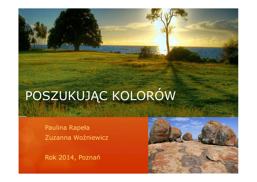 POSZUKUJĄC KOLORÓW Paulina Rapeła Zuzanna Woźniewicz Rok 2014, Poznań http://www.tapetus.pl/137766,gory-tecza-rzeka.php Krajobrazy Ziemi i ich podstawowe kolory Krajobraz (wg prof. Leszczyckiego) jest to część powierzchni ziemi posiadające naturalne granice, różniące się jakościowo od innych oraz posiadające wewnętrzną całość elementów, obiektów, zjawisk. http://www.widoczki.com/krajobrazy.html KRAJOBRAZ JEDNOLITY WIELOBARWNY ANTROPOGENICZNY KRAJOBRAZ JEDNOLITY -ZIELEŃ KRAJOBRAZ JEDNOLITY - BIEL KRAJOBRAZ JEDNOLITY - CZERWIEŃ KRAJOBRAZ ANTROPOGENICZNY www.wallsave.com/wallpaper/1920x1200/tapety-hd-krajobraz-real-madrid-582275.html KRAJOBRAZ WIELOBARWNY http://www.poznan.pl/mim/wiadmag/news/strategia-rozwoju-miasta-poznania-do-roku-2030-wypelnij-ankiete,61170.html Dziękujemy za uwagę Bibliografia Łazarz A., Sobotka St., Szczepańska A., 2013, Ciekawi Świata – przyroda. Operon, www.wikipedia.pl http://www.tapetus.pl/137766,gory-tecza-rzeka.php www.wallsave.com/wallpaper/1920x1200/tapety-hdkrajobraz-real-madrid-582275.htm http://www.widoczki.com/krajobrazy.html http://www.poznan.pl/mim/wiadmag/news/strategiarozwoju-miasta-poznania-do-roku-2030-wypelnijankiete,61170.html