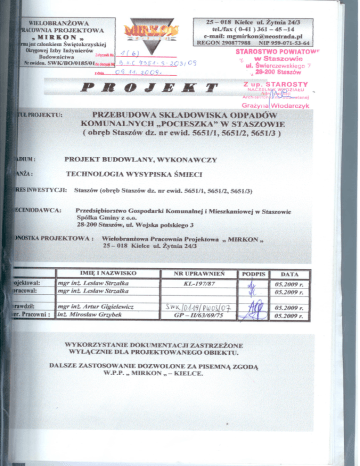 ZAWARTOŚĆ OPRACOWANIA CZĘŚĆ OPISOWA: I. Informacje ogólne. II. Opis rozwiązań projektowych. III. Opis materiałów montażowych i konstrukcji obiektów. CZĘŚĆ RYSUNKOWA: Rys. 1. Sytuacja. Rys. 2. Kwatera – przekroje poprzeczne. Rys. 3. Zbiornik odcieków V=300 m3. Rys. 4. Pompownia odcieków. Rys. 5. Zbiornik wód opadowych V=500 m3. – Rzut. Rys. 6. Zbiornik wód opadowych V=500 m3. – Przekroje. Rys. 7. Zbiornik bezodpływowy V=2 m3. Rys. 8. Studzienka odgazowania. Rys. 9. Pochodnia biogazowa. -1: 1000 -1: 500 -1: 100 -1: 100 -1: 100 -1: 100 -1: 50 -1: 25 -1: 50 2 OPIS TECHNICZNY do projektu budowlano–wy konawczego branża technologiczna przebudowy składowiska odpadów komunalny ch „Pocieszka” w Staszowie (obręb Staszów dz. nr ewid. 5651/1, 5651/2, 5651/3). I. INFORMACJE OGÓLNE. 1. Nazwa i miejsce lokalizacji inwestycji. Rozpatrywaną inwestycję stanowi przebudowa składowiska odpadów komunalnych „Pocieszka” w Staszowie (obręb Staszów dz. nr ewid. 5651/1, 5651/2, 5651/3). 2. Inwestor. Przedsiębiorstwo Gospodarki Komunalnej i Mieszkaniowej w Staszowie Spółka Gminy z o.o. ul. Wojska Polskiego 3 28-200 STASZÓW 3. Jednostka Projektowa. Wielobranżowa Pracownia Projektowa “MIRKON” ul. Żytnia 24/3 25-018 KIELCE 4. Przedmiot i zakres opracowania. Przedmiotem niniejszego opracowania jest projekt budowlano-wykonawczy branży technologicznej przebudowy składowiska odpadów komunalnych „Pocieszka” w Staszowie (obręb Staszów dz. nr ewid. 5651/1, 5651/2, 5651/3). W zakres rzeczowy opracowania wchodzi: - część północna i wschodnia wysypiska zajęta przez składowane odpady rów opaskowy L= 353.5 m zbiornik wód opadowych 20 x 12 x 2.5 m 1 kpl. przenośna instalacja zraszająca 1 kpl. studnie odgazowujące S1 i S2 2 kpl. 3 zbiornik bezodpływowy 2 m na ścieki socjalno-bytowe 1 kpl. przykanalik φ 110 PCV L= 14.0 m - część południowa i zachodnia nie zajęta przez składowane odpady kwatera do deponowania odpadów 1 kpl. 2 3200 m w podstawie 12000 m2 w koronie pompownia odcieków q=7.0 dm3/s, h =14.6 m 1 kpl. drenaż odcieków φ 160 PCV-U L= 276.0 m φ 200 PCV-U L= 20.0 m rurociąg tłoczny odcieków φ 110 PE L= 51.0 m zbiornik wód odciekowych 12 x 12 x 2.5 m 1 kpl. studnie odgazowujące S3 i S4 2 kpl. pochodnia do spalania biogazu 1 kpl. przewody biogazu φ 63 PE L= 596.0 m tymczasowa droga technologiczna L= 150.0 m 3 5. Podstawy opracowania. Umowa na opracowanie projektu. Decyzja Nr 3/08 o ustaleniu lokalizacji inwestycji celu publicznego polegającej na przebudowie składowiska odpadów komunalnych „Pocieszka” w Staszowie oraz budowie zbiornika odcieków, pompowni wraz z infrastrukturą towarzyszącą na części nieruchomości składającej się z działek oznaczonych nr ewid. 5651/1, 5651/2, 5651/3 w Staszowie. - wyd. Burmistrz Miasta i Gminy w Staszowie, pismo znak: IPP.II.7331/2-2/2008 z dnia 07.08.2008 r. Decyzja o udzieleniu pozwolenia zintegrowanego dla instalacji do składowania odpadów innych niż niebezpieczne i obojętne o zdolności przyjmowania ponad 10 ton odpadów na dobę lub całkowitej pojemności ponad 25000 ton, zlokalizowanej w Staszowie przy ul. Pocieszka. wyd. Wojewoda Świętokrzyski, pismo znak: ŚR.III.6618-10/07 z dnia 22.11.2007 r. Postanowienie Regionalnego Dyrektora Ochrony Środowiska w Kielcach uzgadniające środowiskowe uwarunkowania zgody na realizację przedsięwzięcia polegającego na przebudowie składowiska odpadów komunalnych „Pocieszka” w Staszowie, budowie zbiornika odcieków, pompowni wraz z infrastrukturą towarzyszącą, na działkach o nr ewid. 5651/1, 5651/2, 5651/3, według wariantu „II”, realizowanego przez Przedsiębiorstwo Gospodarki Komunalnej i Mieszkaniowej Sp. z o.o w Staszowie. - pismo znak: RDOŚ-26-WOO.II-6613/2012/08/kt z dnia 28.01.2009 r. Postanowienie Państwowego Wojewódzkiego Inspektora Sanitarnego w Kielcach uzgadniające w zakresie ochrony zdrowia i życia ludzi środowiskowe uwarunkowania realizacji przedsięwzięcia pn.: przebudowa składowiska odpadów komunalnych „Pocieszka” w Staszowie, budowa zbiornika odcieków, pompowni wraz z infrastrukturą towarzyszącą zlokalizowanego na działkach nr ewid. 5651/1, 5651/2, 5651/3. - pismo znak: SE.V.4431/34/08 z dnia 09.12.2008 r. Raport oddziaływania na środowisko inwestycji przebudowy składowiska odpadów komunalnych „Pocieszka” w Staszowie – oprac. Przedsiębiorstwo Budownictwa Ekologicznego w Kielcach, 11.2008 r. Mapa sytuacyjno-wysokościowa 1:500 do celów projektowych. - 23.07.2008 r. Dokumentacja geotechniczna pod projektowaną przebudowę składowiska odpadów komunalnych „Pocieszka” w Staszowie. – Andrzej Rybka, 02.2009 r. Wizja lokalna na terenie wysypiska. Uzgodnienia międzybranżowe. Obowiązujące przepisy i normatywy. II. OPIS ROZWIĄZAŃ PROJEKTOWYCH. 1. Stan istniejący. Składowisko odpadów komunalnych „Pocieszka” w Staszowie położone jest w odległości ok. 2.5 km na północ od Staszowa w pobliżu granicy administracyjnej miasta. Teren wysypiska z trzech stron otoczony jest lasem sosnowym. Najbliższa zabudowa mieszkalna oddalona jest o 300 m na północny-zachód od granicy składowiska. Zabudowa ta znajduje się za zwartym kompleksem leśnym. Inna zabudowa mieszkalna zlokalizowana jest na północny-wschód od składowiska, w odległości ok. 400 m. Teren składowiska leży w obrębie starego wyrobiska piaskowni o zagłębieniu od 2.0 do 14.0 m w stosunku do otaczającego terenu. Składowanie odpadów rozpoczęto w północnej i wschodniej części działki nr 5651. Obecnie jej południowozachodnia i zachodnia strona nie jest jeszcze zajęta przez odpady. Powierzchnia terenu całego składowiska wynosi ok. 3.75 ha. 4 Składowanie odpadów odbywa się na obecnie eksploatowanej kwaterze w części północnej i wschodniej. Teren o powierzchni ok. 3000 m2 w części północno-zachodniej składowiska zajęty jest przez infrastrukturę towarzyszącą. Stan dotychczas 