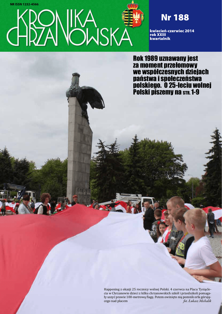 NR ISSN 1232-4566 Nr 188 kwiecień-czerwiec 2014 rok XXIII kwartalnik Rok 1989 uznawany jest za moment przełomowy we współczesnych dziejach państwa i społeczeństwa polskiego. O 25-leciu wolnej Polski piszemy na STR. 1-9 Rzeźba przedstawia Ojca Świętego na tronie, błogosławiącego lud ex cathedra, w stroju pontyfikalnym, z ręką na sercu. Artysta Beatificatus wyrzeźbił już po ogłoszeniu terminu wyniesienia na ołtarze polskiego papieża fot. Krzysztof Ślusarczyk Happening z okazji 25 rocznicy wolnej Polski. 4 czerwca na Placu Tysiąclecia w Chrzanowie dzieci z kilku chrzanowskich szkół i przedszkoli pomagały uszyć prawie 100-metrową flagę. Potem owinięto nią pomnik orła górującego nad placem fot. Łukasz Michalik 2 KronikaChrzanowska 25 LAT WOLNOŚCI 2014 – Rok Wolności Debata oksfordzka „Wolność - czujesz to?”, która odbyła się w Miejskiej Bibliotece Publicznej w Chrzanowie Wolność – dla jednych stan ducha, sposób myślenia, dla innych zagadnienie filozoficzne, socjologiczne czy polityczne. Dla Polski to słowo o szczególnym znaczeniu, tym bardziej, że w tym roku mija kolejna rocznica przeprowadzenia pierwszych wolnych wyborów w powojennej Polsce. Zjednoczeni w nadziei na „lepsze jutro” po latach represji i cenzury 25 lat temu wybraliśmy wolność i demokrację, dzięki której jesteśmy dziś w Zjednoczonej Europie. Mówić o wolności należy z szacunkiem pamiętając jak ciężko było ją osiągnąć. Bez walki i wiary w to, że w końcu nadejdzie na pewno nie udałoby się osiągnąć celu i stanąć w miejscu, w którym dzisiaj jest Polska. Nie udałoby się również gdyby nie pomoc osób takich jak Karol Wojtyła, który jako nowo wybrany „Papież Polak” był wsparciem i pocieszeniem oraz nadzieją na to, że w naszej walce nie jesteśmy sami . Swoimi słowami i odwagą by głośno mówić o tym, co dzieje się w kraju natchnął Polaków nadzieją, która potem stała się orężem działań Solidarności. Oprócz Papieża Jana Pawła II dążenia do wolności wspierały także instytucje, które pomimo cenzury i żelaznej kurtyny przenikały do świadomości Polaków pokazując skrawki świata zewnętrznego i skutecznie przybliżając wszystkim idee Solidarnej Polski. W latach siedemdziesiątych swoją działalność rozpoczął Komitet Obrony Robotników – pierwsza jawna grupa opozycji demokratycznej, stająca w obronie praw człowieka. Rozwinął się „powielaczowy” ruch wydawniczy – własne biuletyny wydawał KOR, poza cenzurą drukowano liczne gazetki i pisma, a z czasem także książki. Biblioteki miały mieć w tamtych latach szczególne znaczenie i swoistą kulturalną misję. Miały wychowywać i propagować ówczesny ustrój dlatego też, z jednej strony ogólnie dostępne, miały jednocześnie bardzo ograniczone zasoby – na podstawie powstałych list książek przeznaczonych do wycofania ze zbiorów bibliotek publicznych oraz księgarni ponad 2000 tytułów zostało początkowo wycofanych z obiegu a następnie zniszczonych. łeczeństwa. Kolejną formą obchodów stanowiła wystawa fotograficzna Adama Bujaka i Arturo Mari „Nie ma solidarności bez wolności” obrazująca zaangażowanie Jana Pawła II w sprawy Polski nie tylko w swoich wystąpieniach i deklaracjach ale także podczas pielgrzymek do Polski i osobistych spotkań z wiernymi. Każdy czytelnik, który będzie odwiedzał bibliotekę będzie miał również okazję skorzystać z „Półki Wolności” – inicjatywy koalicji organizacji pozarządowych Razem89, dzięki której w jednym miejscu zbierzemy biblioteczne zbiory popularyzujące literaturę przedstawiającą najnowszą historię Polski i poszerzającą wiedzę o polskiej drodze do wolności. W związku z tegoroczną rocznicą obchodów 25-lecia wygrania Solidarności w wolnych wyborach w całym kraju planowane są różnego rodzaju inicjatywy mające na celu przypomnienie tamtych wydarzeń a także podjęcie samego tematu wolności. O wolności należy mówić wiele, głośno i wszędzie. Tak, by jej idea zakotwiczyła się w świadomości ludzkiej na tyle głęboko, by móc przekazywać ją przez następne pokolenia a biblioteki były jednym z narzędzi jej propagowania. Także Miejska Biblioteka Publiczna w Chrzanowie przyłączyła się do ogólnopolskich obchodów i od początku roku jest organizatorem wielu ciekawych wydarzeń. W cyklu imprez znalazły się do tej pory min debata „Wolność – czujesz to?” z udziałem młodzieży licealnej oraz gościa specjalnego – Róży Thun. Podczas spotkania zastanawiano się nad zagadnieniem wolności, jej ograniczeniami oraz nad obowiązkami jednostki wobec spo- Działania chrzanowskiej biblioteki w propagowaniu idei wolności zostały docenione i zauważone przez inicjatorów akcji „Wolność – czujesz to?”. Biblioteka znalazła się wśród trzech innych książnic, które odwiedzi prof. Leszek Balcerowicz. Spotka się on z czytelnikami w Chrzanowie w wakacje 2014 roku. Więcej informacji pojawi się w najbliższym czasie na stronie www.mbp.chrzanow.pl. Anna Niemczyk KronikaChrzanowska 3 25 LAT WOLNOŚCI TO BYŁ PRZEŁOMOWY MOMENT R ok 1989 uznawany jest w historii Polski za moment przełomowy we współczesnych dziejach państwa i społeczeństwa polskiego. Zapoczątkowana wówczas transformacja ustrojowa oraz procesy demokratyzacyjne odcisnęły swoje piętno nie tylko na kształcie polskiego systemu politycznego, ale miały również olbrzymi wpływ na przebieg i charakter przemian społeczno-ekonomicznych. Wpływ ten jest zresztą do dziś mocno odczuwalny, a oceny samych przemian – bardzo zróżnicowane. 5 kwietnia 2014 roku przypadła 25 rocznica podpisania porozumień „Okrągłego Stołu”, a 4 czerwca tego roku – pierwszych, częściowo demokratycznych wyborów parlamentarnych. Wydarzenia te, których znaczenie oraz symbolika są nie do przecenienia, w literaturze politologicznej uważane są za decydują