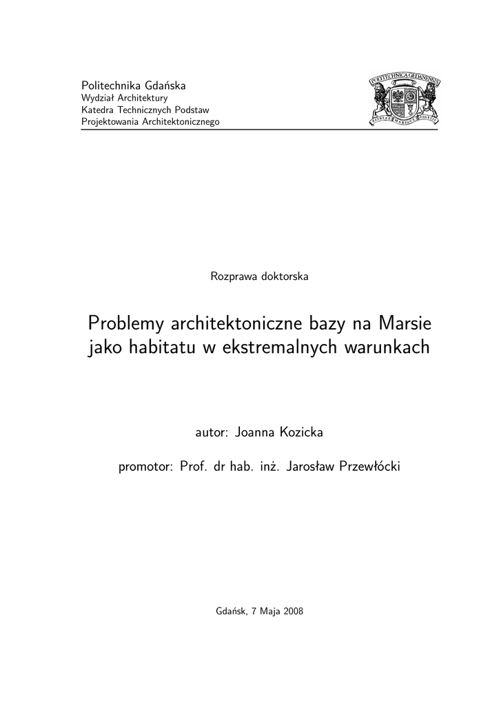 Politechnika Gdańska Wydział Architektury Katedra Technicznych Podstaw Projektowania Architektonicznego Rozprawa doktorska Problemy architektoniczne bazy na Marsie jako habitatu w ekstremalnych warunkach autor: Joanna Kozicka promotor: Prof. dr hab. inż. Jarosław Przewłócki Gdańsk, 7 Maja 2008 Streszczenie Misje załogowe na Marsa to szczególny przypadek misji kosmicznych ze względu na swój długi czas trwania. Aspekt ludzki staje się tu tak samo ważny jak problemy technologiczne. Zdaniem autorki ludzie nie mogą przebywać przez ponad 2,5 roku w ciasnej, niewygodnej kapsule, (jak zakłada się m. in. w programie kosmicznym NASA). Potrzebny jest przyjazny człowiekowi habitat. Jak wynika z badań zachowania ludzi w ICE, w liczniejszych grupach występuje mniejsza konfliktowość. Dla większej załogi należy zaprojektować duży habitat – bazę. Ekstremalne warunki panujące na Marsie wymagają specyficznego sposobu projektowania architektonicznego. Z tego względu autorka podjęła się przeprowadzenia szeregu analiz w celu rozpoznania w wyczerpującym zakresie zagadnień odnoszących się do problematyki architektury marsjańskiej. W rozważaniach swych doszła ona do wniosku, że obecna wiedza o Marsie oraz dostępne dziś technologie budowlane umożliwiają zaprojektowanie bazy na Czerwonej Planecie na wiele różnych sposobów. Modele architektoniczne autorki są tego dowodem. Przy pomocy narzędzi dostępnych architekturze można wpłynąć na wzrost komfortu fizycznego i psychicznego mieszkańców bazy pozaziemskiej. Wykonany przez autorkę projekt koncepcyjny bazy pokazuje, że przy stosunkowo niskich nakładach finansowych można stworzyć bezpieczny konstrukcyjnie, estetyczny i przyjazny człowiekowi habitat, który może się zmieniać i rozrastać w zależności od potrzeb. W niniejszej dysertacji skupiono się na zagadnieniach mających wpływ na sposób projektowania szczególnego przypadku habitatu w ekstremalnych warunkach – bazy marsjańskiej. W rozdziale pierwszym poruszono problem aktualności tematu doktoratu w obliczu kształtowania się planów eksploracji kosmosu. Autorka przedstawia założenia, które nadały kierunek prowadzonym przez nią badaniom. W rozdziale drugim wymienione zostały cele, sposób prowadzenia badań, zastosowane metody badawcze oraz tezy doktoratu. W rozdziale trzecim autorka przedstawia Marsa jako specyficzne miejsce budowy. Warunki tam panujące rzutują na konstrukcję i formę habitatu, co skonkretyzowane zostało we wnioskach. Rozdział czwarty dotyczy wpływu czynnika ludzkiego na architekturę bazy na Marsie. Analiza problemu przetrwania, uwarunkowań socjopsychologicznych oraz komfortu fizycznego i psychicznego doprowadziła autorkę do konstruktywnych konkluzji co do sposobu projektowania bazy na Marsie. W rozdziale piątym przeprowadzono przekrojową analizę najrozmaitszych habitatów w warunkach ekstremalnych, pod różnymi względami analogicznymi do Marsa. Omówiono dotychczas powstałe habitaty w warunkach ekstremalnych na Ziemi oraz w kosmosie. Przegląd ten umożliwił autorce dokonanie oceny dotychczas wykorzystywanych rozwiązań dla tego typu architektury. W rozdziale szóstym omówiono architekturę habitatu w podrozdziałach: „konstrukcja”, „forma”, „funkcja” oraz „wnętrza”. Przeanalizowano istniejące technologie budowlane, które rozpoznane zostały jako możliwe do zaadoptowania w warunkach ekstremalnych. Omówiono zagadnienie formy bazy, uwzględniając wpływ iii iv na nią dostępnych rozwiązań technologicznych, możliwych gabarytów oraz czynnika ludzkiego. Ogólnie poruszono problematykę sposobu kształtowania układu funkcjonalnego bazy na Marsie. Przedstawiono sposoby projektowania wnętrz odnoszące się do restrykcji związanych z konstrukcją, formą i funkcjonalnością habitatu. Na podstawie wniosków z tego podrozdziału autorka opracowała cztery przykładowe rozwiązania dla wnętrz w bazie marsjańskiej. Wreszcie w ostatnim podrozdziale przeprowadzono krytyczną analizę koncepcji baz pozaziemskich z literatury. W rozdziale siódmym autorka przedstawiła własne modele architektoniczne bazy marsjańskiej spełniające wymagania i wytyczne sprecyzowane we wnioskach w poprzednich rozdziałach. Jeden z modeli został opracowany szczegółowo w rozdziale ósmym. W rozdziałach: trzecim, czwartym, piątym i szóstym autorka przeprowadziła szereg analiz na podstawie dostępnej literatury obejmującej 189 pozycji. Analizy kończą wyciągnięte przez autorkę „wnioski dla architekta”, będące wytycznymi do projektowania bazy marsjańskiej. Jest ich w sumie ponad 200. Wszystkie dziewięć modeli architektonicznych oraz projekt koncepcyjny bazy marsjańskiej są oryginalnymi propozycjami autorki, wykonanymi w oparciu o powyższe wytyczne. Spis treści 1. Wprowadzenie 1.1. Geneza powstania tematu . . . . . . . 1.2. Założenia nadające kierunek badaniom 1.2.1. Punkt wyjścia dla badań . . . . 1.2.2. Niewiadome . . . . . . . . . . . . . . 1 1 3 3 6 . . . . 9 9 9 11 12 3. Mars 3.1. Warunki na Marsie . . . . . . . . . . . . . . . . . . . . . . . . . . . . . . 3.2. Ukształtowanie terenu . . . . . . . . . . . . . . . . . . . . . . . . . . . . 13 13 27 4. Aspekt ludzki 4.1. Warunki przeżycia człowieka na Marsie . . . . . . 4.1.1. Problem przetrwania . . . . . . . . . . . . 4.1.2. System Podtrzymywania Życia – LSS . . . 4.1.3. Źródła zasobów dla podtrzymywania życia 4.2. Problemy socjopsychologiczne . . . . . . . . . . . 4.3. Ergonomia i komfort . . . . . . . . . . . . . . . . . . . . . . 41 41 41 44 47 66 86 . . . . . . . . 99 99 99 107 114 125 126 129 131 6. Architektura bazy marsjańskiej 6.1. Konstrukcja . . . . . . . . . . . . . . . . . . . . . . . . . . . . . . . . . . 6.1.1. Konstrukcje sztywne z metalu i tworzyw sztucznych . . . . . . . . . 6.1.2. Konstrukcje rozszerzalne . . . . . . . . . . . . . . . . . . . . . . . 137 137 137 142 2. Cele, metody badawc
