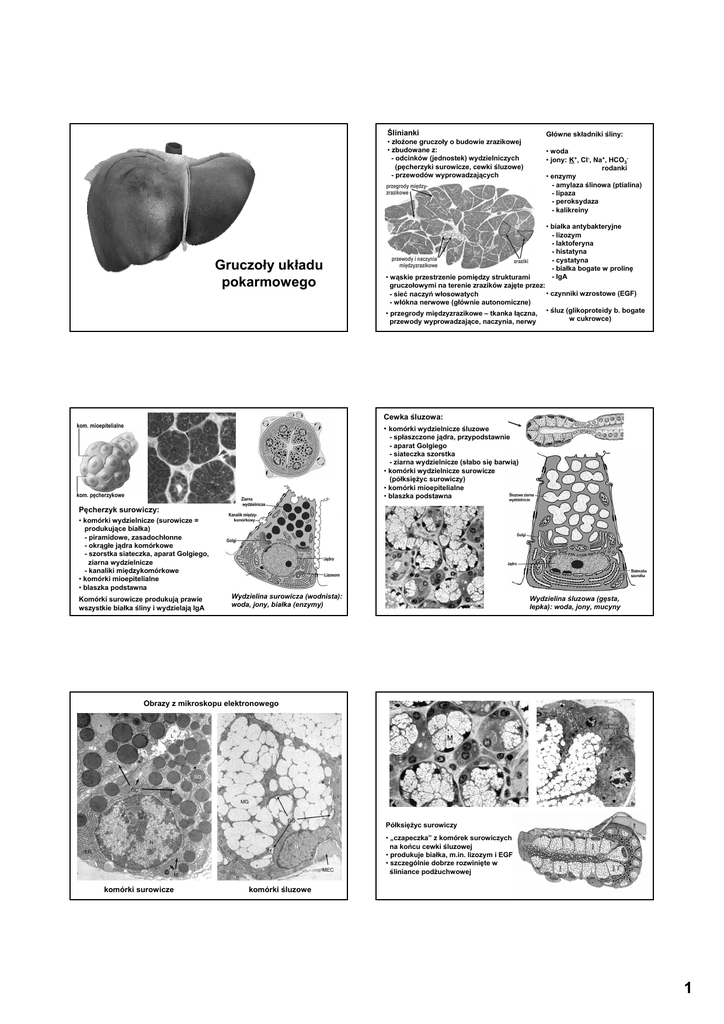 Ślinianki • złożone gruczoły o budowie zrazikowej • zbudowane z: - odcinków (jednostek) wydzielniczych (pęcherzyki surowicze, cewki śluzowe) - przewodów wyprowadzających Gruczoły układu pokarmowego Główne składniki śliny: • woda • jony: K+, Cl-, Na+, HCO3rodanki • enzymy - amylaza ślinowa (ptialina) - lipaza - peroksydaza - kalikreiny • białka antybakteryjne - lizozym - laktoferyna - histatyna - cystatyna - białka bogate w prolinę - IgA • wąskie przestrzenie pomiędzy strukturami gruczołowymi na terenie zrazików zajęte przez: • czynniki wzrostowe (EGF) - sieć naczyń włosowatych - włókna nerwowe (głównie autonomiczne) • przegrody międzyzrazikowe – tkanka łączna, • śluz (glikoproteidy b. bogate w cukrowce) przewody wyprowadzające, naczynia, nerwy Cewka śluzowa: kom. mioepitelialne • komórki wydzielnicze śluzowe - spłaszczone jądra, przypodstawnie - aparat Golgiego - siateczka szorstka - ziarna wydzielnicze (słabo się barwią) • komórki wydzielnicze surowicze (półksiężyc surowiczy) • komórki mioepitelialne • blaszka podstawna kom. pęcherzykowe Pęcherzyk surowiczy: • komórki wydzielnicze (surowicze = produkujące białka) - piramidowe, zasadochłonne - okrągłe jądra komórkowe - szorstka siateczka, aparat Golgiego, ziarna wydzielnicze - kanaliki międzykomórkowe • komórki mioepitelialne • blaszka podstawna Komórki surowicze produkują prawie wszystkie białka śliny i wydzielają IgA Wydzielina surowicza (wodnista): woda, jony, białka (enzymy) Wydzielina śluzowa (gęsta, lepka): woda, jony, mucyny Obrazy z mikroskopu elektronowego Półksiężyc surowiczy • „czapeczka” z komórek surowiczych na końcu cewki śluzowej • produkuje białka, m.in. lizozym i EGF • szczególnie dobrze rozwinięte w śliniance podżuchwowej komórki surowicze komórki śluzowe 1 Przewody wyprowadzające: • wstawka wewnątrz zrazika cewka śl. pęcherzyk sur. • przewód prążkowany • przewód międzyzrazikowy w tkance łącznej pomiędzy • przewód główny zrazikami wstawka przewody śródzrazikowe Wstawka: • nabłonek jednowarstwowy sześcienny • wymiana jonów Cl /HCO3 • produkcja laktoferyny, lizozymu i EGF Przewód prążkowany: • nabłonek jednowarstwowy walcowaty • prążkowanie przypodstawne • wymiana jonów Na+/K+, Cl /HCO3 wydzielanie jonów metali ciężkich jonów rodankowych i IgA • produkcja laktoferyny, kalikrein i EGF wstawka przewód prążkowany przewód prążkowany przewód międzyzrazikowy przewód główny Przewód międzyzrazikowy: nabłonek jednowarstwowy walcowaty → wielorzędowy Anatomiczne typy ślinianek: Przewód główny: nabłonek wielorzędowy → wielowarstwowy walcowaty → wielowarstwowy płaski (ujście) Przewody (szczególnie wstawki i przewody prążkowane) odpowiadają za ostateczny skład śliny. Ślinianka przyuszna • surowicza (tylko pęcherzyki surowicze) • długie wstawki • nieliczne grupy adipocytów Ślinianka podjęzykowa • mieszana ze znaczną przewagą komponenty śluzowej (tylko cewki śluzowe) • słabo rozwinięte półksiężyce surowicze • w przewodach prążkowanych najsłabsze prążkowanie lub jego brak 2 Ślinianka podżuchwowa gr. von Ebnera Małe gruczoły ślinowe • mieszana z przewagą komponenty surowiczej (80% pęcherzyki surowicze, 20% cewki śluzowe) • dobrze rozwinięte półksiężyce surowicze • długie przewody prążkowane • wysepki tkanki tłuszczowej (zwiększają się z wiekiem) Unerwienie gruczołów ślinowych • unerwienie autonomiczne przywspółczulne i współczulne • najsilniejszy wpływ komponenty przywspółczulnej na wydzielanie śliny (mediator: acetylocholina) • układy przywspółczulny i współczulny NIE działają antagonistycznie gr. wargowe • zlokalizowane w błonie podśluzowej jamy ustnej, rzadziej w blaszce właściwej • złożone • nie są otoczone torebką, przeważnie brak budowy zrazikowej • surowicze, śluzowe, mieszane • wstawki → przewody wyprowadzające (nabł. jednowarstwowy walcowaty) gruczoły von Ebnera - surowicze pozostałe gruczoły językowe i gruczoły podniebienne - śluzowe gruczoły wargowe i policzkowe – mieszane Trzustka to złożony gruczoł o budowie zrazikowej, posiadający dominującą część zewnątrzwydzielniczą i małe skupiska komórek dokrewnych (wysepki trzustkowe Langerhansa). wysepki trzustkowe gruczoł wargowy VIP przewody śródzrazikowe odcinki zewnątrzwydzielnicze tkanka łączna międzyzrazikowa naczynie przewody międzyzrazikowe • na terenie ślinianek znajdują się także perykariony komórek zwojowych naczynia pęczek nerwowy odcinki zewnątrzwydzielnicze przewody śródzrazikowe wysepki trzustkowe ciałko Paciniego Część zewnątrzwydzielniczą stanowi zwarty układ odcinków wydzielniczych (pęcherzyków trzustkowych) i system przewodów wyprowadzających. Pęcherzyk trzustkowy • komórki wydzielnicze (pęcherzykowe) • komórki śródpęcherzykowe • blaszka podstawna kom. pęcherzykowe kom. śródpęcherzykowe Komórki śródpęcherzykowe należą do przewodu wyprowadzającego (wstawki), która częściowo „wchodzi” na teren pęcherzyka Pęcherzyk otaczają naczynia włosowate blaszka podstawna 3 Komórki wydzielnicze (pęcherzykowe) to typowe komórki produkujące białka i wykazujące wyraźną polaryzację - jej efektem jest dwubarwność komórek i całego pęcherzyka • siateczka szorstka, Golgi • kwasochłonne ziarna wydz. • kanaliki międzykomórkowe Produkty wydzielnicze komórek pęcherzykowych Proenzymy: (aktywowane w jelicie cienkim) trypsynogen chymotrypsynogen prokarboksypeptydaza proelastaza profosfolipaza A2 Aktywne enzymy: alfa-amylaza lipaza trójglicerydowa DNaza RNaza Inne: proteazy esterazy kofaktor lipazy inhibitor trypsyny kwaśny proteoglikan Przewody wyprowadzające: • wstawki (nabłonek płaski do niskiego sześciennego) • przewody śródzrazikowe (nabłonek sze