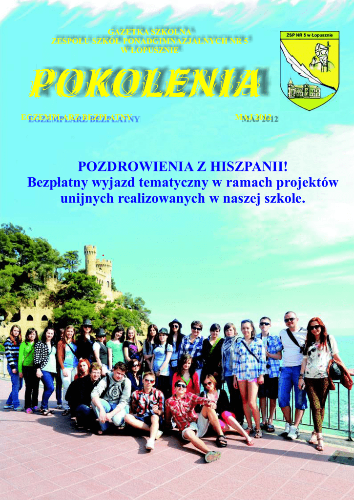 POZDROWIENIA Z HISZPANII! Bezpłatny wyjazd tematyczny w ramach projektów unijnych realizowanych w naszej szkole. ZESPÓŁ SZKÓŁ PONADGIMNAZJALNYCH NR 5 W ŁOPUSZNIE UL. KONECKA 2, 26-070 ŁOPUSZNO, TEL.: 41-39-14-926, FAX: 41-39-14-025 www.zsp5lopuszno.pl, [email protected] OFERTA EDUKACYJNA Technikum (4 letnie) -Technikum Informatyczne -Technikum Hotelarskie -Technikum Mechaniczne -Technikum Fryzjerskie -Technikum Architektury Krajobrazu -Technikum Technologii Żywności Liceum Ogólnokształcące (3 letnie) -kierunek ogólny -kierunek policyjno-prawny Zasadnicza Szkoła Zawodowa (3 letnia) -elektromechanik pojazdów samochodowych -monter zabudowy i robót wykończeniowych w budownictwie Nowe kierunki Kształcenia 2012/2013 (4 letnie) -Technikum Geodezyjne -Technikum Elektroniczne -Technikum Budowlane -Technikum Handlowe -Technikum Mechatroniczne Zasadnicza Szkoła Zawodowa (3 letnia) -cukiernik, - piekarz -Liceum Ogólnokształcące dla Dorosłych (3 letnie) Szkoła Policealna kształcąca w zawodach: - Technikum Bezpieczeństwa Higieny Pracy (1,5-letnie) - Technikum informatyczne (2-letnie) Gazetka Szkolna POKOLENIA Wydawca: Zespół Szkół Ponadgimnazjalnych Nr 5 w Łopusznie, ul. Konecka 2, 26-070 Łopuszno, tel.: 041 39 14 025 email: [email protected], www.zsp5lopuszno.pl Redaktor naczelny: Marzena Satalecka, Redakcja: nauczyciele ZSP Nr 5. Zdjęcia: autorzy artykułów. Druk: Drukarnia atlasStudio, 25-132 Kielce, ul. Czarnieckiego 23, tel.: 41-361-82-69, email.: [email protected] Opracowanie graficzne: Aleksander Terlecki. Redakcja zastrzega sobie prawo do skrótów, korekty gramatycznej i ortograficznej oraz ograniczonej ingerencji w stylistykę poszczególnych wypowiedzi. ZSP NR 5: WCZORAJ-DZIŚ-JUTRO... Słowo do gimnazjalistów N asi młodzi czytelnicy, mają już za sobą egzaminy po szkole gimnazjalnej. To dużo i ... mało. Dużo, bo doświadczenia te w pewnej mierze można wykorzystać w szkole średniej. Mało, bo przed Wami kolejne zmagania z przyszłością. Kształcić ją będą podejmowane decyzje, plany i zamierzenia. Jako Społeczność ZSP Nr 5 w Łopusznie pragniemy Wam w tych staraniach dopomóc i zaprosić w mury Naszej szkoły. Redakcja gazetki POKOLENIA Informacje o elektronicznej rekrutacji Od 4 maja 2012 r. wszystkie osoby chcące zapisać się do naszej szkoły, będą mogły zrobić to drogą elektroniczną. Procedura zapisu jest następująca: klikamy na Rejestracja ON-LINE na stronie www.zsp5lopuszno.pl i zakładamy konto zgodnie ze wskazówkami, Można także wydrukować wypełniony kwestionariusz osobowy, a po podpisaniu złożyć go w sekretariacie wraz ze świadectwem ukończenia szkoły i zaświadczeniem o wynikach egzaminu gimnazjalnego. mgr Aleksander Terlecki LOGO SZKOŁY W szkolnym konkursie na Logo Zespołu Szkół Ponadgimnazjalnych Nr 5 w Łopusznie brało udział 30 uczniów. Regulamin konkursu i wszelkie informacje umieszczone były na stronie: www.zsp5lopuszno.pl w zakładce konkursy. Dnia 07.03.2012 r. komisja w składzie: • dyrektor ZSP Nr 5 - mgr Irena Marcisz, • nauczyciel j. polskiego – mgr Marzena Satalecka, • nauczyciel informatyki – mgr Aleksander Terlecki ustaliła następującą kolejność miejsc: 1. miejsce Milena Rowińska uczennica klasy I Technikum Architektury Krajobrazu - praca nagrodzona logo firmujące Zespół Szkół Ponadgimnazjalnych Nr 5 w Łopusznie. Nagrodę główną (laptop) dla zwycięzcy ufundowała pani dyrektor ZSP Nr 5 w Łopusznie – mgr Irena Marcisz. Podsumowanie konkursu oraz wręczenie nagrody nastąpiło dnia 26-03-2012 w ZSP Nr 5 Łopusznie. Wszystkim uczniom biorącym udział w konkursie serdecznie dziękujemy! mgrAleksander Terlecki POKOLENIA 3 ZSP NR 5: WCZORAJ-DZIŚ-JUTRO... Wiedza nie jest dziedzictwem, które się otrzymuje, to całkiem nowy nabytek po który sięgać trzeba... Co o naszej szkole mówią pierwszoklasiści? - Gdyby ktoś dał mi możliwość ponownego wyboru s z k o ł y ponadgimnazjalnej to na pewno nie zmieniłabym swojej decyzji. Mój wybór ponownie padłby na Pałac w Łopusznie. Jest to szkoła z tradycjami, w której każdy czuje się bezpiecznie. Wybrałam tę szkołę, ponieważ ukończyła ją moja siostra i wypowiadała się o niej bardzo pochlebnie. Dzięki wykwalifikowanej kadrze nauczycielskiej zdała maturę z wynikiem bardzo dobrym i dostała się na wymarzone studia. Ta szkoła pozwala mi się rozwijać i poznawać nowe miejsca dzięki licznym wycieczkom. Poza tym ma bardzo dobrą lokalizację i dojazd do niej nie jest problemem. Agata Bańbura, kl. IA LO - Minął już prawie rok odkąd po raz pierwszy przekroczyłam progi tej szkoły. Było to na P i k n i k u Europejskim. Wtedy nie miałam pojęcia, co chcę robić po u k o ń c z e n i u gimnazjum ani, gdzie udam się na dalszą edukację. Po kilkugodzinnym pobycie w Pałacu już wiedziałam jaką szkołę wybiorę. Urzekła mnie rodzinna atmosfera panująca w tym miejscu oraz duch przeszłości. Wiązałam duże nadzieje z tą szkołą i nie zawiodłam się. Uczy nas ona samodzielnego myślenia, umiejętności jasnego i precyzyjnego wysławiania się oraz umożliwia rozwijanie naszych pasji i zainteresowań. Joanna Łapot, kl. IA LO 4 POKOLENIA - Nazywam się Kinga Filipiak. Chodzę do klasy I „b” LO o profilu policyjnoprawnym w Łopusznie. Był to bardzo dobry wybór szkoły. Nie żałuję. Moja klasa jest pierwszą i póki co jedyną o tym profilu. Na moim kierunku są zajęcia koła policyjno-prawnego, na których poznajemy polskie prawo. Kinga Filipiak, kl. IB LO - Szkołę znałem wcześniej, ale tylko z opowiadań kolegów. Minęło 7 miesięcy, a ja ciągle jestem zadowolony. Najbardziej podoba mi się atmosfera w szkole, każdy się ze sobą zna i momentami odnoszę wrażenie, że tworzymy jedną wielką rodzinę. Bartek Gad, kl. IA LO - Wybór szkoły nie był łatwą decyzją. Pomysł z LO chodził mi po głowie od dawna. Gdy dowiedziałem się jednak o nowo powstałym kierunk