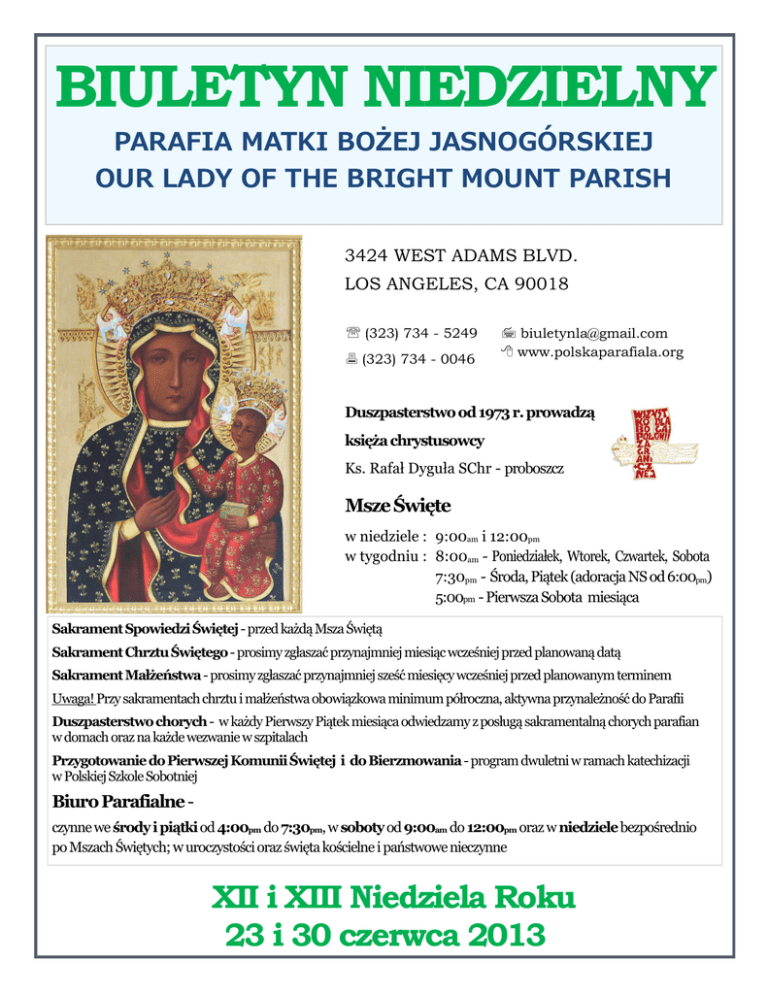 BIULETYN NIEDZIELNY PARAFIA MATKI BOŻEJ JASNOGÓRSKIEJ OUR LADY OF THE BRIGHT MOUNT PARISH 3424 WEST ADAMS BLVD. LOS ANGELES, CA 90018 (323) 734 - 5249 (323) 734 - 0046 [email protected] www.polskaparafiala.org Duszpasterstwo od 1973 r. prowadzą księża chrystusowcy Ks. Rafał Dyguła SChr - proboszcz Msze Święte w niedziele : 9:00am i 12:00pm w tygodniu : 8:00am - Poniedziałek, Wtorek, Czwartek, Sobota 7:30pm - Środa, Piątek (adoracja NS od 6:00pm) 5:00pm - Pierwsza Sobota miesiąca Sakrament Spowiedzi Świętej - przed każdą Msza Świętą Sakrament Chrztu Świętego - prosimy zgłaszać przynajmniej miesiąc wcześniej przed planowaną datą Sakrament Małżeństwa - prosimy zgłaszać przynajmniej sześć miesięcy wcześniej przed planowanym terminem Sakrament Spowiedzi Świętej - przed każdą Msza Świętą. Uwaga! Przy sakramentach chrztu i małżeństwa obowiązkowa minimum półroczna, aktywna przynależność do Parafii Sakrament Chrztu Świętego - prosimy zgłaszać przynajmniej miesiąc wcześniej przed planowaną datą. Duszpasterstwo chorych - w każdy Pierwszy Piątek miesiąca odwiedzamy z posługą sakramentalną chorych parafian Sakrament Małżeństwa prosimy zgłaszać przynajmniej 6 miesięcy wcześniej przed planowanym terminem. w domach oraz na każde wezwanie- w szpitalach Uwaga! do Przy sakramentach Chrztu i Małżeństwa obowiązkowa- program minimumdwuletni półroczna, aktywna Przygotowanie Pierwszej Komunii Świętej i do Bierzmowania w ramach katechizacji w Polskiej Szkole Sobotniej przynależność do Parafii. Biuro Parafialne- - czynne we środy i piątki od 4:00pm do 7:30pm, w soboty od 9:00am do 12:00pm Biuro Parafialne w niedziele bezpośrednio po Mszach Świętych. czynne we środy i piątkioraz od 4:00 pm do 7:30pm, w soboty od 9:00am do 12:00pm oraz w niedziele bezpośrednio Uwaga! W ;uroczystości oraz święta kościelne jest nieczynne. po Mszach Świętych w uroczystości oraz święta kościelnei ipaństwowe państwowebiuro nieczynne XII i XIII Niedziela Roku 23 i 30 czerwca 2013 INTENCJE Towarzystwo Chrystusowe dla Polonii Zagranicznej XII Niedziela Roku, 23 czerwca 9:00am ++ Zofia i Jan Boguccy 12:00pm intencja zbiorowa w intencji Ojców (8) ++ Wanda i Henryk Ryniak ++ Józef Pawlik, Apolonia Gruszecka (zmarli w Polsce), Zbigniew Gruszecki w 7 rocz. śm. + Danuta Zawadzka + Edward Obara + Krystyna Miłobędzka ++ Josh Doris Rosenberg i cierpiący w czyśćcu o Boże błog. i opiekę MB dla Janiny Szwalgin z ok. im. o Boże błog. i łaskę zdrowia dla Marii Świdy z ok. 90 ur. o Boże błog. i potrzebne łaski dla Pani Grażyny o Boże błog., opiekę MB i szcześliwy przebieg operacji dla wnuczki Moniki o łaskę nawrocenia dla syna Stanisława dziękczynno - błagalna dla Andrzeja z ok. ur. dziękczynno - błagalna dla Jadzi i Jeremy z ok. 1 rocz. ślubu dziękczynno - błagalna dla Rebeki i Wojtka z ok. 2 rocz. ślubu dziękczynno - błagalna dla Adrianny i Artura Prejna w 3 rocz. ślubu Poniedziałek, 24 czerwca, uroczystość Narodzenia Św. Jana Chrzciciela 8:00am w intencji Ojców (9) Wtorek, 25 czerwca 8:00am za Parafian Środa, 26 czerwca 6:00pm adoracja NS i nabożeństwo czerwcowe 7:30pm + Antoni Biały w 29 rocz. śm. Czwartek, 27 czerwca 8:00am dziękczynno - błagalna dla Agnieszki i Jakuba z ok. ur. Piątek, 28 czerwca, wspomn. św. Ireneusza 6:00pm adoracja NS i nabożeństwo czerwcowe 7:30pm + Isabelle Pytko Sobota, 29 czerwca, uroczystosć Św. Apostołów Piotra i Pawła 8:00am o Boże błog. dla Piotra i Pawła Skrzypczak XIII Niedziela Roku, 30 czerwca 9:00am intencja zbiorowa + Emilia Dombro ++ Maria Kmita i zmarli z rodziny Skrzypczaków, Makuchów i Jankowskich + Krystyna Miłobędzka o Boże błog. i potrzebne łaski dla Piotra Zalewskiego z ok. im. 12:00pm + Aniela Karpiel - wypełniając swoją misję w Kościele Powszechnym, włącza się w apostolstwo na rzecz Rodaków przebywających poza granicami Ojczyzny. Duchowość Towarzystwa Chrystusowego, wypływająca z życia zakonnego i kapłańskiego, oparta jest na charyzmacie założyciela, Sługi Bożego kard. Augusta Hlonda i posłannictwie Zgromadzenia. Wypływa także z późniejszych tradycji, wypracowanych przez wspólnotę zakonną, zwłaszcza kierowaną przez pierwszego przełożonego generalnego, Sługę Bożego ks. Ignacego Posadzego TChr. Szeroko rozumiana troska o polskich emigrantów nie ogranicza się jedynie do posługi duszpasterskiej. W parafiach polonijnych oprócz duszpasterstwa wielką wagę przywiązuje się do podtrzymania zdrowego ducha patriotycznego, polskiej kultury i życia społecznego Polonii. MSZE ŚWIĘTE (patrz strona 1!): NABOŻEŃSTWA: Adoracja Najświętszego Sakramentu - środy i piątki od godz.6:00pm Nowenna do MB Królowej Polski - środy, godz.7:30pm Nabożeństwo Fatimskie - Pierwsze Soboty Miesiąca (w łączności ze Mszą Świętą), godz.5:00pm Godzinki ku czci Niepokalanego Poczęcia NMP - niedziele, godz.8:40am Anioł Pański - niedziele, godz.12:00pm Nabożeństwo do Bożego Miłosierdzia - piątki, godz.7:30pm Nabożeństwo do Najświętszego Serca Pana Jezusa - Pierwsze Piątki Miesiąca (w łączności ze Mszą Świętą), godz.7:30pm Różaniec dzieci - soboty, godz.9:30am WSPÓLNOTY MODLITEWNE I APOSTOLSKIE: MSZALNE Jasnogórska Rodzina Różańcowa Różaniec Rodziców za Dzieci Towarzystwo Imienia Jezus Dzieło Duchowej Adopcji Dziecka Poczętego Apostolat Margaretka Koło Przyjaciół Radia Maryja Liturgiczna Służba Ołtarza Wspólnota Młodych Ruchu Focolare SŁUŻBA LITURGICZNA XII NIEDZIELI ROKU 9:00am – Joanna i Krzysztof Tukaj 12:00pm – Monika Babiszkiewicz i Michał Drahus Ofiary mszalne z poprzedniej niedzieli: $2,404.00 Pragniemy wraz z Radą Finansową poinformować, że koszt tygodniowy utrzymania naszej Parafii wynosi ok. $ 4,300.00 Serdeczne Bóg zapłać za wszystkie dary serca! Pamiętajmy, że nasza ofiarność jest konsekwentnym wypełnieniem 5 Przykazania Kościelnego: Troszczy