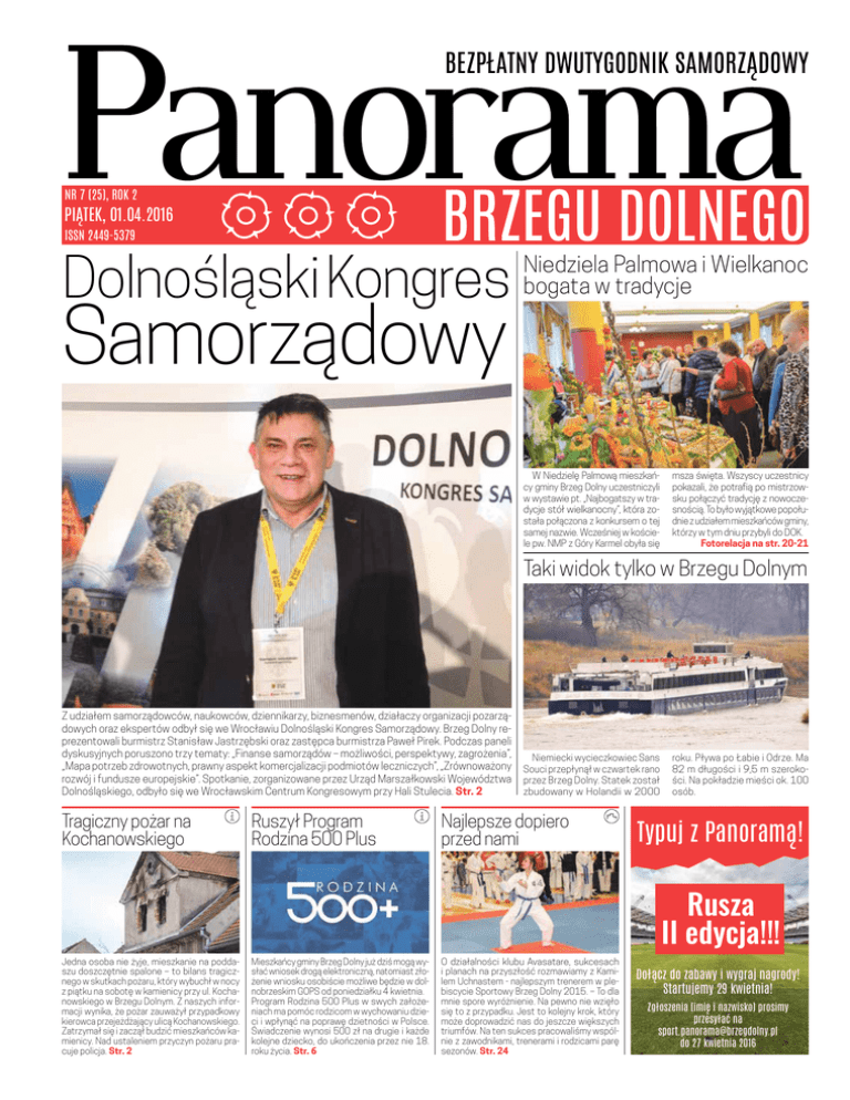 NR 7 (25), ROK 2 PIĄTEK, 01.04.2016 ISSN 2449-5379 Dolnośląski Kongres Samorządowy Niedziela Palmowa i Wielkanoc bogata w tradycje W Niedzielę Palmową mieszkańcy gminy Brzeg Dolny uczestniczyli w wystawie pt. „Najbogatszy w tradycje stół wielkanocny”, która została połączona z konkursem o tej samej nazwie. Wcześniej w kościele pw. NMP z Góry Karmel obyła się msza święta. Wszyscy uczestnicy pokazali, że potrafią po mistrzowsku połączyć tradycję z nowoczesnością. To było wyjątkowe popołudnie z udziałem mieszkańców gminy, którzy w tym dniu przybyli do DOK. Fotorelacja na str. 20-21 Taki widok tylko w Brzegu Dolnym Z udziałem samorządowców, naukowców, dziennikarzy, biznesmenów, działaczy organizacji pozarządowych oraz ekspertów odbył się we Wrocławiu Dolnośląski Kongres Samorządowy. Brzeg Dolny reprezentowali burmistrz Stanisław Jastrzębski oraz zastępca burmistrza Paweł Pirek. Podczas paneli dyskusyjnych poruszono trzy tematy: „Finanse samorządów – możliwości, perspektywy, zagrożenia”, „Mapa potrzeb zdrowotnych, prawny aspekt komercjalizacji podmiotów leczniczych”, „Zrównoważony rozwój i fundusze europejskie”. Spotkanie, zorganizowane przez Urząd Marszałkowski Województwa Dolnośląskiego, odbyło się we Wrocławskim Centrum Kongresowym przy Hali Stulecia. Str. 2 Tragiczny pożar na Kochanowskiego Ruszył Program Rodzina 500 Plus Niemiecki wycieczkowiec Sans Souci przepłynął w czwartek rano przez Brzeg Dolny. Statek został zbudowany w Holandii w 2000 Najlepsze dopiero przed nami roku. Pływa po Łabie i Odrze. Ma 82 m długości i 9,5 m szerokości. Na pokładzie mieści ok. 100 osób. Typuj z Panoramą! Rusza II edycja!!! Jedna osoba nie żyje, mieszkanie na poddaszu doszczętnie spalone – to bilans tragicznego w skutkach pożaru, który wybuchł w nocy z piątku na sobotę w kamienicy przy ul. Kochanowskiego w Brzegu Dolnym. Z naszych informacji wynika, że pożar zauważył przypadkowy kierowca przejeżdżający ulicą Kochanowskiego. Zatrzymał się i zaczął budzić mieszkańców kamienicy. Nad ustaleniem przyczyn pożaru pracuje policja. Str. 2 Mieszkańcy gminy Brzeg Dolny już dziś mogą wysłać wniosek drogą elektroniczną, natomiast złożenie wniosku osobiście możliwe będzie w dolnobrzeskim GOPS od poniedziałku 4 kwietnia. Program Rodzina 500 Plus w swych założeniach ma pomóc rodzicom w wychowaniu dzieci i wpłynąć na poprawę dzietności w Polsce. Świadczenie wynosi 500 zł na drugie i każde kolejne dziecko, do ukończenia przez nie 18. roku życia. Str. 6 O działalności klubu Avasatare, sukcesach i planach na przyszłość rozmawiamy z Kamilem Uchnastem - najlepszym trenerem w plebiscycie Sportowy Brzeg Dolny 2015. – To dla mnie spore wyróżnienie. Na pewno nie wzięło się to z przypadku. Jest to kolejny krok, który może doprowadzić nas do jeszcze większych triumfów. Na ten sukces pracowaliśmy wspólnie z zawodnikami, trenerami i rodzicami parę sezonów. Str. 24 Dołącz do zabawy i wygraj nagrody! Startujemy 29 kwietnia! Zgłoszenia (imię i nazwisko) prosimy przesyłać na [email protected] do 27 kwietnia 2016 2 PIĄTEK, 01.04.2016 W zeszłym tygodniu Burmistrz Stanisław Jastrzębski oraz zastępca burmistrza Paweł Pirek wzięli udział w Dolnośląskim Kongresie Samorządowym. Spotkanie odbyło się we Wrocławskim Centrum Kongresowym przy Hali Stulecia. potkanie zostało zorganizowane przez Urząd Marszałkowski Województwa Dolnośląskiego. Kongres, w którym udział wzięło blisko 500 przedstawicieli samorządów, naukowców, dziennikarzy, biznesmenów, działaczy organizacji pozarządowych oraz ekspertów był wspaniałą platformą do wymiany doświadczeń oraz rozmów dotyczących kondycji samorządów. S Obrady Kongresu odbywały się w pięciu ścieżkach tematycznych. Podczas paneli dyskusyjnych omawiano kwestie związane z efektywnym wykorzystywaniem funduszy europejskich, finanse samorządów, ochronę zdrowia oraz edukację. Rozmawiano także o kwestiach ustrojowych związanych z zapowiadanymi przez rząd zmianami w ustawie o samorządzie terytorialnym. Kongres poprowadził dziennikarz Piotr Kraśko. Wśród uczestników znaleźli się m.in. Cezary Przybylski, Ewa Mańkowska, Jerzy Michalak, Rafał Dutkiewicz, Michał Jaros oraz wielu samorządowców z Dolnego Śląska. Red. Kongres był okazją do rozmów i spotkań Panele dyskusyjne cieszyły się zainteresowanie uczestników Kongresu fot. Panorama Dolnośląski Kongres Samorządowy Jedna osoba nie żyje, mieszkanie na poddaszu doszczętnie spalone – to bilans tragicznego w skutkach pożaru, który wybuchł w nocy z piątku na sobotę w kamienicy przy ul. Kochanowskiego w Brzegu Dolnym. naszych informacji wynika, że pożar zauważył przypadkowy kierowca przejeżdżający ulicą Kochanowskiego. Zatrzymał się i zaczął budzić mieszkańców kamienicy. - Zgłoszenie otrzymaliśmy o godzinie 00:54. Osoba, która powiadomiła służby dzwoniła pod numer 112 – mówi bryg. Arkadiusz Cytawa, dowódca jednostki ratowniczo-gaśniczej PSP Wołów. Pierwsi na miejsce zdarzenia przyjechali strażacy z OSP Brzeg Dolny, a następnie dwa zastępy PSP z Wołowa. Dodam, że w tym samym czasie mieliśmy pożar słomy w Poga- Z lewie, ale natychmiast jednostki zostały skierowane do Brzegu Dolnego. W chwili przyjazdu strażacy z OSP zastali rozwinięty pożar w mieszkaniu na poddaszu, płomienie wydobywały się na zewnątrz – dodaje bryg. Cytawa. W budynku przebywali ludzie i działania strażaków były ukierunkowane na bezpieczną ewakuację mieszkańców oraz opanowanie pożaru. - Mieliśmy informacje, że w mieszkaniu obok może przebywać czteroosobowa rodzina. Pierwszy dotarł do nich Krystian Kucharski, strażak z OSP, który jest również zawodowym strażakiem w PSP Wołów. W międzyczasie strażacy przystąpili do opanowania pożaru i oddymienia klatki schodowej, by bezpiecznie wyprowad