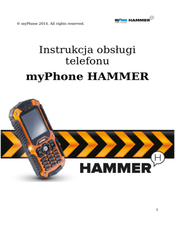 © myPhone 2014. All rights reserved. Instrukcja obsługi telefonu myPhone HAMMER 1 © myPhone 2014. All rights reserved. Dziękujemy za wybór telefonu myPhone Hammer. Prosimy o dokładne zapoznanie się z niniejszą instrukcją obsługi. Telefon myPhone Hammer przeznaczony jest do użytku w sieci GSM o częstotliwości 900/1800MHz. Wytrzymała, wodoodporna i pyłoszczelna obudowa, kontrastowy, kolorowy wyświetlacz, latarka, Bluetooth, Dual SIM - to znaki szczególne telefonu myPhone Hammer. 2 © myPhone 2014. All rights reserved. BEZPIECZEŃSTWO Zapoznaj się uważnie z podanymi tu wskazówkami. Nieprzestrzeganie tych zaleceń może być niebezpieczne lub niezgodne z prawem. NIE RYZYKUJ Nie włączaj urządzenia w w których zabrania się z telefonów komórkowych, gdy może to spowodować lub inne zagrożenia. miejscach, korzystania ani wtedy, zakłócenia BEZPIECZEŃSTWO W RUCHU DROGOWYM Nie należy korzystać z telefonu podczas prowadzenia pojazdów. 3 © myPhone 2014. All rights reserved. ZAKŁÓCENIA Wszystkie urządzenia bezprzewodowe mogą być podatne na zakłócenia, które z kolei mogą wpływać na jakość wykonywanych połączeń. OBSZARY O OGRANICZONYM DOSTĘPIE Wyłącz urządzenie w samolocie, ponieważ może ono zakłócać pracę znajdujących się w nim urządzeń. Telefon może zakłócać pracę sprzętu medycznego w szpitalach i placówkach ochrony zdrowia. Należy stosować się do wszelkiego rodzaju zakazów, przepisów i ostrzeżeń przekazywanych przez personel medyczny. 4 © myPhone 2014. All rights reserved. PROFESJONALNY SERWIS Ten produkt może być naprawiany oraz mieć aktualizowane oprogramowanie tylko i wyłącznie przez wykwalifikowany serwis firmy myPhone lub jego autoryzowany odpowiednik. Naprawa telefonu przez niewykwalifikowany serwis lub przez nieautoryzowany punkt serwisowy grozi uszkodzeniem telefonu i utratą gwarancji. AKUMULATOR I AKCESORIA Należy unikać wystawiania akumulatora na działanie bardzo niskich lub bardzo wysokich temperatur (poniżej 0°C / 32°F lub powyżej 40°C / 104°F). Ekstremalne temperatury mogą mieć wpływ na pojemność i żywotność akumulatora. Należy unikać kontaktu akumulatora z płynami i metalowymi przedmiotami. 5 © myPhone 2014. All rights reserved. Taki kontakt może do całkowitego lub uszkodzenia akumulatora. doprowadzić częściowego Akumulatora należy używać tylko zgodnie z jego przeznaczeniem. Nieużywaną ładowarkę należy odłączać od zasilania sieciowego. Zbyt długie ładowanie akumulatora może spowodować jego uszkodzenie. W związku z tym, nie należy jednorazowo ładować akumulatora dłużej niż 3 dni. Należy używać tylko oryginalnych akcesoriów marki myPhone dostępnych w zestawie z telefonem. 6 © myPhone 2014. All rights reserved. WODOODPORNOŚĆ I PYŁOSZCZELNOŚĆ Pomimo tego, że telefon myPhone Hammer jest w pewnym stopniu zabezpieczony przed działaniem wody, należy unikać celowego zanurzania go w jakiejkolwiek cieczy. W celu zachowania pyłoszczelności telefonu należy upewnić się, że wszystkie pokrywy telefonu są prawidłowo oraz szczelnie zamknięte. POŁĄCZENIA ALARMOWE Wykonywanie połączeń alarmowych z telefonu może nie być możliwe na niektórych obszarach lub w niektórych okolicznościach. 7 © myPhone 2014. All rights reserved. Zaleca się, aby znaleźć alternatywny sposób powiadamiania służb ratowniczych w przypadku wyjazdu na niezagospodarowane lub odległe tereny. DZIECI Telefon nie jest zabawką. Przechowuj urządzenie oraz jego akcesoria z dala od zasięgu dzieci. KORZYSTANIE Z INSTRUKCJI OBSŁUGI Przed przystąpieniem do korzystania z urządzenia należy zapoznać się z informacjami o środkach ostrożności oraz instrukcją obsługi telefonu. W opisach zamieszczonych w tej instrukcji obsługi uwzględniono domyślne ustawienia telefonu. 8 © myPhone 2014. All rights reserved. Najnowszą wersję instrukcji obsługi można znaleźć na stronie internetowej firmy: www.myphone.pl. W zależności od zainstalowanej wersji oprogramowania, dostawcy usług, karty SIM lub kraju, niektóre z opisów zamieszczonych w tej instrukcji mogą nie odpowiadać funkcjom telefonu. W zależności od kraju, operatora, karty SIM czy wersji modelu, telefon i akcesoria mogą wyglądać inaczej niż na ilustracjach zamieszczonych w niniejszej instrukcji. OSTRZEŻENIE Telefon myPhone Hammer posiada certyfikat IP67, zgodnie z którym jest on pyłoszczelny i wodoodporny. 9 © myPhone 2014. All rights reserved. Aby ochrona telefonu przed wilgocią lub zapyleniem była zachowana powinien on być używany zgodnie z instrukcją obsługi oraz zachowane muszą być szczególne środki, które zapobiegną uszkodzeniu obudowy telefonu i wszelkich gumowych uszczelek. Ważne jest również aby klapka baterii była zamontowana prawidłowo – bez żadnych szczelin i z poprawnie ułożoną uszczelką oraz aby na membranach głośników nie było żadnych zanieczyszczeń (np. opiłków metalu). Radzimy także aby bez powodu telefonu nie zanurzać w wodzie. W przypadku stwierdzenia niewłaściwej eksploatacji w wyniku nieprzestrzegania powyższych zasad reklamacje dotyczące nie spełniania przez telefon ochrony przed zawilgoceniem oraz zapyleniem nie bedą ralizowane. 10 © myPhone 2014. All rights reserved. Producent: myPhone Sp. z o.o. ul. Krakowska 119 50-428 Wrocław Polska Infolinia: (+48 71) 71 77 400 E-mail: [email protected] Strona internetowa: www.myphone.pl 11 © myPhone 2014. All rights reserved. Spis treści Spis treści .....................................................12 Zawartość zestawu myPhone Hammer ........16 Parametry techniczne telefonu myPhone Hammer ........................................................17 1. Wygląd telefonu – wprowadzenie ...........19 Widok telefonu oraz jego klawisze i funk19 Włączanie i wyłączanie telefonu ...............21 Montaż karty SIM, karty pamięci oraz akumulatora...............................................