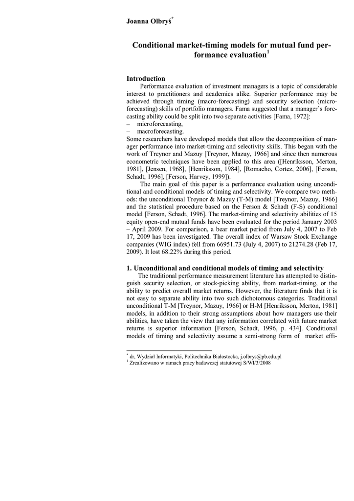 Joanna Olbryś* Conditional market-timing models for mutual fund performance evaluation1 Introduction Performance evaluation of investment managers is a topic of considerable interest to practitioners and academics alike. Superior performance may be achieved through timing (macro-forecasting) and security selection (microforecasting) skills of portfolio managers. Fama suggested that a manager’s forecasting ability could be split into two separate activities [Fama, 1972]: – microforecasting, – macroforecasting. Some researchers have developed models that allow the decomposition of manager performance into market-timing and selectivity skills. This began with the work of Treynor and Mazuy [Treynor, Mazuy, 1966] and since then numerous econometric techniques have been applied to this area ([Henriksson, Merton, 1981], [Jensen, 1968], [Henriksson, 1984], [Romacho, Cortez, 2006], [Ferson, Schadt, 1996], [Ferson, Harvey, 1999]). The main goal of this paper is a performance evaluation using unconditional and conditional models of timing and selectivity. We compare two methods: the unconditional Treynor & Mazuy (T-M) model [Treynor, Mazuy, 1966] and the statistical procedure based on the Ferson & Schadt (F-S) conditional model [Ferson, Schadt, 1996]. The market-timing and selectivity abilities of 15 equity open-end mutual funds have been evaluated for the period January 2003 – April 2009. For comparison, a bear market period from July 4, 2007 to Feb 17, 2009 has been investigated. The overall index of Warsaw Stock Exchange companies (WIG index) fell from 66951.73 (July 4, 2007) to 21274.28 (Feb 17, 2009). It lost 68.22% during this period. 1. Unconditional and conditional models of timing and selectivity The traditional performance measurement literature has attempted to distinguish security selection, or stock-picking ability, from market-timing, or the ability to predict overall market returns. However, the literature finds that it is not easy to separate ability into two such dichotomous categories. Traditional unconditional T-M [Treynor, Mazuy, 1966] or H-M [Henriksson, Merton, 1981] models, in addition to their strong assumptions about how managers use their abilities, have taken the view that any information correlated with future market returns is superior information [Ferson, Schadt, 1996, p. 434]. Conditional models of timing and selectivity assume a semi-strong form of market effi* 1 dr, Wydział Informatyki, Politechnika Białostocka, [email protected] Zrealizowano w ramach pracy badawczej statutowej S/WI/3/2008 2 Joanna Olbryś ciency. The idea is to distinguish “market-timing” based on public information from market-timing information that is superior to the lagged information variables (the F-S model [Ferson, Schadt, 1996] or the F-H model [Ferson, Harvey, 1999]). 1.1. The Treynor-Mazuy (T-M) unconditional model A classic unconditional market-timing model is the quadratic regression of Treynor and Mazuy (T-M model) [Treynor, Mazuy, 1966]: 2 rP,t P P rM ,t P rM ,t P,t (1) where: rP,t R P ,t R F ,t is the excess return on the portfolio P in period t , rM ,t R M ,t R F ,t is the excess return on market portfolio M in period t , R P,t is the one-period return on the portfolio P , R M ,t is the one-period return on the market portfolio M , R F ,t is the one-period return on riskless securities, P measures selectivity skills of the portfolio’s P manager, P is the systematic risk of the portfolio P , P measures market-timing skills of the portfolio’s P manager, P,t is a residual term, with the following standard CAPM conditions: E P ,t 0; E P ,t P ,t 1 0; If the portfolio manager has the ability to forecast security prices, the intercept P in equation (1) will be positive. On one hand, a passive strategy (random buy-and-hold policy) can be expected to yield a zero intercept. On the other hand, if the manager is doing worse than a random selection buy-and-hold policy, P will be negative. If a mutual fund manager increases (decreases) the market exposure of the portfolio prior to a market increase (decrease) then the portfolio return will be a convex function of the market return and P will be positive. The size of the estimate ˆ P informs about the manager’s market skills. Empirical results obtained using the T-M technique do not support the hypothesis that mutual fund managers are able to follow an investment strategy that successfully times the return on the market portfolio. The results show neutral or negative performance for mutual fund managers for the period January 2003 – January 2008 in the case of 15 Polish equity open-end mutual funds [Olbryś, 2008a]. In general, the fact that Polish managers are not really successful as market timers is consistent with most of the literature on mutual fund performance ([Henriksson, 1984], [Fletcher, 1995], [Kao, Cheng, Chan, 1998], [Romacho, Cortez, 2006]). Conditional market-timing models for mutual fund performance evaluation 3 1.2. The Ferson – Schadt (F-S) conditional model Ferson and Schadt derive a conditional version of the Treynor-Mazuy model [Ferson, Schadt, 1996, p 435]: 2 rP,t P P rM ,t ' P z t 1 rM ,t P rM ,t P ,t (2) where: rP,t is the excess return on the portfolio P in period t , rM ,t is the excess return on market portfolio M in period t , P measures selectivity skills of the portfolio’s P manager, P is the systematic risk of the portfolio P , P is the coefficient vector that captures the response of the manager’s beta to the public information Z t 1 , Z t 1 is a vector of lagged instrumental variables for the information available at time t 1 , z t 1 Z t 1 E Z is a vector of the deviations of Z t 1 from the unconditional means, P is the coefficient that measures the sensitivity of the manager’s beta to the private market-timing signal, P,t is a residual term, with the following standard CAPM conditions: E P ,t 0; E P ,t , P ,t 1 0; The regression (2) may also be interpreted as an unconditional mult