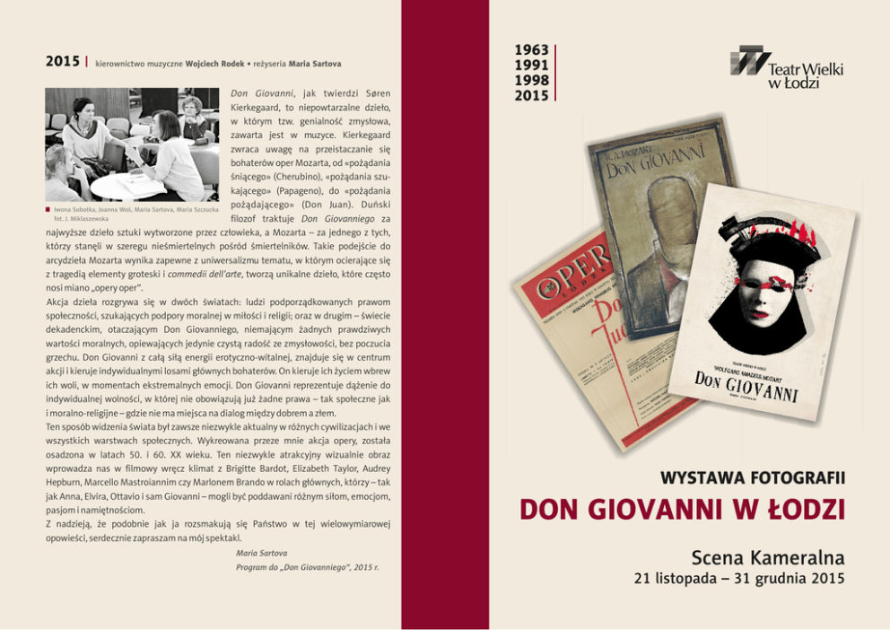 2015 kierownictwo muzyczne Wojciech Rodek • reżyseria Maria Sartova Don Giovanni, jak twierdzi Søren Kierkegaard, to niepowtarzalne dzieło, w którym tzw. genialność zmysłowa, zawarta jest w muzyce. Kierkegaard zwraca uwagę na przeistaczanie się bohaterów oper Mozarta, od «pożądania śniącego» (Cherubino), «pożądania szukającego» (Papageno), do «pożądania pożądającego» (Don Juan). Duński Iwona Sobotka, Joanna Woś, Maria Sartova, Maria Szczucka fot. J. Miklaszewska filozof traktuje Don Giovanniego za najwyższe dzieło sztuki wytworzone przez człowieka, a Mozarta – za jednego z tych, którzy stanęli w szeregu nieśmiertelnych pośród śmiertelników. Takie podejście do arcydzieła Mozarta wynika zapewne z uniwersalizmu tematu, w którym ocierające się z tragedią elementy groteski i commedii dell'arte, tworzą unikalne dzieło, które często nosi miano „opery oper”. Akcja dzieła rozgrywa się w dwóch światach: ludzi podporządkowanych prawom społeczności, szukających podpory moralnej w miłości i religii; oraz w drugim – świecie dekadenckim, otaczającym Don Giovanniego, niemającym żadnych prawdziwych wartości moralnych, opiewających jedynie czystą radość ze zmysłowości, bez poczucia grzechu. Don Giovanni z całą siłą energii erotyczno-witalnej, znajduje się w centrum akcji i kieruje indywidualnymi losami głównych bohaterów. On kieruje ich życiem wbrew ich woli, w momentach ekstremalnych emocji. Don Giovanni reprezentuje dążenie do indywidualnej wolności, w której nie obowiązują już żadne prawa – tak społeczne jak i moralno-religijne – gdzie nie ma miejsca na dialog między dobrem a złem. Ten sposób widzenia świata był zawsze niezwykle aktualny w różnych cywilizacjach i we wszystkich warstwach społecznych. Wykreowana przeze mnie akcja opery, została osadzona w latach 50. i 60. XX wieku. Ten niezwykle atrakcyjny wizualnie obraz wprowadza nas w filmowy wręcz klimat z Brigitte Bardot, Elizabeth Taylor, Audrey Hepburn, Marcello Mastroiannim czy Marlonem Brando w rolach głównych, którzy – tak jak Anna, Elvira, Ottavio i sam Giovanni – mogli być poddawani różnym siłom, emocjom, pasjom i namiętnościom. Z nadzieją, że podobnie jak ja rozsmakują się Państwo w tej wielowymiarowej opowieści, serdecznie zapraszam na mój spektakl. 1963 1991 1998 2015 . Maria Sartova Program do „Don Giovanniego”, 2015 r. WYSTAWA FOTOGRAFII DON GIOVANNI W ŁODZI Scena Kameralna 21 listopada – 31 grudnia 2015 Szanowni Państwo, zapraszamy do obejrzenia wystawy w Sali Kameralnej Teatru Wielkiego w Łodzi prezentującej inscenizacje arcydzieła Wolfganga Amadeusza Mozarta „Don Giovanni” w naszym teatrze. Po raz pierwszy, jeszcze w czasach Opery Łódzkiej, sięgnął po ten tytuł Zygmunt Latoszewski a reżyserii podjął się wybitny śpiewak, Antoni Majak. Na kolejną inscenizację czekaliśmy do 1991 r. – wówczas premierę przygotowali: dyrygent Aleksander Tracz i reżyser Marek WeissGrzesiński. W lutym 1998 roku odbyła się premiera „Don Giovanniego” zrealizowana w inscenizacji Adama Hanuszkiewicza i pod kierownictwem muzycznym José Marii Florêncio Jùniora. Każda z tych premier to zupełnie inne przedstawienie o innym temperamencie muzycznym, to różne interpretacje tego samego dzieła. Co myśleli o „Don Giovannim” twórcy tych premier, jakie widzieli w nim przesłanie? i w spustoszeniach, które sieje w ludzkich duszach. Z perspektywy cynizmu wynikałaby z tego działania farsa, ale u Mozarta rezultat zwie się dramma giocoso, a więc jednak dramat, bo w Mozarcie oświeconym wolnomularzu nieomylnie góruje zmysł etyczny, moralność najwyższych praw życia. Te prawa są dla twórcy Don Juana prawdą życia i jej podlegają jego bohaterowie. Historyczna geneza tematu, jak powiedzieliśmy wyżej, nie tylko dla nas, ale także dla Mozarta nie była rzeczą istotną. Stworzył dzieło współczesne z ducha, a właściwie bezczasowe z punktu widzenia realiów scenicz- 1963 kierownictwo muzyczne i inscenizacja Zygmunt Latoszewski • reżyseria Antoni Majak nych. Oprawa teatralnej akcji tego klejnotu była zapewne wtedy w XVIII w. dobrze znaną i lubianą (...) Bezpośrednim powodem, dla którego Mozart zajął się kompozycją Don Juana było zamówienie u niego nowej opery przez dyrektora włoskiej trupy operowej w Pradze Bondiniego. Trupa grała z powodzeniem Wesele Figara, które zdobyło w czeskiej stolicy taką popularność, że przedsiębiorca teatru obiecywał sobie duży sukces kasowy także poprzez wystawienie następnego dzieła Mozarta. Podsunięty przez librecistę Da Pontego projekt Don Juana krył w sobie szanse powodzenia, bo temat był popularny wśród publiczności spodziewającej się dobrej zabawy w oglądaniu perypetii sewilskiego uwodziciela, którego w końcu powinno pochłonąć prawdziwe piekło, ogniem ziejące. Jadwiga Pietraszkiewicz, Stanisław Heimberger, Michał Marchut fot. H. Śmigacz Był to ulubiony trick jeszcze z epoki baroku. Każdy szanujący się teatr miał nawet odpowiednie dekoracje, przedstawiające otchłanie piekielne. Mozart człowiek Oświecenia nie interesował się mistyką nieba i piekła, był realistą, widzącym ludzi takimi, jakimi są z ich radościami i tragicznymi konfliktami i właśnie w świecie Don Juana, tego demona niepohamowanej żądzy i użycia wyczuwał ogromne napięcie wszelkich ludzkich namiętności, krzyżujących się w działaniu zarówno bohatera jak i osób z nim związanych. Toteż w jego operze nie ma postaci symbolicznych, są tylko ludzie: szlachetni i pospolici, odważni i tchórzliwi, wytworni i prości. Wszędzie w każdym takcie muzyki Mozarta odzwierciedlają się charaktery i uczucia ludzkie z bezprzykładną wyrazistością z niczym nie przysłoniętą jasnością. Przemawia serce ludzkie, odzywa się trzeźwo kalkulujący rozum pełen przyziemnej rachuby. Nade wszystko zaś działa wieczny Eros