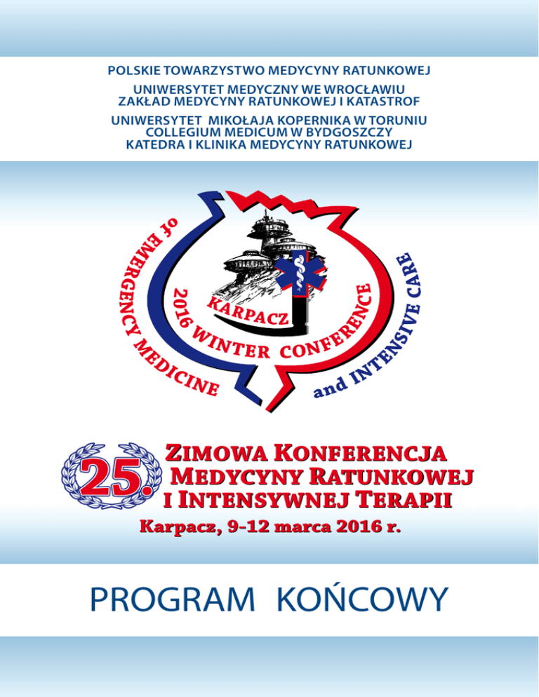 POLSKIE TOWARZYSTWO MEDYCYNY RATUNKOWEJ UNIWERSYTET MEDYCZNY WE WROCŁAWIU ZAKŁAD MEDYCYNY RATUNKOWEJ I KATASTROF UNIWERSYTET MIKOŁAJA KOPERNIKA W TORUNIU COLLEGIUM MEDICUM W BYDGOSZCZY KATEDRA I KLINIKA MEDYCYNY RATUNKOWEJ ZIMOWA KONFERENCJA MEDYCYNY RATUNKOWEJ I INTENSYWNEJ TERAPII Karpacz, 9-12 marca 2016 r. PROGRAM KOŃCOWY PL 25. ZIMOWA KONFERENCJA MEDYCYNY RATUNKOWEJ I INTENSYWNEJ TERAPII Karpacz, 9–12 marca 2016 r. PL KOMITET NAUKOWY Przewodniczący: Juliusz Jakubaszko (PL) Wiceprzewodniczący: Jan Godziński (PL) Andrzej Kűbler (PL) Członkowie: Andrzej Basiński (PL) Terrence Mulligan (USA) Ashley Bean (USA) Adam Nogalski (PL) Gautam Bodiwala (UK) Dan O’Brien (USA) Basar Cander (TR) Timothy Rainer (UK) James Ducharme (CDN ) Ewa Raniszewska (PL) Michał Gaca (PL) Krystyn Sosada (PL) Dariusz Kozłowski (PL) Piotr Wiland (PL) Rebecca Liggin (USA) Andrzej Witkowski (PL) Jerzy Ładny (PL) Andrzej Zawadzki (PL) Lisa Moreno-Walton (USA) Siedziba Zarządu Głównego Polskiego Towarzystwa Medycyny Ratunkowej Zakład Medycyny Ratunkowej i Katastrof Uniwersytet Medyczny we Wrocławiu 50-345 Wrocław, ul. Bujwida 44a tel. +48 / 71 328 60 45, fax. +48 / 71 328 60 16 [email protected] www.medycynaratunkowa.wroc.pl Konto Towarzystwa: BZ WBK 35 O/Wrocław 22 1500 1793 1217 9003 0975 0000 KOMITET ORGANIZACYJNY ZAPROSZENI WYKŁADOWCY, MODERATORZY I INSTRUKTORZY WARSZTATÓW TOWARZYSZĄCYCH Nino Butskhrikidze (GE) Goutam Chourasia (PL) Radosław Drozd (PL) Wojciech Gaszyński (PL) Izabela Godlewska (PL) Mariusz Goniewicz (PL) Giorgi Gotsadze (GE) Kinga Grobelska (PL) Joanna Jakubaszko-Jabłońska (PL) Rakesh Jalali (PL) Krzysztof Jarzyński (PL) Tomasz Jurek (PL) 2 Anna Koczaj (PL) Ks. Rafał Kowalski (PL) Riccardo Leto (B) Marek Maślicki (PL) Piotr Miśkiewicz (PL) Kinga Niewińska (PL) Anna Pokryszko-Dragan (PL) Marta Rorat (PL) Lilianna Styka (PL) Ks. Artur Szela (PL) Corey Warf (USA) Karpacz, 9–12 marca 2016 r. Przewodniczący: prof. dr hab. Juliusz Jakubaszko Wiceprzewodniczący: prof. dr hab. Jan Godziński Członkowie: mgr Aleksandra Berdzińska dr Lilianna Styka lek. Goutam Chourasia lek. Michał Rutkowski dr Jadwiga Jakubaszko Ewa Polak dr Joanna Jakubaszko-Jabłońska Agnieszka Szklarz mgr Marta Kwiatoń mgr Agnieszka Werkowska lek. Jędrzej Machowiak dr Kinga Niewińska Studenckie Koło Naukowe lek. Tomasz Sikora Medycyny Ratunkowej UMW Sekretariat Konferencji: Agnieszka Szklarz, Ewa Polak, Halina Kisielewska Zakład Medycyny Ratunkowej i Katastrof UM we Wrocławiu 50-345 Wrocław, ul. Bujwida 44a tel. +48 / 71 328 60 45, fax. +48 / 71 328 60 16 [email protected] 25. ZIMOWA KONFERENCJA MEDYCYNY RATUNKOWEJ I INTENSYWNEJ TERAPII 3 PL 25. ZIMOWA KONFERENCJA MEDYCYNY RATUNKOWEJ I INTENSYWNEJ TERAPII INFORMACJE OGÓLNE MIEJSCE OBRAD: Mercure Karpacz Resort – Karpacz, ul. Obrońców 5 tel./fax. +48/ 75 752 70 37 SEKRETARIAT KONFERENCJI: Podczas trwania Konferencji Sekretariat będzie się znajdował w holu głównym Mercure Karpacz Resort – Karpacz, ul. Obrońców 5 tel./fax. +48/ 75 752 70 37 GODZINY URZĘDOWANIA: Środa: 11.00 – 20.00 Czwartek, Piątek: 8.00 – 18.00 Sobota: 8.00 – 11.00 JĘZYK OBRAD: polski, angielski INFORMACJE ORGANIZACYJNE IDENTYFIKATORY: Na salę obrad i wystawy oraz imprezy towarzyszące wstęp będą mieli wyłącznie posiadacze identyfikatorów UWAGA! W przypadku zgubienia identyfikatora koszt wyrobienia nowego wynosi równowartość opłaty konferencyjnej! PL Karpacz, 9–12 marca 2016 r. PLAKATY: SESJA PLAKATOWA Piątek, 11 marca 2016 r. godz. 16.45–18.15 Informujemy, że autorzy plakatów mogą udostępnić swoje prace uczestnikom Konferencji od 10 marca (czwartek) od godz. 11.00. Twórcy będą mogli zabrać materiały z miejsca wystawy do 12 marca (sobota) do godziny 12.00. Bardzo prosimy o przygotowanie plakatu w formie papierowej o wymiarach: 70 cm szerokości i 100 cm wysokości. PRZYGOTOWANIE WYSTĄPIEŃ: Wystąpienia przewidziane są w językach: angielskim, polskim. Preferowany język prezentacji to angielski. Przy prezentacji po polsku wskazane jest opracowanie slajdów w języku angielskim. Materiały do prezentacji, przygotowane w formie elektronicznej mają być dostarczone do obsługi technicznej w pomieszczeniu audytorium co najmniej na dwie godziny przed wystąpieniem lub w dniu poprzedzającym w przypadku sesji porannych. Nie przewiduje się prezentacji z własnego laptopa Autora. PRACE I STRESZCZENIA: Nadesłane prace i streszczenia są opublikowane w Polish Journal of Emergency Medicine PUNKTY EDUKACYJNE: Uczestnik Konferencji otrzymuje następujące punkty edukacyjne: Lekarz – 23 punkty Ratownik medyczny – 8 punktów Uczestnik warsztatów – 2 punkty edukacyjne 4 Karpacz, 9–12 marca 2016 r. 25. ZIMOWA KONFERENCJA MEDYCYNY RATUNKOWEJ I INTENSYWNEJ TERAPII 5 PL 25. ZIMOWA KONFERENCJA MEDYCYNY RATUNKOWEJ I INTENSYWNEJ TERAPII WYDARZENIA SPECJALNE PODCZAS SYMPOZJUM Środa — 9.03.2016 r. 19.00 KOKTAJL POWITALNY Karpacz, 9–12 marca 2016 r. PL JAZDY TESTOWE MERCEDES-BENZ Autoryzowany Dealer Mercedes-Benz Duda-Cars podczas Konferencji zaprezentuje najnowsze modele Mercedes-Benz SUV Na jazdy testowe zapraszamy w środę 9 marca w godzinach 13.30 – 16.30 oraz w czwartek 10 marca w godzinach 9.00 – 14.00 CZWARTEK — 10.03.2016 r. 19.00 KONCERT SYMFONICZNY Filharmonia Dolnośląska w Jeleniej Górze Dawid Runtz – dyrygent Orkiestra Symfoniczna Filharmonii Dolnośląskiej Antonín Dvořák – Serenada d-moll na instrumenty dęte op. 44 Wolfgang Amadeus Mozart – – Serenada B-dur Gran Partita KV 361 Zapewniamy transfer autokarem z hotelu na koncert i z powrotem. Odjazd autokarów sprzed hotelu Mercure Karpacz Resort o godz. 18.10 Koszt udziału w wydarzeniu: 20,00 PLN/osoba PIĄTEK — 11.03.2016 r. 20.00 6 UROCZYSTA KOLACJA Sala bankietowa Mercure Karpacz Resort Karpacz, 9–12 marca 2016 r. 25. ZIMOWA KONFERENCJA MEDYCYNY RATUNKOWEJ I INTENSYWNEJ TERAPII 7 Środa 9.03.2016 13.00 –15.00 Czwartek 10.03.2016 11.30