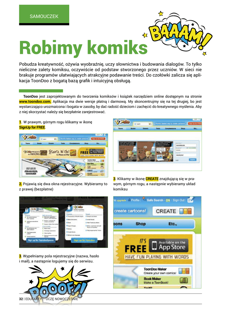 SAMOUCZEK Robimy komiks Pobudza kreatywność, ożywia wyobraźnię, uczy słownictwa i budowania dialogów. To tylko nieliczne zalety komiksu, oczywiście od podstaw stworzonego przez uczniów. W sieci nie brakuje programów ułatwiających atrakcyjne podawanie treści. Do czołówki zalicza się aplikacja ToonDoo z bogatą bazą grafik i intuicyjną obsługą. ToonDoo jest zaprojektowanym do tworzenia komiksów i książek narzędziem online dostępnym na stronie www.toondoo.com. Aplikacja ma dwie wersje płatną i darmową. My skoncentrujmy się na tej drugiej, bo jest wystarczająco urozmaicona i bogata w zasoby, by dać radość dzieciom i zachęcić do kreatywnego myślenia. Aby z niej skorzystać należy się bezpłatnie zarejestrować. 1. W prawym, górnym rogu klikamy w ikonę SignUp for FREE. 2. Pojawią się dwa okna rejestracyjne. Wybieramy to z prawej (bezpłatne) 3. Klikamy w ikonę CREATE znajdującą się w prawym, górnym rogu, a następnie wybieramy układ komiksu 3. Wypełniamy pola rejestracyjne (nazwa, hasło i mail), a następnie logujemy się do serwisu. 32 | EDUFAKTY – UCZĘ NOWOCZEŚNIE MARZEC/KWIECIEŃ 2015 KROK PO KROKU 5. Teraz już pozostaje nam tylko uruchomić wyobraźnię. Wybieramy tło, akcesoria, postaci, a następnie przeciągamy je na plansze komiksu 8. Po skończonej pracy wybieramy w lewym rogu ToonDooMain Menu ikonę SAVE AS i zapisujemy naszą pracę 6. Z bogatego menu możemy wybierać całe historyjki, modyfikować postać lub dołączać rekwizyty. 9. Pojawi się nam okno zapisywania komiksu, które uzupełniamy tytułem, opisem oraz tagami. Zaznaczamy też opcję publikacji (publiczną lub dostępną tylko wybranym użytkownikom). Klikamy ikonę PUBLISH 7. Czas na dialogi. W górnym menu znajdują się chmurki dialogowe. Można je dowolnie modyfikować, zwiększać, obracać, regulować wielkość strzałek www.edufakty.pl | 33 SAMOUCZEK 10. Pojawi się nam kolejne okno, które umożliwi nam otrzymanie adresu www. komiksu – GOTO PAGE lub jego wydrukowanie – PRINT TOON. 12. Dodajemy włosy, uczy, owal twarzy. Możemy też sięgnąć do wirtualnej szafy i ubrać stworzoną przez nas komiksową postać. Wskazówka W dolnej części ekranu znaleźć można menu z dodatkowymi narzędziami: LOCK – blokuje tło dzięki czemu możemy dowolnie modyfikować pozostałe elementy; SHRINK – zmniejszenie wybranego elementu ekranu; ENLARGE – powiększanie dowolnego elementu; CLONE –kopiowanie dowolnego elementu; FLIP – obracanie w pionie elementów; ROTATE – obracanie w dowolną stronę i kąt; TO FRONT – zmiana kolejności wyświetlania obiektów; TO BACK – cofanie elementów; DELETE – usuwanie wybranych części komiksu. 13. Innym ciekawym elementem programu jest OOK MAKER, czyli możliwość tworzenia własnej książki. 11. DoodleR to element dolnego menu. Pozwala na samodzielne rysowanie i kolorowanie. Przede wszystkim na tworzenie własnego avatara. Możemy skorzystać z bogatego menu postaci, zaimplementować dowolną grafikę z komputera lub namalować postać. 14. Aby ją stworzyć wystarczy przeciągnąć wszystkie utworzone uprzednio sceny. Następnie nadać im tytuł i opublikować. Będzie ona dostępna na koncie ToonDoo. Można ją też umieścić na szkolnej stronie internetowej. Wystarczy wkleić wygenerowany uprzednio kod 34 | EDUFAKTY – UCZĘ NOWOCZEŚNIE Miłej MARZEC/KWIECIEŃ zabawy2015 Technologie dla Każdego Tworzymy dla Edukacji