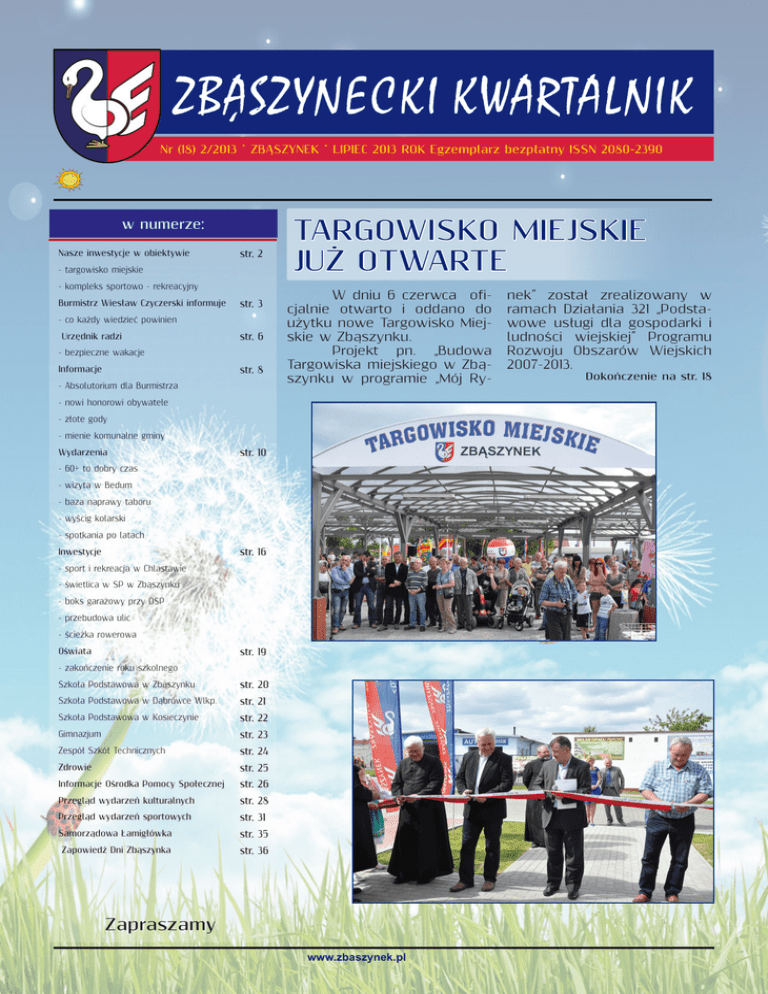 ZBASZYNECKI KWARTALNIK , Nr (18) 2/2013 * ZBĄSZYNEK * LIPIEC 2013 ROK Egzemplarz bezpłatny ISSN 2080-2390 w numerze: Nasze inwestycje w obiektywie str. 2 - targowisko miejskie - kompleks sportowo - rekreacyjny Burmistrz Wiesław Czyczerski informuje str. 3 - co każdy wiedzieć powinien Urzędnik radzi str. 6 - bezpieczne wakacje str. 8 Informacje - Absolutorium dla Burmistrza Targowisko Miejskie Już otwarte W dniu 6 czerwca oficjalnie otwarto i oddano do użytku nowe Targowisko Miejskie w Zbąszynku. Projekt pn. „Budowa Targowiska miejskiego w Zbąszynku w programie „Mój Ry- - nowi honorowi obywatele - złote gody - mienie komunalne gminy Wydarzenia str. 10 - 60+ to dobry czas - wizyta w Bedum - baza naprawy taboru - wyścig kolarski - spotkania po latach str. 16 Inwestycje - sport i rekreacja w Chlastawie - świetlica w SP w Zbąszynku - boks garażowy przy OSP - przebudowa ulic - ścieżka rowerowa str. 19 Oświata - zakończenie roku szkolnego Szkoła Podstawowa w Zbąszynku str. 20 Szkoła Podstawowa w Dąbrówce Wlkp. str. 21 Szkoła Podstawowa w Kosieczynie str. 22 Gimnazjum str. 23 Zespół Szkół Technicznych str. 24 Zdrowie str. 25 Informacje Ośrodka Pomocy Społecznej str. 26 Przegląd wydarzeń kulturalnych str. 28 Przegląd wydarzeń sportowych str. 31 Samorządowa Łamigłówka str. 35 Zapowiedź Dni Zbąszynka str. 36 Zapraszamy www.zbaszynek.pl nek” został zrealizowany w ramach Działania 321 „Podstawowe usługi dla gospodarki i ludności wiejskiej” Programu Rozwoju Obszarów Wiejskich 2007-2013. Dokończenie na str. 18 ZBASZYNECKI KWARTALNIK , Nowe Targowisko kompleks sportoworekreacyjny w Chlastawie ZBASZYNECKI KWARTALNIK , Wydawca: Urząd Miejski w Zbąszynku ul. Rynek 1 66-210 Zbąszynek Tel. 68 384 91 40; fax: 66 384 94 84 Nakład: 1 500 egzemplarzy. Autorzy tekstów i zdjęć: pracownicy Urzędu Miejskiego w Zbąszynku i jednostek organizacyjnych pod redakcją Sekretarza Gminy. e-mail: [email protected] www.zbaszynek.pl 2 www.zbaszynek.pl ZBASZYNECKI KWARTALNIK , BURMISTRZ WIESŁAW CZYCZERSKI INFORMUJE Wiesław Czyczerski CO KAŻDY WIEDZIEĆ POWINIEN Szanowni Mieszkańcy! W tym wydaniu Kwartalnika chciałbym z Państwem podzielić się uwagami i informacjami na cztery tematy. Pierwszy temat to sprawa związana z oddaniem do użytku nowego targowiska miejskiego spełniającego najwyższe standardy wymagane przy tego typu handlowaniu. Koszt wybudowania tego targowiska to ponad 2 miliony złotych, ale myślę, że było warto. Uzyskaliśmy piękny, funkcjonalny obiekt i jednocześnie uporządkowaliśmy teren za Urzędem. Pozostała sprawa uporządkowania terenu po „starym” targowisku. Docierają do mnie różne pomysły i domysły. Teren ten zamierzam przeznaczyć, po uporządkowaniu, na miejsca parkingowe a część na zagospodarowanie zielenią, odpowiednie oświetlenie i postawienie ławek aby zrobić podobne miejsce jak przy lokomotywce. Zdaję sobie sprawę, że niektórym z Państwa ten pomysł nie przypadnie do gustu. Myślę jednak, że mamy coraz więcej samochodów i problemy z ich bezpiecznym parkowaniem. Również Dom Kultury organizuje coraz więcej imprez, na które przyjeżdżacie samochodami i chcecie w pobliżu zaparkować. Drugi temat to ścieżka rowerowa do Dąbrówki Wlkp. Mamy na ten cel wygospodarowane pieniądze, poprzez Lokalną Grupę Działania Regionu Kozła załatwione dofinansowanie z Programu Rozwoju Obszarów Wiejskich, co daje kwotę 450 tys. zł i pozwala ogłosić przetarg na roboty oraz je rozpocząć bezpośrednio po żniwach tak, aby przed zimą uzyskać spodziewany efekt. Z drogi na Dąbrówkę Wlkp. korzysta bardzo wielu rowerzystów obecnie walczących z TIRami o miejsce na jezdni. Ścieżka ta połączy ul. Wojska Polskiego w Zbąszynku z ul. Główną w Dąbrowce Wlkp. Trzeci temat to po raz ko- lejny „śmieci”. Bardzo wiele spraw jest dla Was niejasnych i niezrozumiałych. Wielu z Państwa pyta nas o wyjaśnienia. Jednym z takich pytań to opłaty za śmieci. Opłaty za śmieci wnosi się za cały kwartał tj. za I kwartał do 31 stycznia, za II kwartał do 30 kwietnia, za III kwartał do 31 lipca i za IV kwartał do 31 października danego roku - bez wezwania - jest to nowość wymuszona ustawą. Wpłacamy przelewem na podane konto Nr 62-9660-0007-0010-1710-2000-0020 lub w kasie Samorządowego Zakładu Usług Komunalnych przy ul. PCK w Zbąszynku. Kwotę również naliczamy sami, zgodnie ze złożoną deklaracją. Pytacie również o deklaracje - kolejne deklaracje składamy jeżeli zaszły jakieś zmiany w porównaniu do poprzedniej deklaracji, np. przybyło lub ubyło nam członków gospodarstwa domowego. Nie chcemy lub chcemy segregować śmieci to składamy deklarację. jeżeli nie ma zmian to złożona wcześniej deklaracja jest ważna. Deklaracje możemy zmieniać (składać nową) ile razy tylko zaistnieje taka potrzeba. W tym względzie nie ma limitów - oczywiście z zachowaniem „zdrowego rozsądku”. Czwarty temat to gospodarka wodnościekowa. Kończymy inwestycję związaną z „Uporządkowaniem gospodarki wodnościekowej na terenie Gminy”. Za chwilę tzn. we wrześniu rozpoczniemy dokonywanie przyłączeń. Pozostają jednak posesje (gospodarstwa) bez możliwości podłączenia do kanalizacji. Dla tych Państwa od 2014r. uruchamiamy program pomocowy przy budowaniu oczyszczalni przydomowych, zgodnie z uchwałą Rady Miejskiej i naszymi możliwościami budżetowymi. Planujemy dofinansowania do 3 tys. złotych na gospodarstwo lub lokal, nie więcej jednak niż 50 % kosztów budowy. Przykład: jeśli wspólnota w skład, której wchodzą 4 mieszkania decyduje się na budowę wspólnej oczyszczali przydomowej to otrzyma 12 tys. złotych przy założeniu, że oczyszczalnia kosztuje 24 lub więcej tys. złotych. Myślę, że ten program pozwoli wszystkim mieszkańcom naszej Gminy poczuć się jednakowo ważnymi członkami wspólnoty jaką jest Gmina. Życzę miłych, ciepłych wakacji i ur