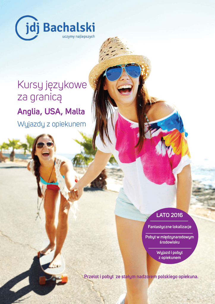 Kursy językowe za granicą Anglia, USA, Malta Wyjazdy z opiekunem LATO 2016 Fantastyczne lokalizacje Pobyt w międzynarodowym środowisku Wyjazd i pobyt z opiekunem Przelot i pobyt ze stałym nadzorem polskiego opiekuna. Dlaczego warto wyjechać na kurs językowy za granicę z JDJ Najwyższy poziom nauczania Znajomi z całego świata Zwiedzanie świata połączone z nauką Najlepsze wakacje w życiu Rozpocznij Swoją największą przygodę z angielskim Wiele dodatkowych atrakcji Doświadczenie na całe życie RABATY Za zgłoszenie dwóch osób 200 PLN dla każdej osoby (łączy się z rabatem przedsprzedażowym) Za zgłoszenie trzech osób 300 PLN dla każdej osoby (łączy się z rabatem przedsprzedażowym) Atrakcyjne rabaty przy zgłoszeniach do 18.12.2015 i do 18.01.2016 (szczegóły w opisie każdej oferty) Kursy językowe LATO 2016 Kurs Grupa wiekowa Daty Cena (bez biletu lotniczego) Ceny w przedsprzedaży *szczegóły przy opisie ofert Anglia 10-13 14-15 16+ 03.07- 17.07 03.07- 24.07 03.07- 31.07 17.07- 31.07 2 tyg- £2300 3 tyg- £3450 4 tyg- £4600 2 tyg- £2000 3 tyg- £3000 4 tyg- £3900 32 lekcje/tydz NAJWYŻSZA JAKOŚĆ! 12-17 26.06- 10.07 26.06- 17.07 26.06- 24.07 10.07- 24.07 2 tyg- £1770 3 tyg- £2600 4 tyg- £3400 2 tyg- £1670 3 tyg- £2500 4 tyg- £3300 Lokalizacja w centrum Londynu, codzienne zwiedzanie miasta 16+ 26.06- 10.07 26.06- 17.07 26.06- 24.07 10.07- 24.07 2 tyg- £1590 3 tyg- £2285 4 tyg- £2990 2 tyg- £1490 3 tyg- £2185 4 tyg- £2890 HIT SEZONU Lokalizacja w centrum Londynu, czas wolny na samodzielne zwiedzanie Oxford 14-17 24.07- 07.08 2 tyg - £1545 2 tyg - £1445 Swoboda w pięknym akademickim mieście Bournemouth (rodziny goszczące) 14- 17 03.07- 17.07 03.07- 24.07 03.07- 31.07 17.07- 31.07 17.07- 07.08 17.07- 14.08 31.07- 14.08 2 tyg- £1245 3 tyg- £1760 4 tyg- £2275 2 tyg- £1145 3 tyg- £1660 4 tyg- £2175 BESTSELLER 2015! Zakwaterowanie u rodziny goszczącej i lokalizacja przy plaży. Queenswood PRESTIGUE Londyn Southbank QUALITY Londyn – taste of London QUALITY QUALITY USA Nowy Jork 10- 17 03.07- 16.07 2 tyg - $2885 2 tyg - $2685 Angielski w mieście Manhatannu, Brooklinu i Wall Street 14-20 17.07- 31.07 2 tyg - $2750 2 tyg - $2600 NOWOŚĆ! Amerykańskie plaże i barbecue 2 tyg - €1395 3 tyg - €1930 4 tyg - €2580 Słońce, plaża i morze. Najbardziej „wakacyjny” kurs QUALITY Floryda Fort Fauderdale QUALITY Malta Malta QUALITY PRESTIGUE 8-11 12-14 13-17 17+ Daty wylotów: 25 czerwca 2, 9, 16, 23, 30 lipca 6 sierpnia, pobyt 2-4 tygodnie 2 tyg - €1465 3 tyg - €2000 4 tyg - €2650 Prestigue - grupa prestigue obejmuje kursy w ośrodkach najwyższej klasy, oferujących najwyższą jakość usług i najbogatszy wybór programów dodatkowych Quality - kursy w atrakcyjnych miejscowościach,, w ośrodkach o podwyższonym standardzie, najczęściej z możliwością dokupienia dodatkowych wycieczek. LATO 2016 WYJAZD Z OPIEKUNEM Kurs w Queenswood Najbardziej intensywny! 32 lekcje na tydzień PRESTIGUE UK Intensywny program w pobliżu brytyjskiej stolicy. Małe klasy oraz duża liczba nauczycieli (1 na 4 uczniów) gwarantują wysoką jakość nauczania. W ofercie szkoły jest również możliwość skorzystania ze sportowego programu Pro Sport. Pod okiem profesjonalnych trenerów uczestnicy mogą podnieść umiejętności z tenisa, golfa, piłki nożnej i jazdy konnej. NAJWYŻSZA JAKOŚĆ Terminy 03.07-17.07 (2 tygodnie) 03.07-24.07 (3 tygodnie) 03.07-31.07 (4 tygodnie) 17.07-31.07 (2 tygodnie) Wiek 10-13, 14-15, 16+ Liczba lekcji 32/tydzień Lokalizacja Queenswood znajduje się 45 min od centrum Londynu. Szkoła posiada duże pola do gry w golfa, 24 korty tenisowe, ogrzewany basen kryty (25 m), salę gimnastyczną, bogatą bibliotekę, fantastyczne pracownie tematyczne i artystyczne, jak również teatr. Program pozalekcyjny Warsztaty pozalekcyjne (2x45 min) opcja 1: tworzenie filmu, teatr,język potoczny, dziennikarstwo i twórcze pisanie, projektowanie ubrań, zdrowie i fitness opcja 2: przygotowanie do egzaminów językowych, angielski biznesowy, debaty, atrakcje w Brytanii Wycieczki (2 /tydzień): Wycieczki zorganizowane są według bloków tematycznych i dostosowane są do wieku uczniów. Przykładowe wycieczki: Muzeum historii naturalnej, Madam Tussaud’s, Windsor Castle Cena (obejmuje kurs, zakwaterowanie i pełne wyżywienie) 2 tyg. - £ 2300 3 tyg. - £ 3450 4 tyg. - £ 4600 Przelot 1350 zł Depozyt - £ 100 Rabaty do 18.12.2015 2 tyg. - £ 2000 3 tyg. - £ 3000 4 tyg. - £ 3900 Rabaty do 18.01.2016 2 tyg. - £ 2150 3 tyg. - £ 3225 4 tyg. - £ 4250 Wycieczki dodatkowe Musical - £120 Park rozrywki - £ 80 LATO 2016 WYJAZD Z OPIEKUNEM Kurs w Londynie Lokalizacja w centrum Londynu. Zwiedzanie miasta każdego dnia! UK Kurs językowy w sercu Londynu daje możliwość podniesienia kwalifikacji językowych i skorzystania z atrakcji tętniącej życiem stolicy. Terminy 26.06 - 10.07 (2 tygodnie) 26.06 - 17.07 (3 tygodnie) 26.06 - 24.07 (4 tygodnie) 10.07 - 24.07 (2 tygodnie) Wiek 12-17 Liczba lekcji 20/tydzień Lokalizacja Szkoła korzysta z akademika South Bank University o bardzo wysokim standardzie. Świetna lokalizacja z widokiem na London Eye i budynek Shard. Pokoje są w wieloosobowych apartamentach. Program pozalekcyjny Uczniowie mają program wieczornych aktywności, w tym codzienne zwiedzanie Londynu. Raz w tygodniu istnieje również możliwość skorzystania z hali sportowej na terenie kampusu. Przykładowe zajęcia: badmington, barbecue, dyskoteka, wieczór filmowy Planowane wycieczki całodniowe (1/tydzień): Brighton, Oxford, Canterbury Planowane wycieczki półdniowe: London Eye, Muzeum nauki, Madame Tussaud’s Cena 2 tyg. - £ 1770 3 tyg. - £ 2600 4 tyg. - £ 3400 Przelot -1350 zł Depozyt - £ 50 (obejmuje kurs, zakwaterowanie i pełne wyżywienie) Rabaty do 18.12.2015 2 tyg.- £ 1670 3 tyg.- £ 2500 4 tyg.- £ 3300 Rabaty do 18.01.2016 2 tyg.- £ 1720 3 tyg.- £ 2550 4 tyg.- £ 3350 Wycieczki dodatkowe Oxford, Ca
