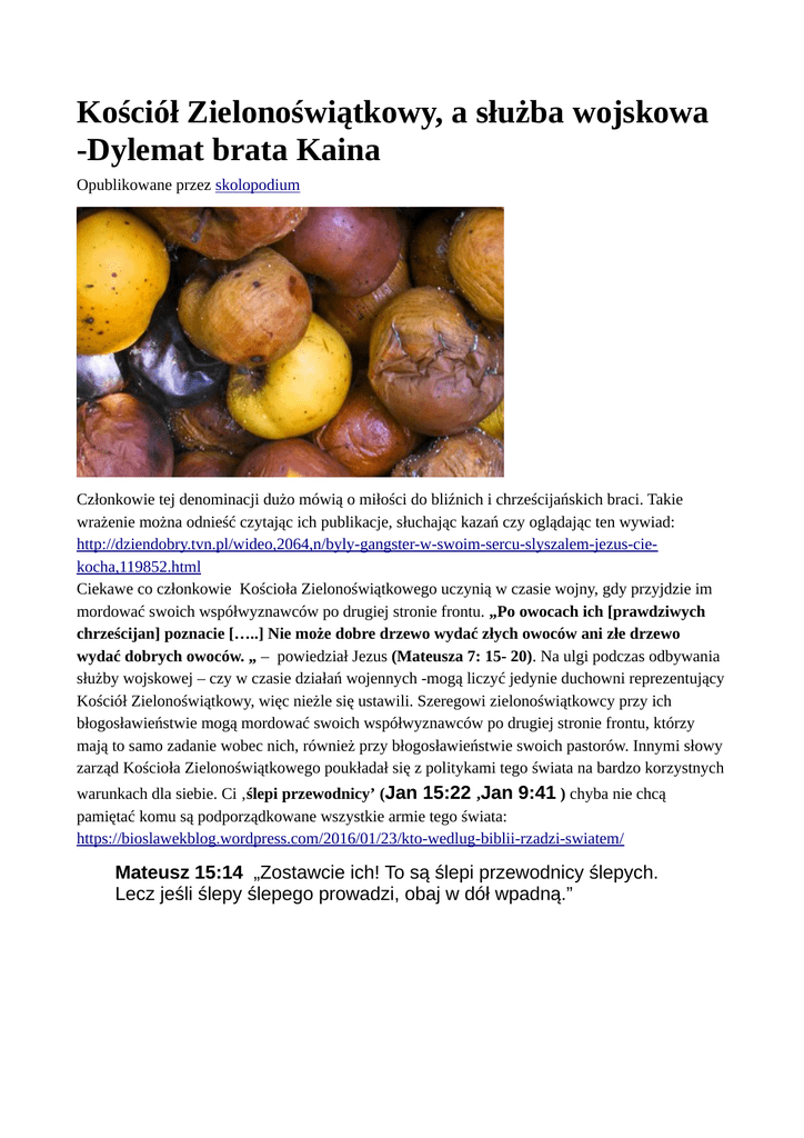 Kościół Zielonoświątkowy, a służba wojskowa -Dylemat brata Kaina Opublikowane przez skolopodium Członkowie tej denominacji dużo mówią o miłości do bliźnich i chrześcijańskich braci. Takie wrażenie można odnieść czytając ich publikacje, słuchając kazań czy oglądając ten wywiad: http://dziendobry.tvn.pl/wideo,2064,n/byly-gangster-w-swoim-sercu-slyszalem-jezus-ciekocha,119852.html Ciekawe co członkowie Kościoła Zielonoświątkowego uczynią w czasie wojny, gdy przyjdzie im mordować swoich współwyznawców po drugiej stronie frontu. „Po owocach ich [prawdziwych chrześcijan] poznacie […..] Nie może dobre drzewo wydać złych owoców ani złe drzewo wydać dobrych owoców. „ – powiedział Jezus (Mateusza 7: 15- 20). Na ulgi podczas odbywania służby wojskowej – czy w czasie działań wojennych -mogą liczyć jedynie duchowni reprezentujący Kościół Zielonoświątkowy, więc nieżle się ustawili. Szeregowi zielonoświątkowcy przy ich błogosławieństwie mogą mordować swoich współwyznawców po drugiej stronie frontu, którzy mają to samo zadanie wobec nich, również przy błogosławieństwie swoich pastorów. Innymi słowy zarząd Kościoła Zielonoświątkowego poukładał się z politykami tego świata na bardzo korzystnych warunkach dla siebie. Ci ‚ślepi przewodnicy’ (Jan 15:22 ,Jan 9:41 ) chyba nie chcą pamiętać komu są podporządkowane wszystkie armie tego świata: https://bioslawekblog.wordpress.com/2016/01/23/kto-wedlug-biblii-rzadzi-swiatem/ Mateusz 15:14 „Zostawcie ich! To są ślepi przewodnicy ślepych. Lecz jeśli ślepy ślepego prowadzi, obaj w dół wpadną.” http://www.kz.ustka.pl/index.php?s=23&m=wyznanie&lang=pl o stosunku Państwa do Kościoła Zielonoświątkowego w Rzeczpospolitej Polskiej „[…..] Art. 17. [….] 3. Ordynowani duchowni są przenoszeni do rezerwy i nie odbywają ćwiczeń wojskowych w czasie pokoju. W razie ogłoszenia mobilizacji oraz w czasie wojny mogą być oni powołani jedynie do pełnienia funkcji kapelanów wojskowych. 4. W razie ogłoszenia mobilizacji i w czasie wojny właściwe organy wojskowe, w porozumieniu z Naczelną Radą Kościoła, zapewnią pozostawienie do duszpasterskiej obsługi ludności niezbędnej liczby duchownych spośród tych, którzy podlegają mobilizacji. Art. 18. 1. Żołnierzom pełniącym czynną służbę wojskową zapewnia się możliwość uczestniczenia – poza terenem jednostek wojskowych – w nabożeństwach i czynnościach religijnych w niedziele i w dni świąteczne Kościoła, jeżeli w miejscowości stacjonowania jednostki wojskowej lub w jej pobliżu znajduje się zbór i jeżeli nie koliduje to z ważnymi obowiązkami służbowymi. 2. Opiekę duszpasterską na terenie jednostek wojskowych dla żołnierzy, o których mowa w ust.1, zapewniają duchowni Kościoła w terminach uzgodnionych z dowódcami jednostek. 3. Duchownych, o których mowa w ust. 2, wyznacza Naczelna Rada Kościoła w porozumieniu z Ministrem Obrony Narodowej. „ ŁK 11, 15-26 „KAŻDE KRÓLESTWO WEWNĘTRZNIE SKŁÓCONE PUSTOSZEJE I DOM NA DOM SIĘ WALI” Kościół Zielonoświątkowy jest podzielony na różne odłamy. Różne frakcje mają odmienne podejście do przestrzegania chrześcijańskiej neutralności. Członkowie jednego z odłamów odmawiają nawet odbywania służby wojskowej (https://pl.wikipedia.org/wiki/Protestantyzm_w_Polsce#Zielono.C5.9Bwi.C4.85tkowcy). W niniejszym artykule omówiono stanowisko głównego nurtu, jednak ciekawa w tym kontekście jest wypowiedź jednego z pastorów Kościoła Zielonoświątkowego: http://forum.emaus.zgora.pl/forum,temat-2616.html „W ruchu pentakostalnym na świecie istnieją różne nurty, zbory i społeczności zielonoświątkowe, podobnie jest w Polsce. Jest ich bardzo wiele. Wiele z nich ma charakter autonomiczny. Pisał o tym kiedyś pastor Waldemar Czerniejewski: Czy jest mozliwe aby zbory KZ w roznych krajach mialy odmienne stanowisko w sprawie postawy chrzescijanskiej wobec wojny i sluzby wojskowej? Odpowiedz jest ,”TAK”, maja rozne stanowisko i swoje zdanie – neutralne . Co to znaczy? To znaczy, ze pozostawiaja to na sumienie swoich czlonkow, innymi slowy, czyncie jak uwazacie. Nawet tu w USA, gdzie mieszkam, to zbory KZ (Asembly of God), ktore znam, z ktorymi kiedys nasza wspolnota slowianska wspolpracowala i bylismy razem, maja wlasnie taka postawe, z ktora masa zborow KZ nie byla zgodna i odstapili od nich w zgodzie i w pokoju twierdzac, ze my chcemy prowadzic nasze zbory wedlug Slowa Bozego. Nasza slowianska wspolnota, w ktorej jestem juz 25 lat, wyszla od Asembly of God gdzies okolo 1960 roku, wlasnie na takiej podstawie. Nie wrogujemy, zyjemy z nimi w pokoju, ale mamy mase swoich zborow, ktore chcemy prowadzic innaczej, prowadzic tak aby wiecznosc nas przyjela. Nie wiem czy wiesz, ze nie dawno naczelny prazbiter Asembly of God (KZ-tu w USA) z dyrekcja w Springfield, stan Missouri, zlozyl rezygnacje. Jego powodem rezygnacji bylo to, ze zbory A.G.,nie prowadza sie wedlug Slowa Bozego, sa zeswiedczale i poprawic tego sie juz nie da wiec on zrezygnowal. Amerykanskie miesieczniki chrzescijanskie pokazuja chrzest wodny zolnierzy w Iraku i na drugich frontach. Jakie to wielkie skazenie prawdy Bozej i odstepstwo od Bozego Slowa…… Wyglada na to, ze chrzcimy zolnierza, a po chrzecie on idzie i zabija ludzi – jakie to omamienie siebie i innych!!!! Syn Bozy nie dal takieko nakazu aby apostolowie uwierzyli w Niego, a potem szli i wojowali z rzymska imperia, a wrecz przeciwnie powiedzial : „kto mieczem wojuje od miecza zginie… Zadne organizace prawdziwych dzieci Bozych nie maja prawa patronowac militarnymi organizacjami, Syn Boze nie da takiego prawa. Jeden rozkaz On zostawil dla swojego Kosciola : „IDZCIE I GLOSCIE EWANGIELIE WSZELKIEMU TWORZENIU, KTO UWIERZY I OCHRZCI SIE , ZBAWIONY BEDZIE..’ Jezeli Ewangelia jest gloszona zolnierzom to tylko dlatego aby oni pokutowali, oddali swoje zycie Bogu i z