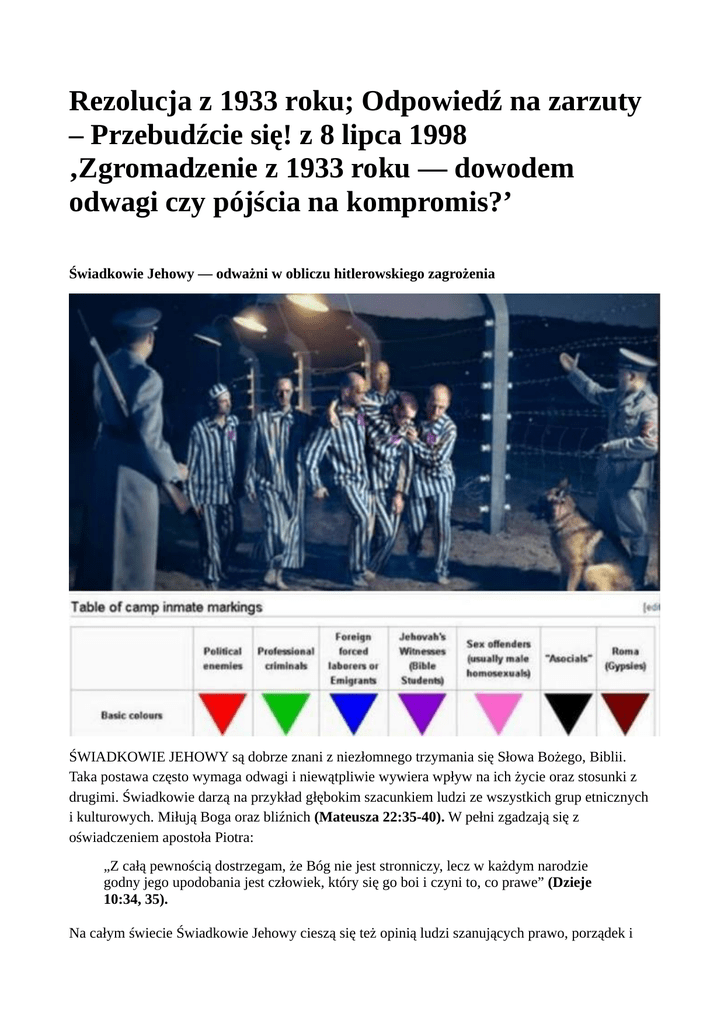 Rezolucja z 1933 roku; Odpowiedź na zarzuty – Przebudźcie się! z 8 lipca 1998 ‚Zgromadzenie z 1933 roku — dowodem odwagi czy pójścia na kompromis?’ Świadkowie Jehowy — odważni w obliczu hitlerowskiego zagrożenia ŚWIADKOWIE JEHOWY są dobrze znani z niezłomnego trzymania się Słowa Bożego, Biblii. Taka postawa często wymaga odwagi i niewątpliwie wywiera wpływ na ich życie oraz stosunki z drugimi. Świadkowie darzą na przykład głębokim szacunkiem ludzi ze wszystkich grup etnicznych i kulturowych. Miłują Boga oraz bliźnich (Mateusza 22:35-40). W pełni zgadzają się z oświadczeniem apostoła Piotra: „Z całą pewnością dostrzegam, że Bóg nie jest stronniczy, lecz w każdym narodzie godny jego upodobania jest człowiek, który się go boi i czyni to, co prawe” (Dzieje 10:34, 35). Na całym świecie Świadkowie Jehowy cieszą się też opinią ludzi szanujących prawo, porządek i władzę. Nigdy nie stanowili zarzewia buntu i nigdy nie będą do niego podżegać. Postępują tak nawet wtedy, gdy w pewnych krajach są prześladowani za wzorowanie się na apostołach, którzy oświadczyli: „Musimy być bardziej posłuszni Bogu jako władcy niż ludziom” (Dzieje 5:29; Mateusza 24:9). Równocześnie Świadkowie uznają prawo drugich do wyznawania przekonań religijnych zgodnych z ich własnym sumieniem. Zachowywanie nieustraszonej chrześcijańskiej postawy przez Świadków Jehowy w Niemczech i innych krajach zdominowanych przez Adolfa Hitlera jest faktem historycznym. Ich odwagę, miłość do Boga i bliźnich oraz poszanowanie dla prawa, porządku i wolności religijnej ilustruje pewne znamienne wydarzenie z 1933 roku, które rozegrało się w Berlinie. Bezkompromisowy stosunek do Hitlera Przeszło 50 lat temu dobiegła końca dwunastoletnia dyktatura Hitlera, który wprowadził przerażające rządy rasizmu i zbrodni. Ale do tej pory nie zagoiły się rany zadane ludzkości przez reżim nazistowski. Z historii wynika, że zaledwie kilka grup śmiało sprzeciwiło się faszystowskiej tyranii i otwarcie ją piętnowało. Należeli do nich Świadkowie Jehowy, których nazwano ‛małą wysepką niesłabnącego oporu [moralnego], istniejącą w łonie sterroryzowanego narodu’. Ich odważną postawę rzetelnie udokumentowali uznani historycy. Jednakże niewielkie grono krytyków — w tym również osoby niegdyś związane ze Świadkami Jehowy — zarzuca im, iż na początku starali się pójść na ugodę z reżimem hitlerowskim. Twierdzi się, że przedstawiciele Towarzystwa Strażnica bezskutecznie próbowali przypochlebiać się nowemu rządowi i że przynajmniej przez jakiś czas popierali rasistowską ideologię, która w końcu doprowadziła do zagłady sześciu milionów Żydów. Te poważne zarzuty są całkowicie bezpodstawne. Poniżej podajemy bezstronny opis wspomnianych wydarzeń, oparty na dostępnej dokumentacji, z uwzględnieniem tła historycznego. Spojrzenie w przeszłość Świadkowie Jehowy działają w Niemczech od ponad stu lat. W 1933 roku na terenie tego kraju około 25 000 Świadków oddawało cześć Bogu Jehowie i rozpowszechniało literaturę biblijną. Chociaż ówczesna konstytucja niemiecka gwarantowała wolność wyznania, to Świadkowie często byli celem oszczerczych kampanii, inicjowanych głównie przez przeciwników religijnych. Już w 1921 roku Świadków, nazywanych wówczas Poważnymi Badaczami Pisma Świętego (Ernste Bibelforscher), oskarżano o powiązania z żydowskimi ruchami wywrotowymi. Badaczy Pisma Świętego piętnowano jako niebezpieczne bolszewickie „robactwo żydowskie”, mimo że nigdy nie podano żadnych dowodów na potwierdzenie tych zarzutów. Szwajcarski teolog Karl Barth napisał później: „Oskarżanie Świadków Jehowy o powiązania z komunistami może być tylko wynikiem zwykłego nieporozumienia albo też świadomej dezinformacji”. W pewnym czasopiśmie religijnym wydawanym w Niemczech oskarżono Świadków i Żydów o spisek i udział w ruchach rewolucyjnych. W odpowiedzi na to oszczerstwo w niemieckim wydaniu Złotego Wieku (poprzednik Przebudźcie się!) z 15 kwietnia 1930 roku napisano: „Nie mamy podstaw uważać tego pomówienia za zniewagę, gdyż żywimy przekonanie, że Żyd jest co najmniej równie wartościowym człowiekiem jak nominalny chrześcijanin; nie zgadzamy się jednak z powyższym kłamstwem kościelnej gazety, ponieważ ma ono na celu zdyskredytowanie naszej działalności, jak gdyby była ona wykonywana nie na rzecz Ewangelii, lecz Żydów”. W związku z tym profesor historii John Weiss zauważył: „Świadkowie byli wolni od niemieckiego nacjonalizmu i rasizmu i nie dumali w nieskończoność nad tym, że Żydzi nie chcą się nawrócić. Wciąż trzymali się pierwotnego przekonania chrześcijan, iż wszystkich potencjalnych uczniów Chrystusa należy przekonywać”. Co się stało po dojściu Hitlera do władzy? Dnia 30 stycznia 1933 roku Adolf Hitler został nowym kanclerzem Niemiec. Jego rząd nie ujawniał od razu swych zbrodniczych i radykalnych celów. Dlatego na początku owego roku niemieccy Świadkowie wraz z milionami swych rodaków uważali, iż Partia Narodowosocjalistyczna ma prawowity mandat do sprawowania rządów. Mieli nadzieję, iż narodowi socjaliści (naziści) zrozumieją, że jako pokojowo usposobieni, posłuszni prawu chrześcijanie, nie są wywrotowcami zagrażającymi państwu. Nie była to bynajmniej próba pójścia na kompromis względem zasad biblijnych. Podobnie jak w innych krajach Świadkowie chcieli poinformować rząd o całkowicie niepolitycznym charakterze swej działalności. Wkrótce stało się jasne, że Świadkowie Jehowy znajdą się wśród pierwszych ofiar brutalnego ataku faszystów. Kolejny raz przypisano im współudział w rzekomym spisku bolszewicko-żydowskim. Zaczęła się fala prześladowań. Dlaczego tak mała społeczność religijna budziła wściekłość nowego reżimu? Historyk Brian Dunn po
