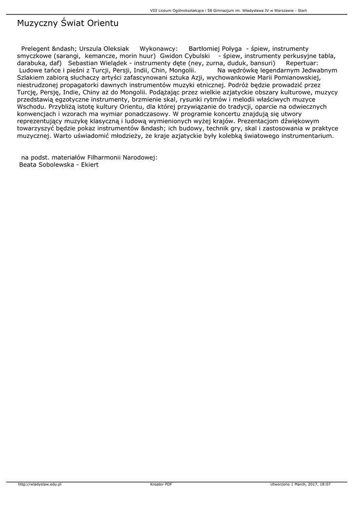 VIII Liceum Ogólnokształcące i 58 Gimnazjum im. Władysława IV w Warszawie - Start Muzyczny Świat Orientu Prelegent – Urszula Oleksiak Wykonawcy: Bartłomiej Połyga - śpiew, instrumenty smyczkowe (sarangi, kemancze, morin huur) Gwidon Cybulski - śpiew, instrumenty perkusyjne tabla, darabuka, daf) Sebastian Wielądek - instrumenty dęte (ney, zurna, duduk, bansuri) Repertuar: Ludowe tańce i pieśni z Turcji, Persji, Indii, Chin, Mongolii. Na wędrówkę legendarnym Jedwabnym Szlakiem zabiorą słuchaczy artyści zafascynowani sztuka Azji, wychowankowie Marii Pomianowskiej, niestrudzonej propagatorki dawnych instrumentów muzyki etnicznej. Podróż będzie prowadzić przez Turcję, Persję, Indie, Chiny aż do Mongolii. Podążając przez wielkie azjatyckie obszary kulturowe, muzycy przedstawią egzotyczne instrumenty, brzmienie skal, rysunki rytmów i melodii właściwych muzyce Wschodu. Przybliżą istotę kultury Orientu, dla której przywiązanie do tradycji, oparcie na odwiecznych konwencjach i wzorach ma wymiar ponadczasowy. W programie koncertu znajdują się utwory reprezentujący muzykę klasyczną i ludową wymienionych wyżej krajów. Prezentacjom dźwiękowym towarzyszyć będzie pokaz instrumentów – ich budowy, technik gry, skal i zastosowania w praktyce muzycznej. Warto uświadomić młodzieży, że kraje azjatyckie były kolebką światowego instrumentarium. na podst. materiałów Filharmonii Narodowej: Beata Sobolewska - Ekiert http://wladyslaw.edu.pl Kreator PDF Utworzono 1 March, 2017, 18:07