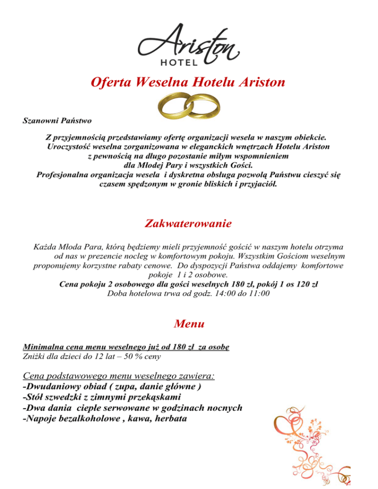 Oferta Weselna Hotelu Ariston Szanowni Państwo Z przyjemnością przedstawiamy ofertę organizacji wesela w naszym obiekcie. Uroczystość weselna zorganizowana w eleganckich wnętrzach Hotelu Ariston z pewnością na długo pozostanie miłym wspomnieniem dla Młodej Pary i wszystkich Gości. Profesjonalna organizacja wesela i dyskretna obsługa pozwolą Państwu cieszyć się czasem spędzonym w gronie bliskich i przyjaciół. Zakwaterowanie Każda Młoda Para, którą będziemy mieli przyjemność gościć w naszym hotelu otrzyma od nas w prezencie nocleg w komfortowym pokoju. Wszystkim Gościom weselnym proponujemy korzystne rabaty cenowe. Do dyspozycji Państwa oddajemy komfortowe pokoje 1 i 2 osobowe. Cena pokoju 2 osobowego dla gości weselnych 180 zł, pokój 1 os 120 zł Doba hotelowa trwa od godz. 14:00 do 11:00 Menu Minimalna cena menu weselnego już od 180 zł za osobę Zniżki dla dzieci do 12 lat – 50 % ceny Cena podstawowego menu weselnego zawiera: -Dwudaniowy obiad ( zupa, danie główne ) -Stół szwedzki z zimnymi przekąskami -Dwa dania ciepłe serwowane w godzinach nocnych -Napoje bezalkoholowe , kawa, herbata Poniżej przedstawiamy wstępne propozycje menu weselnego do wyboru: (Cena końcowa menu zależy od ilości potraw ) Przybycie gości – powitanie Państwo Młodych chlebem i solą Zupa 1. Staropolski rosół z domowym makaronem 2. Barszcz czerwony z krokietem 3. Barszcz z pasztecikiem, 4. Barszcz pierożkami (pielemienie) 5. Krem z pomidorów z chmurką śmietany i płatkami parmezanu 6. Klasyczna zupa pieczarkowa z łazankami 7. Krem pieczarkowy z groszkiem ptysiowym 8. Krem brokułowy z grzankami czosnkowymi 9. Zupa cebulowa z grzanką Danie główne 1. Tradycyjny kotlet schabowy z pieczarkami 2. Schab lub karczek oplatany boczkiem z zasmażana kapustą 3. Szwajcar ( schab faszerowany szynką i serem) 4. Imperial (schab faszerowany pieczarkami i serem) 5. Tymiankowy książę ( schab w sosie tymiankowym) 6. Filet Fetina ( pierś z kurczaka z serem feta i ziołami) 7. Filet Hawai ( pierś z kurczaka z ananasem i serem zapiekana) 8. Pieczeń wieprzowa w sosie myśliwskim 9. Kieszeń ze schabu faszerowana mięsem mielonym, suszonymi grzybami i serem 10. Zrazy wołowe faszerowane boczkiem, cebulą i ogórkami 11. De volaille tradycyjny lub nadziewany pieczarkami 12. Pierś z kurczaka lub indyka w serowej panierce Dodatki Surówki Buraczki na ciepło, kapusta zasmażana, kapusta pekińska, kapusta kiszona, mizeria (sezonowo), warzywa na parze, surówka z czerwonej kapusty ,surówka z kapusty białej (ogórek lub marchewka) surówka z marchwi na słodko, Sosy na ciepło Pieczeniowy ,z grzybów leśnych, koperkowo-śmietanowy Sosy na zimno Tatarski, Musztardowy, Chrzanowy, Tysiąca wysp, Tzatziki Marynaty: Pieczarki, ogórki konserwowe, ogórki kiszone, papryka konserwowa Przekąski na stole szwedzkim Deski najlepszych polskich wędlin Schab ze śliwką i morelą w maladze Karkówka pieczona z czosnkiem Pasztet wiejski Sałatka jarzynowa Śledź po staropolsku Śledziowa szuba Duet śledzi w zalewie Galantynki drobiowe Schab w galarecie Ozorki w galarecie Sałatka grecka z serem feta Sałatka z tuńczyka Sałatka meksykańska Jajko w szynce na sałatce jarzynowej Jaja nadziewane musem szczypiorkowo – ziołowym, chrzanowym lub zdobione ikrą Ryba w galarecie Ryba po grecku Deska serów Dania na gorąco serwowane w godzinach nocnych Gulasz z karkówki w sosie tzatzykowym z gratinkami Gulasz księcia Stroganoff Węgierski tradycyjny bogracz Goloneczki serwowane na kapuście Udko z kurczaka Udko z kurczaka na ostro Szaszłyk z karkówki przekładany wędzonką i warzywami Żur małopolski z jajkiem i kiełbaską w chlebowej czarce Flaczki wołowe z majerankiem Barszcz ukraiński z fasolą JAŚ Kapuśniak Bigos gajowego Pierogi z kapustą i grzybami , pierożki ruskie , pierogi z mięsem (wszystkie okraszone cebulką ze skwarkami) Dodatkowo proponujemy Stół wiejski – dania z wiejskiej spiżarni Indyk pieczony w całości z farszem Szynka wieprzowa pieczona ze stópką w całości Do wyboru: Żeberka w miodzie zapiekane Żeberka w kapuście zasmażanej Biała kiełbasa z kapustą zasmażaną Kaszanka Salceson Boczek Pasztetowa Karczek pieczony Kiełbasa wiejska Boczek szpikowany czosnkiem Ogórki kiszone Smalec ze skwarkami Chleb wiejski Stół rybny lub z owocami morza Łosoś faszerowany Szczupak faszerowany Pstrąg a la sushi, Kamaboko z kraba, Kalmary panierowane, Teriny rybne, Carpaccio z łososia Alkohol Wódka biała – od 35 zł za butelkę 0,5l Open bar – wybrany asortyment serwowany bez ograniczeń od momentu rozpoczęcia wesela przez 10 godzin Open Bar – ( piwo beczkowe, wino domowe, wódka biała ) – 70 zł/os W przypadku własnego alkoholu doliczana będzie opłata korkowa w wysokości 15% kosztu menu weselnego za os. Poprawiny Następnego dnia po weselu Młoda Para może zaprosić swoich Gości na poprawiny. Najczęściej proponowaną formą odbywających się w hotelu poprawin jest grill w Ogrodzie Zorganizujemy również poczęstunek w każdej innej wybranej przez Państwa formie. Poprawiny Obiad - grill Barszcz biały z kiełbasą i jajkiem podany w chlebowej czarce Mięsa z grilla, kiełbaski ,karczek, skrzydełka Ziemniaki smażone Frytki Chleb Surówki Kawa, herbata, ciasto Koszt poprawin od 80 zł za osobę Godz. poprawin 12.00 – 17.00 każda następna godzina płatna 400 zł Dodatkowo pomagamy w organizacji : Przejazdu bryczką lub limuzyną do kościoła , USC Oprawa muzyczna zespołów Dobór dekoracji Skorzystanie z usług profesjonalnego wodzireja Wykonanie sesji zdjęciowej oraz reportażu ślubnego przez zawodowych fotografów/operatorów Fontanna czekolady, fontanny alkoholowe Pokaz sztucznych ogni Puszczanie świetlnych lampionów Warunki płatności 1. Rezerwację uznajemy za potwierdzoną po wpłaceniu 30% zadatku ( szacowanych kosztów ) w terminie 7 dni po otrzymaniu potwierdzeniu wstępnej rezerwacjiw. 2. Na 30 dni prze