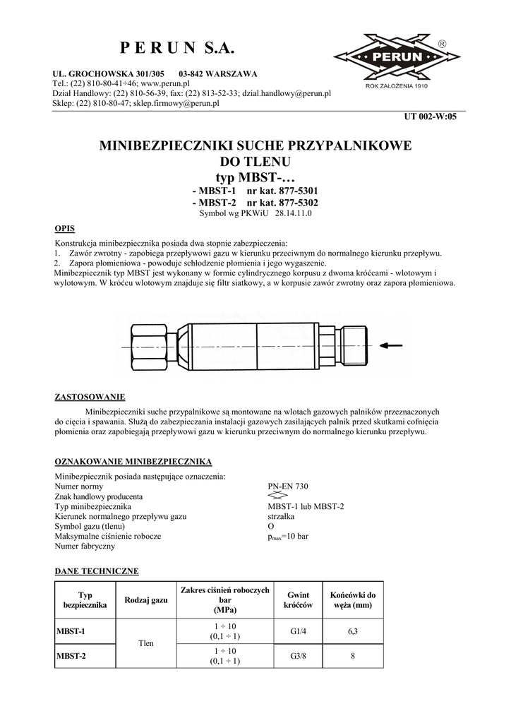 P E R U N S.A. UL. GROCHOWSKA 301/305 03-842 WARSZAWA Tel.: (22) 810-80-41÷46; www.perun.pl Dział Handlowy: (22) 810-56-39, fax: (22) 813-52-33; [email protected] Sklep: (22) 810-80-47; [email protected] UT 002-W:05 MINIBEZPIECZNIKI SUCHE PRZYPALNIKOWE DO TLENU typ MBST-… - MBST-1 - MBST-2 nr kat. 877-5301 nr kat. 877-5302 Symbol wg PKWiU 28.14.11.0 OPIS Konstrukcja minibezpiecznika posiada dwa stopnie zabezpieczenia: 1. Zawór zwrotny - zapobiega przepływowi gazu w kierunku przeciwnym do normalnego kierunku przepływu. 2. Zapora płomieniowa - powoduje schłodzenie płomienia i jego wygaszenie. Minibezpiecznik typ MBST jest wykonany w formie cylindrycznego korpusu z dwoma króćcami - wlotowym i wylotowym. W króćcu wlotowym znajduje się filtr siatkowy, a w korpusie zawór zwrotny oraz zapora płomieniowa. ZASTOSOWANIE Minibezpieczniki suche przypalnikowe są montowane na wlotach gazowych palników przeznaczonych do cięcia i spawania. Służą do zabezpieczania instalacji gazowych zasilających palnik przed skutkami cofnięcia płomienia oraz zapobiegają przepływowi gazu w kierunku przeciwnym do normalnego kierunku przepływu. OZNAKOWANIE MINIBEZPIECZNIKA Minibezpiecznik posiada następujące oznaczenia: Numer normy Znak handlowy producenta Typ minibezpiecznika Kierunek normalnego przepływu gazu Symbol gazu (tlenu) Maksymalne ciśnienie robocze Numer fabryczny PN-EN 730 MBST-1 lub MBST-2 strzałka O pmax=10 bar DANE TECHNICZNE Typ bezpiecznika Rodzaj gazu MBST-1 Tlen MBST-2 Zakres ciśnień roboczych bar (MPa) Gwint króćców Końcówki do węża (mm) 1 ÷ 10 (0,1 ÷ 1) G1/4 6,3 1 ÷ 10 (0,1 ÷ 1) G3/8 8 2 UT 002-W:05 CHARAKTERYSTYKA PRZEPŁYWU DLA TLENU SKŁAD KOMPLETU W skład kompletu wchodzi: - Minibezpiecznik - Ulotka techniczna - Przepisy obsługi - Opakowanie 1 szt. 1 szt. 1 szt. 1 szt. INFORMACJE DODATKOWE 1. 2. 3. 4. Do każdego minibezpiecznika załączane są „Przepisy obsługi minibezpieczników suchych przypalnikowych do tlenu" nr PD 003-W:05. Wyrób jest objęty gwarancją w okresie 12 miesięcy od daty sprzedaży, jednak nie dłużej niż 18 miesięcy od daty produkcji. Gwarancja nie obejmuje: filtru wlotowego, zapory płomieniowej, która w wyniku niewłaściwej eksploatacji utraciła wymaganą przepustowość Użytkownik minibezpiecznika traci prawo do napraw gwarancyjnych w przypadku niewłaściwej eksploatacji oraz dokonywania jakichkolwiek zmian konstrukcyjnych lub napraw we własnym zakresie.