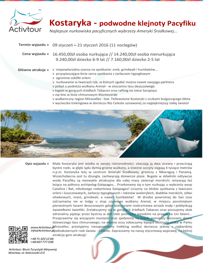 Kostaryka - podwodne klejnoty Pacyfiku Najlepsze nurkowiska pacyficznych wybrzeży Ameryki Środkowej... Termin wyjazdu » 09 styczeń – 21 styczeń 2016 (11 noclegów) Cena wyjazdu » 16.450,00zł osoba nurkująca // 14.240,00zł osoba nienurkująca 9.240,00zł dziecko 6-9 lat // 7.160,00zł dziecko 2-5 lat Główne atrakcje » v niepowtarzalna szansa na spotkanie: orek, grindwali i humbaków... v przyspieszające bicie serca spotkania z żarłaczem tępogłowym v ogromne szkółki orleni v nurkowanie w ławicach ryb, w których zgubić można nawet swojego partnera v pobyt u podnóża wulkanu Arenal - w otoczeniu lasu deszczowego v kąpiel w gorących źródłach Tabacon oraz rafting na rzece Sarapiqui v zip-line w lesie chmurowym Monteverde v wulkaniczny region Miravalles - tzw. Yellowstone Kostaryki z oczkami bulgoczącego błota v wycieczka trekingowa w dorzeczu Rio Celeste uznawanej za najpiękniejszą rzekę świata! Opis wyjazdu » Mała Kostaryka jest wielka w swojej różnorodności: otaczają ją dwa oceany i przecinają bystre rzeki, w głębi lądu dymią groźne wulkany, a śnieżne szczyty sięgają 4 tysiące metrów n.p.m. Kostaryka leży w centrum Ameryki Środkowej, graniczy z Nikaraguą i Panamą. Wszechobecna jest tu dżungla, zachwycają dziewicze plaże. Bogate w składniki odżywcze wody Pacyfiku są niezwykle atrakcyjne dla całej masy zwierząt morskich; omywają też leżący na północy archipelag Galapagos... Przekonamy się o tym nurkując u wybrzeży wysp Catalina i Bat, młodszego rodzeństwa Galapagos! Liczymy na bliskie spotkania z ławicami orleni i luszczowatych, żarłaczy tępogłowych i rekinów wielorybich, diabłów morskich, żółwi oliwkowych, mant, grindwali, a nawet humbaków! W drodze powrotnej do San Jose zatrzymamy sie w lodgy u stup czynnego wulkanu Arenal, w miejscu porośniętym pierwotnymi lasami deszczowymi gdzie wieczorami rozbrzmiewa wrzask małp i pobłyskują światełkami świetliki. Zrelaksujemy się w gorących źródłach Tabacon oraz poczujemy skok adrenaliny pędząc przez bystrza w dół rzeki pomiędzy wysokimi na prawie na 1m falami... Przeprawimy się wiszącymi mostami oraz zjedziemy na linach pomiędzy koronami drzew dziewiczego lasu chmurowego; na własne oczy zobaczymy kipiące błotniste oczka w Parku Miravalles; przeżyjemy niezapomniany trekking wzdłuż dorzecza jednej z najbardziej spektakularnych rzek świata - Celeste. Zapraszamy na naszą styczniową wyprawę, na której atrakcja goni atrakcję! RAMOWY PROGRAM IMPREZY 09.01 sobota » Zbiórka na lotnisku w Berlinie w godzinach porannych (możliwość organizacji przelotu z innych miast: Warszawy, Wrocławia itp...), Odprawa biletowa, przelot na Kostarykę, Przylot na lotnisko w San Jose w godzinach wieczornych, Transfer do miejscowości Escazu do hotelu Alta **** (25 minut jazdy) , Zakwaterowanie w pokojach, Czas wolny, odpoczynek po podróży. 10.01 niedziela » Śniadanie, Wykwaterowanie z hotelu, Przejazd na wulkaniczny obszar Miravalles zwany Pakiem Yellowstone Kostaryki, położony w paśmie górskim Cordillera de Guanacaste. Odbędziemy sceniczną podróż, w tym także na traktorze:), przez wiszące mosty po to by na własne oczy zachwycić się pięknem szumiących wodospadów, podglądać dziko żyjące na tym obszarze zwierzęta, formacje kryształów, naturalne baseny wypełnione bulgoczącym błotem oraz źródła siarki. Lunch, Transfer na wybrzeże nad zatokę Hermosa do hotelu Bosque Del Mar ***** przy słynnej plaży Hermosa w prowincji Guanacaste (ok. 2-3h). Zakwaterowanie w hotelu Bosque Del Mar, pokoje typu Junior Suite, Czas wolny, przygotowanie do nurkowań... PIERRSZY DZIEŃ NURKOWY: 2 nurkowania popołudniowe w oceanie, Czas wolny. 11.01 - 14.01 Śniadanie, poniedziałek - czwartek » 2 nurkowania dziennie z łodzi / 4 dni, przekąski pomiędzy nurkowaniami, w tym: - 1 dzień nurkowy (2 nurkowania) w miejscach lokalnych, - 2 dni nurkowe (4 nurkowania) przy wyspie Catalina, - 1 dzień nurkowy (2 nurkowania) przy wyspie Bat - w cenie pakietu wliczone opłaty za wstęp do PN, Powrót do hotelu, Atrakcje dodatkowe możliwe podczas pobytu w resorcie: kajaki, wycieczka przyrodnicza łodzią po rzece Tempisque, wycieczka konna do jedynego na świecie chronionego lasu kserofitycznego, surfing (na plażach w odległości 30 minut jazy), połów ryb. Czas wolny. 15.01 piątek » Śniadanie, Wykwaterowanie z hotelu, Przejazd w okolice Monteverde, po drodze (jeśli pogoda będzie dobra) zatrzymamy się przy przepięknym wodospadzie Llanoz de Cortes, Lunch, Monteverde, co oznacza „zieloną górę”, to niewielkie miasteczko położone w pobliżu wejścia do lasu chmurowego, 172 km na północny wschód od San Jose. Cały teren jest Rezerwatem Biosfery Lasu Chmurowego Monteverde. Monteverde skupia na swym terenie najbardziej kolorowe ptaki (400 gatunków) i motyle tropików, malownicze wodospady i bujne drzewa z wierzchołkami ukrytymi w gęstych chmurach. Zakwaterowanie w hotelu Poco a Poco ***+ z basenem, Czas wolny. 16.01 sobota » Śniadanie, Wizyta w Rezerwacie Biosfery Lasu Chmurowego - zwiedzanie rezerwatu. Spacer po wiszących mostach - stalowych konstrukcjach oraz ścieżkach, po których można wygodnie i bezpiecznie spacerować w naprawdę bliskim kontakcie z naturą. Poznamy uroki bujnego lasu chmurowego, słynącego z różnorodności egzotycznego ptactwa. Wśród atrakcji czeka też na nas zapierający dech w piersiach zjazd na linach pomiędzy rozpiętymi wysoko w koronach drzew platformami. Lunch, Popołudniowy transfer do lodgy Manoa z gorącymi źródłami, u podnóża wulkanu Arenal. Wulkan Arenal - najbardziej aktywny ze wszystkich wulkanów Kostaryki, 1630mnpm. Jeśli dopisze pogoda i nie skryje czubka wulkanu w chmurach, będą mieli Państwo możliwość podziwiania czerwonej poświaty lawy kotłującej się wewnątrz krateru. Zakwaterowanie w pokojach w Manoa Lodge****, Wieczorne wyjście do gorących źródeł Tabacon -