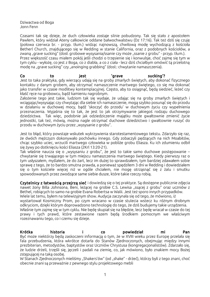 Dziwactwa od Boga Jonn Fenn Czasami tak się dzieje, że duch człowieka zostaje silnie pobudzony. Tak się stało z apostołem Pawłem, który widział Ateny całkowicie oddane bałwochwalstwu (Dz 17:16). Tak też dziś się czuję (połowa czerwca br. - przyp. tłum.) widząc najnowszą, chwilową modę wychodzącą z kościoła Betherl Church, znajdującego się w Redding w stanie California, oraz z podobnych kościołów, a zwaną „grave sucking” (dosł. grobowe wysysania/ssanie czy może „ssanie z grobu” - przyp. tłum.). Przez większość czasu miałem pokój jeśli chodzi o trzęsienie się i konwulsje, choć zajmę się tym w tym cyklu - wyłożę, co jest z Boga, co z diabła, a co z ciała - lecz dziś chciałbym omówić tą przelotną modę na „grave sucking” czy „anoinging grabbing” (dosł.: chwytanie namaszczenia). Co to jest 'grave sucking'? Jest to taka praktyka, gdy wierzący udają się na groby zmarłych świętych, aby dokonać fizycznego kontaktu z danym grobem, aby otrzymać namaszczenie martwego świętego, co się ma dokonać jako transfer w czasie modlitwy kontemplacyjnej. Często, aby to osiągnąć, będą siedzieć, leżeć czy kłaść ręce na grobowcu, bądź kamieniu nagrobnym. Założenie tego jest takie, ludziom tak się wydaje, że udając się na groby zmarłych świętych i wciągając/wysysając czy chwytając dla siebie ich namaszczenie, mogą szybko posunąć się do przodu w działaniu w duchowej mocy, bądź 'skoczyć do przodu' w duchowym życiu czy wypełnienia przeznaczenia. Wyjaśnia się to tak, że jest to jak otrzymywanie jakiegoś rodzaju duchowego dziedzictwa. Tak więc, podobnie jak odziedziczenie majątku może gwałtownie zmienić życie jednostki, tak też, mówią, można nagle otrzymać duchowe dziedzictwo i gwałtownie ruszyć do przodu w duchowym życiu przez „wysysanie z grobu”. Jest to błąd, który powstaje wskutek wykrzywienia starotestamentowego tekstu. Zdarzyło się raz, że dwóch mężczyzn dokonywało pochówku innego. Gdy zobaczyli pędzących na nich Moabitów, chcąc szybko uciec, wrzucili martwego człowieka w pobliże grobu Eliasza. Ku ich zdumieniu odbił się żywy po dotknięciu kości Eliasza (2Krl 13:20-21). Tak właśnie naucza się o „wysysaniu z grobu”, że jest to takie samo duchowe postępowanie – chwytanie się trwającego w tym miejscu namaszczenia martwego świętego. Kiedy pierwszy raz o tym usłyszałem, myślałem, że do żart, lecz im dużej to sprawdzałem, tym bardziej zdawałem sobie sprawę z tego, że to bardzo smutna prawda, a ponieważ spędziłem 3 dni w Redding i dowiedziałem się o tym kościele więcej niż w ogóle chciałem, nie mogę otrząsnąć się z żalu i smutku spowodowanych przez zwodzące same siebie dusze, które takie rzeczy robią. Czytelnicy z łatwością przejrzą sieć i dowiedzą się o tej praktyce. Są dostępne publicznie zdjęcia nawet żony Billa Johnsona, Beni, leżącej na grobie C.S. Lewisa „ssącej z grobu” oraz uczniów z Bethel, robiących to samo na grobie Evana Robertsa w Walii. Jest też sporo innych przypadków. Wiele lat temu, byłem na telewizyjnym show. Audycja zaczynała się od tego, że mówiono, iż wystartował Kosmiczny Prom, po czym wracano w czasie stulecia wstecz ku różnym drobnym odkryciom, dzięki którym doprowadzono technologię do tego, że dziś budujemy takie urządzenia. Właśnie tym zajmę się w tym cyklu. Nie będę skupiał się na błędzie, lecz będę wracał w czasie do tej prawy i tych prawd, które zestawione razem będą środkiem pomocnym we właściwym rozeznawaniu tego, co i czemu się dzieje. Krótka historia i co powiedział mi Pan Być może niektórzy będą zaskoczeni informacją o tym, że w XVIII wieku przez Europę przelała się fala przebudzenia, która wkrótce dotarła do Stanów Zjednoczonych, obejmując między innymi prezbiterian, metodystów, baptystów oraz Uczniów Chrystusa (kongregacjonalistów). Zdarzało się, że ludzie drżeli, trzęśli się, jęczeli i padali na ziemię, co, jak mówiono, było znakiem mocy Bożej zstępującej na taką osobę. W Stanach Zjednoczonych mieliśmy „Shakers'ów” (od „shake” - drżeć), którzy byli z tego znani, choć obecnie znani są przeważnie z pewnego stylu projektowego mebli 1 . John Wesley uważał, że takie ruchy są naturalną reakcją ciała na obecność Bożego Ducha i miłości, ale nie jest to jakieś bezpośrednie nadnaturalne wydarzenie. W XIX wieku ludzie tacy jak Finney pisali, że takie rzeczy zdarzały się w czasie spotkań prowadzonych przez nich, lecz do czasu, gdy ja przyszedłem do Pana w latach 70tych zeszłego wieku zielonoświątkowcy byli nazywani 'Holy Rollers' (tarzający się święci). Holy Rollers Ja i Barbara, narodziliśmy się na nowo i zostali napełnieni w Duchem Święty jako nastolatkowie. Uczestniczyliśmy w grupach charyzmatycznych spotykających się co tydzień w domach. Mama Barbary nie rozumiała tego, mając za sobą tylko niemieckie, luterańskie wychowanie z początku XX wieku, które to my musieliśmy pojąć. Kiedy więc mieliśmy wziąć ślub jej w rodzinnym kongregacyjnym kościele, zapytała nas bardzo szczerze czy nie będzie huśtania się na żyrandolach bądź zwijania się na podłodze, jako że tego nie robi się między kongregacjonalistami. Wyraźnie odetchnęła, gdy powiedzieliśmy jej, że nic z tych rzeczy nie będzie (choć rozpaczliwie chciałem jej powiedzieć, że moglibyśmy wypędzić jakiegoś demona czy dwa, żeby zobaczyć jak zareaguje, lecz zdecydowałem się jej tak nie drażnić). Przypisywany najczęściej Katrhryn Kuhlman zwrot „położyć w duchu” opisuje stan osoby, która została „powalona” przez moc Bożą, wyglądając jakby była martwa. Znane są również inne nazwy tego zjawiska. Co powiedział mi Pan Wiedząc obecnie, że trzęsienie się, drżenie i upadanie należy do części charyzmatycznego życia przez ostatnie t
