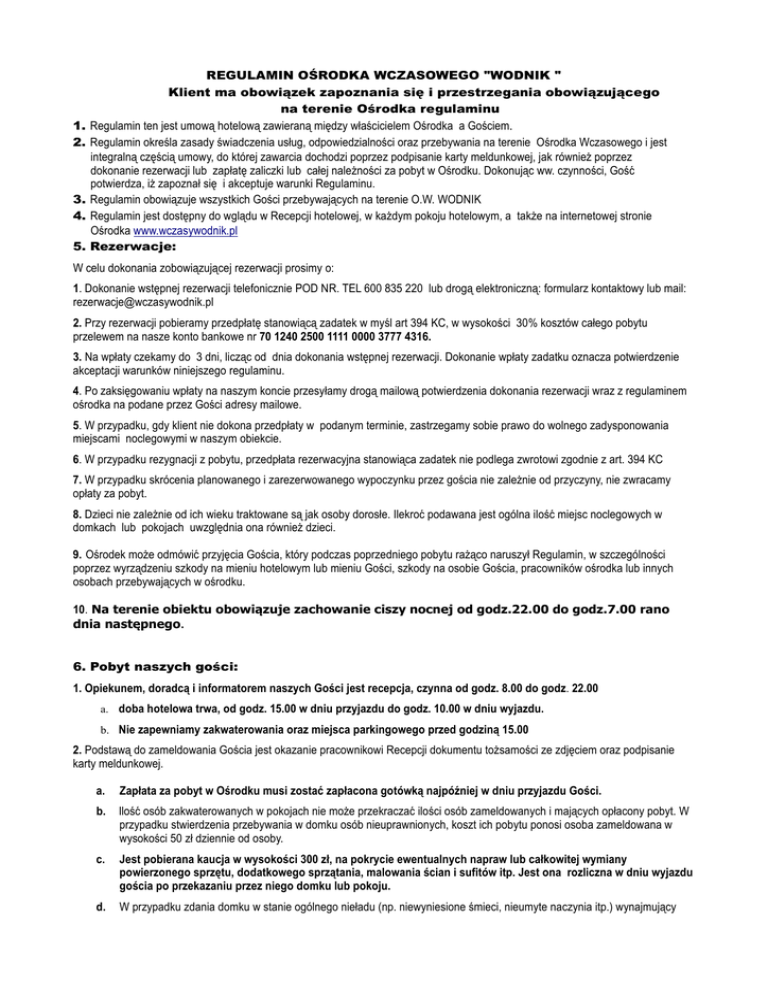 1. 2. 3. 4. 5. REGULAMIN OŚRODKA WCZASOWEGO "WODNIK " Klient ma obowiązek zapoznania się i przestrzegania obowiązującego na terenie Ośrodka regulaminu Regulamin ten jest umową hotelową zawieraną między właścicielem Ośrodka a Gościem. Regulamin określa zasady świadczenia usług, odpowiedzialności oraz przebywania na terenie Ośrodka Wczasowego i jest integralną częścią umowy, do której zawarcia dochodzi poprzez podpisanie karty meldunkowej, jak również poprzez dokonanie rezerwacji lub zapłatę zaliczki lub całej należności za pobyt w Ośrodku. Dokonując ww. czynności, Gość potwierdza, iż zapoznał się i akceptuje warunki Regulaminu. Regulamin obowiązuje wszystkich Gości przebywających na terenie O.W. WODNIK Regulamin jest dostępny do wglądu w Recepcji hotelowej, w każdym pokoju hotelowym, a także na internetowej stronie Ośrodka www.wczasywodnik.pl Rezerwacje: W celu dokonania zobowiązującej rezerwacji prosimy o: 1. Dokonanie wstępnej rezerwacji telefonicznie POD NR. TEL 600 835 220 lub drogą elektroniczną: formularz kontaktowy lub mail: [email protected] 2. Przy rezerwacji pobieramy przedpłatę stanowiącą zadatek w myśl art 394 KC, w wysokości 30% kosztów całego pobytu przelewem na nasze konto bankowe nr 70 1240 2500 1111 0000 3777 4316. 3. Na wpłaty czekamy do 3 dni, licząc od dnia dokonania wstępnej rezerwacji. Dokonanie wpłaty zadatku oznacza potwierdzenie akceptacji warunków niniejszego regulaminu. 4. Po zaksięgowaniu wpłaty na naszym koncie przesyłamy drogą mailową potwierdzenia dokonania rezerwacji wraz z regulaminem ośrodka na podane przez Gości adresy mailowe. 5. W przypadku, gdy klient nie dokona przedpłaty w podanym terminie, zastrzegamy sobie prawo do wolnego zadysponowania miejscami noclegowymi w naszym obiekcie. 6. W przypadku rezygnacji z pobytu, przedpłata rezerwacyjna stanowiąca zadatek nie podlega zwrotowi zgodnie z art. 394 KC 7. W przypadku skrócenia planowanego i zarezerwowanego wypoczynku przez gościa nie zależnie od przyczyny, nie zwracamy opłaty za pobyt. 8. Dzieci nie zależnie od ich wieku traktowane są jak osoby dorosłe. Ilekroć podawana jest ogólna ilość miejsc noclegowych w domkach lub pokojach uwzględnia ona również dzieci. 9. Ośrodek może odmówić przyjęcia Gościa, który podczas poprzedniego pobytu rażąco naruszył Regulamin, w szczególności poprzez wyrządzeniu szkody na mieniu hotelowym lub mieniu Gości, szkody na osobie Gościa, pracowników ośrodka lub innych osobach przebywających w ośrodku. 10. Na terenie obiektu obowiązuje zachowanie ciszy nocnej od godz.22.00 do godz.7.00 rano dnia następnego. 6. Pobyt naszych gości: 1. Opiekunem, doradcą i informatorem naszych Gości jest recepcja, czynna od godz. 8.00 do godz. 22.00 a. doba hotelowa trwa, od godz. 15.00 w dniu przyjazdu do godz. 10.00 w dniu wyjazdu. b. Nie zapewniamy zakwaterowania oraz miejsca parkingowego przed godziną 15.00 2. Podstawą do zameldowania Gościa jest okazanie pracownikowi Recepcji dokumentu tożsamości ze zdjęciem oraz podpisanie karty meldunkowej. a. Zapłata za pobyt w Ośrodku musi zostać zapłacona gotówką najpóźniej w dniu przyjazdu Gości. b. Ilość osób zakwaterowanych w pokojach nie może przekraczać ilości osób zameldowanych i mających opłacony pobyt. W przypadku stwierdzenia przebywania w domku osób nieuprawnionych, koszt ich pobytu ponosi osoba zameldowana w wysokości 50 zł dziennie od osoby. c. Jest pobierana kaucja w wysokości 300 zł, na pokrycie ewentualnych napraw lub całkowitej wymiany powierzonego sprzętu, dodatkowego sprzątania, malowania ścian i sufitów itp. Jest ona rozliczna w dniu wyjazdu gościa po przekazaniu przez niego domku lub pokoju. d. W przypadku zdania domku w stanie ogólnego nieładu (np. niewyniesione śmieci, nieumyte naczynia itp.) wynajmujący ponosi koszty końcowego sprzątania w wysokości 50 zł. Kwota ta zostanie potrącona z kaucji. Wszelkiego rodzaju zastane uszkodzenia lub zniszczenia przedmiotów wyposażenia i urządzeń technicznych pokoju lub domków winny być zgłaszane natychmiast po ich stwierdzeniu nie później niż w ciągu 24 godzin od zameldowania w recepcji Ośrodka. Brak zgłoszenia oznacza brak usterek i zniszczeń. f. Gość ośrodka ponosi odpowiedzialność materialną za spowodowanie uszkodzenia lub zniszczenia majątku ośrodka. g. W przypadku zastrzeżeń dotyczących jakości usług Gość jest proszony o jak najszybsze zgłaszanie ich w recepcji, co umożliwi personelowi Ośrodka szybką reakcję h. Osoby odwiedzające naszych Gości, mogą przebywać na terenie obiektu od godz. 8 rano do godz. 22.00, za zachowanie osób odwiedzających odpowiada Gość ośrodka. i. Gość Ośrodka nie ma prawa przekazywać pokoju lub domku innym osobom, nawet jeśli nie upłynął okres za który Gość uiścił opłatę. j. Pościel wymieniamy raz w tygodniu, a przy pobytach jedno tygodniowych dodatkowa wymiana pościeli jest płatna. k. Na terenie obiektu obowiązuje zachowanie ciszy nocnej od godz.22.00 do godz.7.00 rano dnia następnego. l. Ośrodek może w trybie natychmiastowym odmówić dalszego świadczenia usług osobie, która narusza tę zasadę. m. nie należy przenosić wyposażenia pokoi bez powiadomienia o tym recepcji, ośrodek nie ponosi odpowiedzialności za uszkodzenia lub utratę samochodu lub innego pojazdu należącego do Gościa, n. parking na terenie ośrodka jest niestrzeżony - zapewniamy jedno miejsce parkingowe dla każdego domku, apartamentu lub pokoju w pawilonie mieszkalnym o. Przekazanie i zdanie bungalowu, domku lub pokoju następuje w obecności personelu Ośrodka. p. W razie zgubienia kluczy Gość Ośrodka zostanie obciążony kosztami w wysokości 100 zł. q. ze względu na bezpieczeństwo przeciwpożarowe, nie zezwala się na używanie w pokojach hotelowych grzejników, żelazek, czajników bezprzewodowych i innych podobnych urządzeń, nie stanowiących wyposażenia 