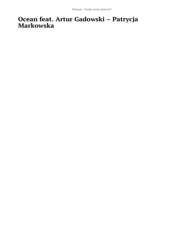 iSing.pl - Każdy może śpiewać! Ocean feat. Artur Gadowski – Patrycja Markowska Za nami wiele kłamstw Pomyliłam kilka chwil z całym życiem Czekałam twoich ust W krzyku ciszy szeptów słów już nie słyszę Czemu pamięć dalej ma twój smak? Zapach wciąż ten sam Czemu na rozstaju naszych warg ocean pragnień? Gdy wszystko co chce niebo dać zamieniam w ogień Wszystko co chce niebo dać umyka z objęć Kiedy bliskość nas rani aż tak Dawno minął już czas na żal Za nami wiele kłamstw Czas mi świadkiem, Bóg go dał jestem sily Czekałem twoich ust Umierałem już nie raz Dziś spokojniej Czemu pamięć dalej ma twój smak? Zapach wciąż ten sam Czemu na rozstaju naszych warg ocean pragnień? Gdy wszystko co chce niebo dać zamieniam w ogień Wszystko co chce niebo dać umyka z objęć Kiedy bliskość nas rani aż tak Dawno minął już czas... Gdy wszystko co chce niebo dać zamieniam w ogień Wszystko co chce niebo dać umyka z objęć Kiedy bliskość nas rani aż tak Dawno minął już czas na żal Słowa: S. Piekarek Muzyka: J. Zaczek Rok wydania: 2013 Płyta: Alter Ego