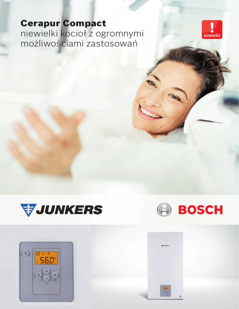 Cerapur Compact niewielki kocioł z ogromnymi możliwościami zastosowań ! NOWOŚĆ NOWOŚĆ Oszczędny i przyjazny dla środowiska Najnowsze kotły kondensacyjne Cerapur Compact to oferta warta zastosowania zarówno w przypadku nowych mieszkań oraz domów, jak i modernizacji istniejących instalacji oraz wymiany kotła gazowego na nowy. Szeroki zakres modulacji Kotły kondensacyjne Cerapur Compact mogą pracować ekonomicznie zarówno w przypadku ogrzewania małych mieszkań (dolny zakres modulacji od 3 kW), jak i większych apartamentów i domów (górny zakres regulacji do 25,4 kW) zapewniając wysoki komfort użytkownikom. Automatyka pogodowa Zintegrowany panel sterowania Bosch Heatronic® 3.5 zapewnia łatwą obsługę kotła. Dzięki wbudowanej automatyce pogodowej z możliwością dopasowania krzywej grzewczej do indywidualnych potrzeb systemu ogrzewania, Cerapur Compact umożliwia uzyskanie dodatkowych oszczędności energii i kosztów ogrzewania. Łatwa zmiana rodzaju gazu Standardowo kotły Cerapur Compact przystosowane są do zasilania gazem typu E (GZ50). W przypadku pracy z innym rodzajem gazu (Lw, Ls, B/P) wystarczy, że urządzenie zostanie odpowiednio wyregulowane i oznakowane przez Autoryzowany Serwis Junkers. Dane techniczne Jedn. ZSB 24-1DE Jednofunkcyjny - TAK NIE Dwufunkcyjny - NIE TAK Oznaczenie urządzenia Znamionowa moc cieplna [Prated] kW 24 Sezonowa efektywność energetyczna ogrzewania pomieszczeń [ηS] % 93 Klasa efektywności energetycznej Poziom mocy akustycznej [Lwa] Opcjonalne zestawy podłączeń hydraulicznych Opcjonalne zestawy hydrauliczne umożliwiają poziome lub pionowe podłączenie instalacji grzewczej, wodnej i gazowej. Dodatkowo, w przypadku wymiany starego kotła na nowy, dostępne są zestawy ułatwiające podłączenie nowego kotła do wielu rodzajów płyt montażowych w istniejących instalacjach. Dodatkowe oszczędności inwestycyjne W przypadku budynków wielorodzinnych Cerapur Compact może być podłączany do wspólnego komina, co pozwala zaoszczędzić cenną powierzchnię budynku oraz ograniczyć wydatki związane z zakupem indywidualnych systemów spalinowych. Kotły Cerapur Compact dostarczane są ze standardowymi adapterami powietrzno-spalinowymi Ø 80/125 mm. ZWB 24-1DE - A dB 50 Deklarowany profil obciążeń - - XL Efektywność energetyczna podgrzewania wody [ηwh] % - 83 Klasa efektywności energetycznej podgrzewania wody - - A Zakres modulacji mocy na c.o. kW Maksymalna znamionowa moc cieplna na c.w.u. kW - 3,0-25,4 24,1 Wydajność c.w.u. wg EN 625 (D) [ΔT = 30 K] l/min - 11,3 Pojemność i ciśnienie wstępne naczynia wzbiorczego l/bar 8/0,75 Przyłącze powietrzno-spalinowe mm 80/125 Zasilanie elektryczne V/Hz AC 230/50 Masa Wymiary wys./szer./gł. kg 35 mm 815/400/300 - B23, B33, C13, C33, C43, C53, C63, C83, C93 Typ instalacji powietrzno-spalinowej Cerapur Compact Wiszący gazowy kocioł kondensacyjny Ogrzewanie lub ogrzewanie + ciepła woda Zakres mocy: od 3 do 25,4 kW Moc nominalna: 24 kW 10.2015 XL Najważniejsze korzyści: XXoszczędność gazu: - szeroki zakres modulacji 1:8 - funkcja optymalizacji solarnej XXłatwy montaż: - różne możliwości podłączeń hydraulicznych XXłatwa obsługa: - panel sterowania Bosch Heatronic ® 3.5 - czytelny wyświetlacz LCD XXcicha praca urządzenia XXmałe wymiary i masa XXatrakcyjna cena Robert Bosch Sp. z o.o., Dział Termotechniki, ul. Jutrzenki 105, 02-231 Warszawa www.junkers.pl