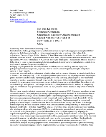 Jasiński Zenon Ul. Michałowskiego 18m18 42-224 Częstochowa Poland www.pracaludzka.pl mail: [email protected] Częstochowa, dnia 12 kwietnia 2015 r. Pan Ban Ki-moon Sekretarz Generalny Organizacji Narodów Zjednoczonych United Nations 405E42nd St New York, NY 10017 USA Szanowny Panie Sekretarzu Generalny ONZ. Piszę ten list z Polski, piszę ponieważ jestem zaniepokojony powiększającą się ilością konfliktów zbrojnych, do których dochodzi w różnych regionach świata, wymienię tylko kilka; Irak, Afganistan, Tunezja, Egipt, Libia, Ukraina. W konfliktach tych dochodzi do rozlewu krwi i giną niczemu niewinni ludzie. A przecież nie tak dawno temu, cały świat hucznie obchodził koniec 2000 i początek 2001roku, wkraczając w XXI wiek z nowymi nadziejami i marzeniami. Minęło zaledwie kilka lat, a w coraz to innych częściach świata dochodzi do rozlewu krwi i giną ludzie, a skala tych tragicznych wydarzeń napawa niepokojem. Politycy krajów pośrednio, lub bezpośrednio uwikłanych w te konflikty zamiast dążyć do pokojowego ich rozwiązywania, używają słów z czasów zimnowojennej retoryki, brnąc tym samym w ślepy zaułek. A przecież poważni politycy, obojętnie z jakiego kraju się wywodzą (dotyczy to również polityków z Polski i Unii Europejskiej, USA i Rosji) nie powinni przyczyniać się do podgrzewania napiętej do granic możliwości atmosfery, wymachując przysłowiową szabelką, chociaż jest to niby niewinna szabelka w postaci nieprzemyślanych wypowiedzi słownych. Odpowiedzialni politycy powinni włączać się w pokojowe rozwiązywanie, nawet najmniejszego zarzewia konfliktu. Demokracja nie zwalnia nikogo od myślenia i bieżącego działania, czyli odpowiedzialności za kraj, w którym się żyje, ale również za całą społeczność z którą się żyje, można śmiało dodać za cały świat w którym się żyje. Martwi mnie również zbytnia pasywność odpowiednich organów ONZ. Dlaczego powołane w tym celu struktury ONZ nie podejmują w miarę szybko odpowiednich działań? W dobie bardzo dobrze rozwiniętej teletransmisji, można bardzo szybko i sprawnie przegłosować odpowiednie uchwały, bez konieczności przyjazdu przedstawicieli wszystkich państw członkowskich do siedziby ONZ. Przecież nie tak dawno temu, żołnierze spod biało - błękitnej flagi uczestniczyli w operacjach pokojowych w różnych częściach świata. Rozdzielali zwaśnione strony konfliktów, ochraniając ludność cywilną. Ludzie na całym świecie wielkim szacunkiem darzą żołnierzy w błękitnych beretach spod biało – błękitnej flagi ONZ. Dlatego wszystkie kraje członkowskie powinny zadbać, aby międzynarodowe siły pokojowe ONZ były profesjonalnie wyszkolone i wyposażone, gotowe do szybkich reakcji w nagłych sytuacjach konfliktowych, czyli jak najszybciej od podjęcia odpowiedniej uchwały przez Zgromadzenie Ogólne, lub Radę Bezpieczeństwa dotyczącej wysłania wojskowej misji pokojowej w rejon zarzewia konfliktu. Jednocześnie przedstawiciele ONZ powinni prowadzić rozmowy z udziałem zwaśnionych stron w celu zażegnania konfliktu. Bardzo źle się dzieje, gdy w wojny i konflikty uwikłani są stali członkowie Rady Bezpieczeństwa ONZ, członkowie, którym przysługuje prawo weta. Uważam i na pewno nie jestem w tym odosobniony, że państwo nie przestrzegające prawa międzynarodowego nie powinno zasiadać w składzie Rady Bezpieczeństwa, a jeszcze dodatkowo z dziwacznym jak na XXI wiek, prawem weta. Szanowny Panie Sekretarzu Generalny. Wielokrotnie zapowiadaną reformę ONZ trzeba wreszcie zacząć realizować. Piszę o pasywności ONZ, gdyż wiele krajów należących do tej organizacji, jak również poszczególni Sekretarze Generalni wysuwali propozycje przeprowadzenia reform. Aby nie być gołosłownym, poniżej przedstawiam zarys przedstawianych propozycji, odnalezionych w materiałach ONZ; (…) Reforma Organizacji Narodów Zjednoczonych: (…) Skuteczność i racjonalizacja muszą stać się filarami Organizacji po to, by mogła ona sprostać nowym wyzwaniom. Musimy uprościć i usprawnić nasze administracyjne procedury. Reforma jest potrzebna, ponieważ Organizacja Narodów Zjednoczonych i jej personel muszą być przystosowane do nowych potrzeb. Gwarantując najwyższe standardy etyczne, integralność oraz wiarygodność, możemy pokazać, że w pełni odpowiadamy przed wszystkimi Państwami Członkowskimi i ludźmi na całym Świecie. Musimy wzmocnić zdolność Organizacji Narodów Zjednoczonych tak, by mogła jak najlepiej spełniać swoja rolę w zapobieganiu konfliktom, ustanawianiu, utrzymywaniu oraz budowaniu pokoju. Są to nierozłączne części jednej całości i nasze podejście do tych procesów musi być zintegrowane, skoordynowane i wszechstronne. Zwiększając nasze możliwości w zakresie dyplomacji prewencyjnej i wspierając trwałe procesy pokojowe, stworzymy długoterminowe rozwiązania i będziemy w stanie bardziej skutecznie reagować w sytuacji konfliktu. (…) Czy nie najwyższy czas by te reformy w ONZ przeprowadzić?... Szanowny Panie Sekretarzu Generalny. List kierowany na Pana ręce, wysyłam równolegle do przywódców pięciu stałych członków Rady Bezpieczeństwa ONZ. Przywódcy pięciu stałych członków Rady Bezpieczeństwa ONZ, powinni włączyć się w reformę struktur ONZ, wspierając Pana działania, tak aby przyniosły one oczekiwane nadzieje. Uważam, że pierwszym krokiem jakie te kraje powinny uczynić, to zrzec się archaicznego prawa weta, aby bez żadnych przeszkód można by było ten zapis usunąć z dokumentów ONZ. Aby promować zasady demokracji, to przykład musi iść od góry, a więc również z ONZ, organizacji skupiającej wszystkie kraje świata. Nie może być tak, że demokracja, demokracją, a silniejszy dyktuje warunki i to jeszcze w majestacie prawa. W następstwie tego, takie same praktyki powielają niektóre państwa na arenie międzynarodowej. Jeśli ONZ ma 