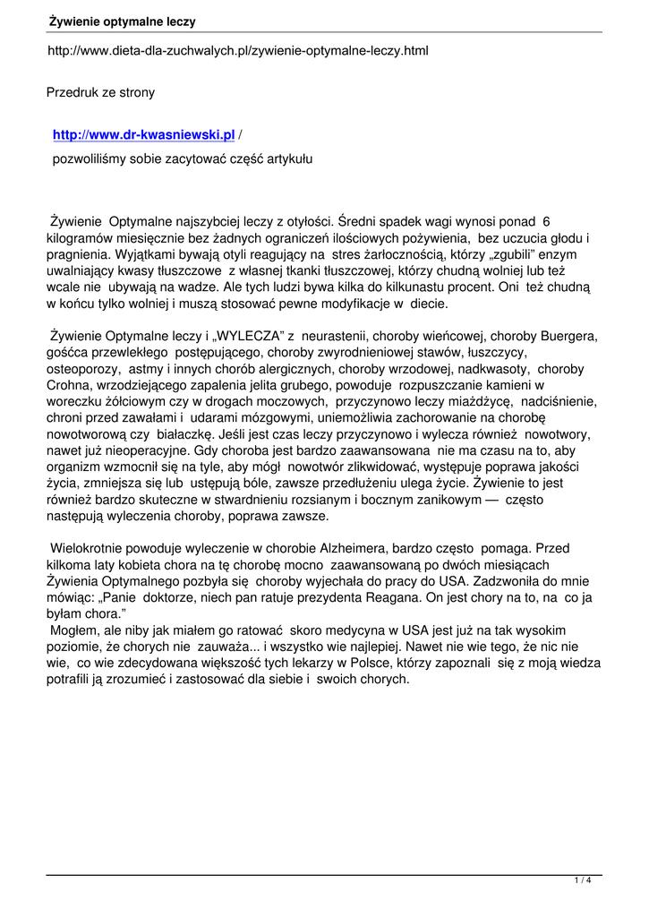 Żywienie optymalne leczy http://www.dieta-dla-zuchwalych.pl/zywienie-optymalne-leczy.html Przedruk ze strony http://www.dr-kwasniewski.pl / pozwoliliśmy sobie zacytować część artykułu Żywienie Optymalne najszybciej leczy z otyłości. Średni spadek wagi wynosi ponad 6 kilogramów miesięcznie bez żadnych ograniczeń ilościowych pożywienia, bez uczucia głodu i pragnienia. Wyjątkami bywają otyli reagujący na stres żarłocznością, którzy „zgubili” enzym uwalniający kwasy tłuszczowe z własnej tkanki tłuszczowej, którzy chudną wolniej lub też wcale nie ubywają na wadze. Ale tych ludzi bywa kilka do kilkunastu procent. Oni też chudną w końcu tylko wolniej i muszą stosować pewne modyfikacje w diecie. Żywienie Optymalne leczy i „WYLECZA” z neurastenii, choroby wieńcowej, choroby Buergera, gośćca przewlekłego postępującego, choroby zwyrodnieniowej stawów, łuszczycy, osteoporozy, astmy i innych chorób alergicznych, choroby wrzodowej, nadkwasoty, choroby Crohna, wrzodziejącego zapalenia jelita grubego, powoduje rozpuszczanie kamieni w woreczku żółciowym czy w drogach moczowych, przyczynowo leczy miażdżycę, nadciśnienie, chroni przed zawałami i udarami mózgowymi, uniemożliwia zachorowanie na chorobę nowotworową czy białaczkę. Jeśli jest czas leczy przyczynowo i wylecza również nowotwory, nawet już nieoperacyjne. Gdy choroba jest bardzo zaawansowana nie ma czasu na to, aby organizm wzmocnił się na tyle, aby mógł nowotwór zlikwidować, występuje poprawa jakości życia, zmniejsza się lub ustępują bóle, zawsze przedłużeniu ulega życie. Żywienie to jest również bardzo skuteczne w stwardnieniu rozsianym i bocznym zanikowym — często następują wyleczenia choroby, poprawa zawsze. Wielokrotnie powoduje wyleczenie w chorobie Alzheimera, bardzo często pomaga. Przed kilkoma laty kobieta chora na tę chorobę mocno zaawansowaną po dwóch miesiącach Żywienia Optymalnego pozbyła się choroby wyjechała do pracy do USA. Zadzwoniła do mnie mówiąc: „Panie doktorze, niech pan ratuje prezydenta Reagana. On jest chory na to, na co ja byłam chora.” Mogłem, ale niby jak miałem go ratować skoro medycyna w USA jest już na tak wysokim poziomie, że chorych nie zauważa... i wszystko wie najlepiej. Nawet nie wie tego, że nic nie wie, co wie zdecydowana większość tych lekarzy w Polsce, którzy zapoznali się z moją wiedza potrafili ją zrozumieć i zastosować dla siebie i swoich chorych. 1/4 Żywienie optymalne leczy Żywienie Optymalne szybko leczy paradontozę, zatrzymuje postępy próchnicy zębów, poprawia słuch u niedosłyszących, poprawia wzroku u gorzej widzących — o 1-2 dioptrie, maksymalnie o 4 dioptrie, powoduje cofanie się zaćmy. Optymalnym nie trzeba wycinać migdałków, wyrostka robaczkowego, woreczka żółciowego, żołądka, nie trzeba odcinać nóg w chorobie Buergera czy w miażdżycy; szybko usuwa objawy niedotlenienia mięśnia sercowego z EKG, po dłuższym czasie usuwa objawy niedokrwienia w miarę ustępowania zmian miażdżycowych; szybko leczy chorobę wieńcową i niewydolność krążenia; likwiduje większość zaburzeń rytmu serca; usuwa niewydolność oddechową- Bywa, że czyni zbędną operację tętniaka mózgu czy wymianę stawu biodrowego na sztuczny. Optymalnym nigdy nie brakuje powietrza, nawet przy dużych wysiłkach, nigdy nie bolą ich mięśnie po wysiłku, nie mają skurczów mięśni. Optymalnego od razu można poznać po cerze: jest zdrowa i piękna. U młodzieży cierpiącej z powodu łojotoku i wykwitów ropnych na skórze usuwa przyczynę choroby i samą chorobę. Wybitnie poprawia sprawność mózgu i zdolność uczenia się. U zwierząt zwiększa objętość mózgu o średnio 8% w jednym pokoleniu, a zdolność uczenia o 40%. Najszybciej Żywienie Optymalne usuwa choroby i dolegliwości ze strony przewodu pokarmowego- nadkwasota znika po l-2 dniach; choroba wrzodowa ustępuje po kilku dniach podobnie jak dolegliwości wątroby, trzustki czy jelit. Leczy skutecznie marskość wątroby, a także marskość zastoinową u chorych na przewlekłe zapalenie wątroby spowodowane infekcją wirusową, powoduje ustąpienie choroby i normalizację prób wątrobowych Szybko leczy stłuszczenie wątroby. Żywienie Optymalne jest najlepszym modelem żywienia dla wątroby, która przy nim jest najmniej obciążona pracą i szybko potrafi się regenerować i reperować to, co zostało uszkodzone poprzednim modelem żywienia. Bywa, że po 3-5 tygodniach wracają dolegliwości ze strony przewodu pokarmowego. Przyczyną przeważnie bywają pasożyty, najczęściej są to lamblie. Wówczas należy zbadać, potwierdzić, wytruć i dolegliwości ustąpią. U chorych na kamicę woreczka czy dróg żółciowych i kamicę nerkową Żywienie Optymalne prawie zawsze powoduje szybkie rozpuszczenie kamieni, które gdy się zmniejszą na tyle, że zmieszczą się w przewodzie żółciowym czy moczowym mogą spowodować kolkę. Nie należy panikować, należy przyjąć leki rozkurczowe i przeciwbólowe, a prawie zawsze kamień zostanie wydalony i choroba ustąpi. Kamienie rozpuszczają się zwykle już po 3-5 tygodniach przy kamieniach w woreczku, a przy kamicy dróg moczowych chorzy zaczynają siusiać piaskiem zwykle po 2-3 tygodniach diety. Łuszczycowe zmiany najszybciej cofają się ze skóry owłosionej głowy, z innych okolic ciała — przy wieloletniej łuszczycy — trzeba poczekać dłużej. Nie zdarza się, aby Żywienie Optymalne nie spowodowało szybkiej poprawy zdrowia najczęściej zauważalnej już po tygodniu, a wyraźniej po dwóch tygodniach. 2/4 Żywienie optymalne leczy Chorób jest bardzo dużo i nie jest możliwe opisanie wpływu Żywienia Optymalnego na każdą z nich. Organizm na diecie optymalnej potrafi czasem bardzo dużo- nawet niemożliwe do wyleczenia wypadanie macicy często ustępuje bez operacji. U dziewcząt, które już miesiączkują miesiączka zanik