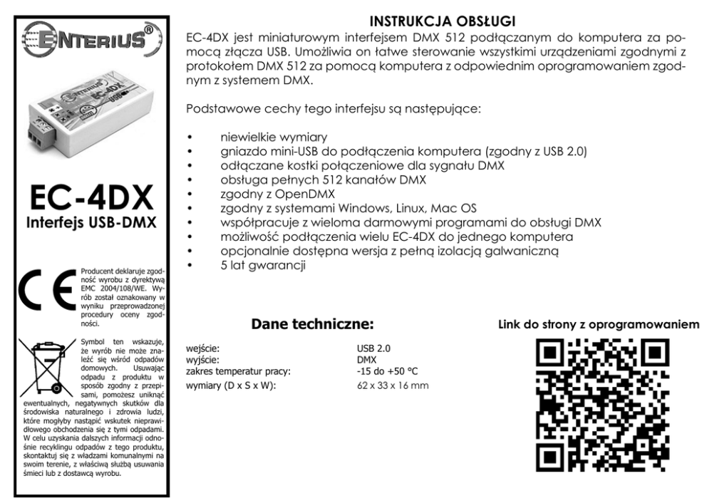 INSTRUKCJA OBSŁUGI EC-4DX jest miniaturowym interfejsem DMX 512 podłączanym do komputera za pomocą złącza USB. Umożliwia on łatwe sterowanie wszystkimi urządzeniami zgodnymi z protokołem DMX 512 za pomocą komputera z odpowiednim oprogramowaniem zgodnym z systemem DMX. Podstawowe cechy tego interfejsu są następujące: EC-4DX Interfejs USB-DMX Producent deklaruje zgodność wyrobu z dyrektywą EMC 2004/108/WE. Wyrób został oznakowany w wyniku przeprowadzonej procedury oceny zgodności. Symbol ten wskazuje, że wyrób nie może znaleźć się wśród odpadów domowych. Usuwając odpadu z produktu w sposób zgodny z przepisami, pomożesz uniknąć ewentualnych, negatywnych skutków dla środowiska naturalnego i zdrowia ludzi, które mogłyby nastąpić wskutek nieprawidłowego obchodzenia się z tymi odpadami. W celu uzyskania dalszych informacji odnośnie recyklingu odpadów z tego produktu, skontaktuj się z władzami komunalnymi na swoim terenie, z właściwą służbą usuwania śmieci lub z dostawcą wyrobu. • • • • • • • • • • niewielkie wymiary gniazdo mini-USB do podłączenia komputera (zgodny z USB 2.0) odłączane kostki połączeniowe dla sygnału DMX obsługa pełnych 512 kanałów DMX zgodny z OpenDMX zgodny z systemami Windows, Linux, Mac OS współpracuje z wieloma darmowymi programami do obsługi DMX możliwość podłączenia wielu EC-4DX do jednego komputera opcjonalnie dostępna wersja z pełną izolacją galwaniczną 5 lat gwarancji Dane techniczne: wejście: wyjście: zakres temperatur pracy: wymiary (D x S x W): USB 2.0 DMX -15 do +50 °C 62 x 33 x 16 mm Link do strony z oprogramowaniem