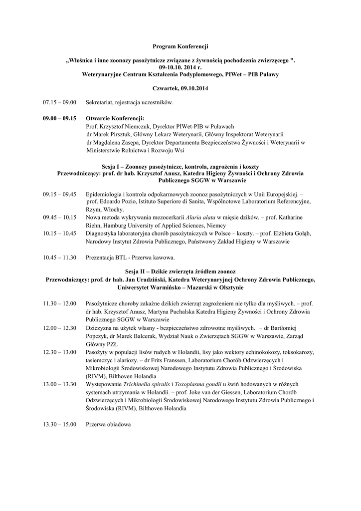 Program Konferencji „Włośnica i inne zoonozy pasożytnicze związane z żywnością pochodzenia zwierzęcego ". 09-10.10. 2014 r. Weterynaryjne Centrum Kształcenia Podyplomowego, PIWet – PIB Puławy Czwartek, 09.10.2014 07.15 – 09.00 Sekretariat, rejestracja uczestników. 09.00 – 09.15 Otwarcie Konferencji: Prof. Krzysztof Niemczuk, Dyrektor PIWet-PIB w Puławach dr Marek Pirsztuk, Główny Lekarz Weterynarii, Główny Inspektorat Weterynarii dr Magdalena Zasępa, Dyrektor Departamentu Bezpieczeństwa Żywności i Weterynarii w Ministerstwie Rolnictwa i Rozwoju Wsi Sesja I – Zoonozy pasożytnicze, kontrola, zagrożenia i koszty Przewodniczący: prof. dr hab. Krzysztof Anusz, Katedra Higieny Żywności i Ochrony Zdrowia Publicznego SGGW w Warszawie 09.15 – 09.45 09.45 – 10.15 10.15 – 10.45 10.45 – 11.30 Epidemiologia i kontrola odpokarmowych zoonoz pasożytniczych w Unii Europejskiej. – prof. Edoardo Pozio, Istituto Superiore di Sanita, Wspólnotowe Laboratorium Referencyjne, Rzym, Włochy. Nowa metoda wykrywania mezocerkarii Alaria alata w mięsie dzików. – prof. Katharine Riehn, Hamburg University of Applied Sciences, Niemcy Diagnostyka laboratoryjna chorób pasożytniczych w Polsce – koszty. – prof. Elżbieta Gołąb, Narodowy Instytut Zdrowia Publicznego, Państwowy Zakład Higieny w Warszawie Prezentacja BTL - Przerwa kawowa. Sesja II – Dzikie zwierzęta źródłem zoonoz Przewodniczący: prof. dr hab. Jan Uradziński, Katedra Weterynaryjnej Ochrony Zdrowia Publicznego, Uniwersytet Warmińsko – Mazurski w Olsztynie 11.30 – 12.00 12.00 – 12.30 12.30 – 13.00 13.00 – 13.30 13.30 – 15.00 Pasożytnicze choroby zakaźne dzikich zwierząt zagrożeniem nie tylko dla myśliwych. – prof. dr hab. Krzysztof Anusz, Martyna Puchalska Katedra Higieny Żywności i Ochrony Zdrowia Publicznego SGGW w Warszawie Dziczyzna na użytek własny - bezpieczeństwo zdrowotne myśliwych. – dr Bartłomiej Popczyk, dr Marek Balcerak, Wydział Nauk o Zwierzętach SGGW w Warszawie, Zarząd Główny PZŁ Pasożyty w populacji lisów rudych w Holandii, lisy jako wektory echinokokozy, toksokarozy, tasiemczyc i alariozy. – dr Frits Franssen, Laboratorium Chorób Odzwierzęcych i Mikrobiologii Środowiskowej Narodowego Instytutu Zdrowia Publicznego i Środowiska (RIVM), Bilthoven Holandia Występowanie Trichinella spiralis i Toxoplasma gondii u świń hodowanych w różnych systemach utrzymania w Holandii. – prof. Joke van der Giessen, Laboratorium Chorób Odzwierzęcych i Mikrobiologii Środowiskowej Narodowego Instytutu Zdrowia Publicznego i Środowiska (RIVM), Bilthoven Holandia Przerwa obiadowa Sesja III – Włośnie i nie tylko... Przewodniczący: prof. dr hab. Władysław Cabaj, Dyrektor Instytutu Parazytologii Polskiej Akademii Nauk, Warszawa 15.00 - 15.20 15:20 -15.40 15.40 – 16.30 16.30 – 16.50 16.50 - 17.20 19.30 Włośnica zwierząt dzikich i ludzi doświadczenie wynikające z niedawnego przebiegu epidemii w Niemczech. – dr Anne Mayer-Scholl - Federal Institute for Risk Assessment, Department for Biological Safety, Niemcy Występowanie Toxoplasma gondii u wybranych gatunków zwierząt rzeźnych i wolno żyjących w Polsce. – dr Jacek Sroka, PIWet-PIB w Puławach Prezentacja Centrum Pepsyny – Przerwa kawowa Badania przekrojowe świń i dzików na terenie Estonii w kierunku obecności przeciwciał antyTrichinella. – prof. Age Karssin, Estonian University of Life Sciences, Institute of Veterinary Medicine and Animal Sciences; Estonian Veterinary and Food Laboratory Diagnostyka bąblowicy jednojamowej u ludzi w rejonie centralnej Polski. – dr Monika Dybicz, Katedra i Zakład Biologii Ogólnej i Parazytologii, Warszawski Uniwersytet Medyczny Spotkanie towarzyskie Piątek, 10.10.2014 Sesja IV – Pasożyty w mięsie zwierząt rzeźnych i ryb Przewodniczący: prof. dr hab. Elżbieta Gołąb, Zakład Parazytologii Lekarskiej Narodowy Instytut Zdrowia Publicznego, Państwowy Zakład Higieny 09.00 – 09.30 09.30 – 09.45 9.45 – 10.00 10.00-10.45 Obraz kliniczny przebiegu włośnicy – wybrane symptomy. – prof. Łukasz Pielok, dr Szymon Nowak, prof. Jerzy Stefaniak, Uniwersytet Medyczny im. Karola Marcinkowskiego w Poznaniu Zmiany ultrastrukturalne w narządach myszy szczepu BALB/c, przez które migrują larwy Trichinella spiralis. – Julia Dąbrowska Katedra Biologii Ogólnej i Parazytologii Warszawski Uniwersytet Medyczny Rozmieszczenie oraz intensywność inwazji Trichinella spiralis w mięśniach królików doświadczalnie zarażonych. – dr Greta Skrzypek, Wydział Medycyny Weterynaryjnej, Uniwersytet Przyrodniczy w Lublinie Prezentacja Centrum Enbio – Technology Przerwa kawowa Sesja V – Wybrane zagrożenia parazytologiczne Przewodniczący: dr hab. Tomasz Cencek Państwowy Instytut Weterynaryjny– Państwowy Instytut Badawczy w Puławach 10.45 – 11.15 Pierwsze w Polsce określenie genotypów Acanthamoeba z naturalnych zbiorników wodnych oraz trudne diagnostycznie i terapeutycznie Acanthamoeba keratitis zdiagnozowane w dwóch ośrodkach w kraju. – Beata Szostakowska Gdański Uniwersytet Medyczny 11.15 – 11.45 Zmiany klimatu czynnikiem sprzyjającym powstawaniu poważnych ognisk chorobowych wywołanych przez nicienie z rodziny Filariidae. – prof. Antti Oksanen, Fiński Urząd Bezpieczeństwa Żywności (Evira), Oulu, Wydział badań (FINPAR), Finlandia 11.45 –12.00. Zróżnicowanie genetyczne włośni występujących w populacji świń i dzików na terenie Polski dr Ewa Bilska – Zając, PIWet-PIB w Puławach 12.00 – 12.15 Szacowanie ryzyka występowania włośnicy w populacji świń w Polsce – dr Mirosław Różycki, PIWet-PIB w Puławach 12.15 – 12.30 Podsumowanie i zakończenie Konferencji