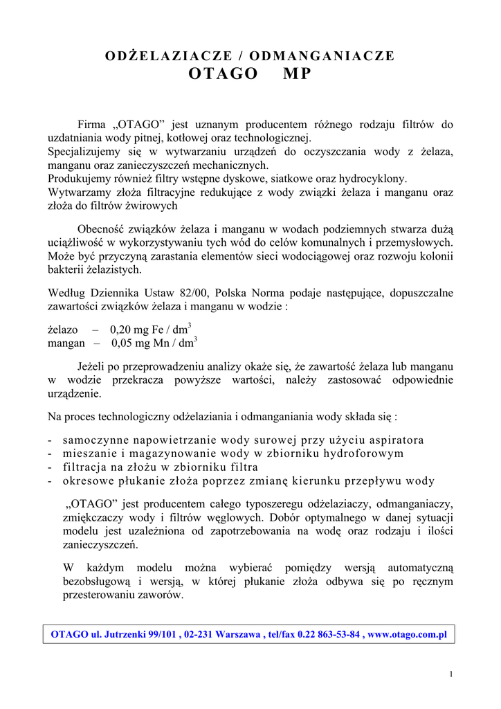 ODŻELAZIACZE / ODMANGANIACZE OTAGO MP Firma „OTAGO” jest uznanym producentem różnego rodzaju filtrów do uzdatniania wody pitnej, kotłowej oraz technologicznej. Specjalizujemy się w wytwarzaniu urządzeń do oczyszczania wody z żelaza, manganu oraz zanieczyszczeń mechanicznych. Produkujemy również filtry wstępne dyskowe, siatkowe oraz hydrocyklony. Wytwarzamy złoża filtracyjne redukujące z wody związki żelaza i manganu oraz złoża do filtrów żwirowych Obecność związków żelaza i manganu w wodach podziemnych stwarza dużą uciążliwość w wykorzystywaniu tych wód do celów komunalnych i przemysłowych. Może być przyczyną zarastania elementów sieci wodociągowej oraz rozwoju kolonii bakterii żelazistych. Według Dziennika Ustaw 82/00, Polska Norma podaje następujące, dopuszczalne zawartości związków żelaza i manganu w wodzie : żelazo – 0,20 mg Fe / dm3 mangan – 0,05 mg Mn / dm3 Jeżeli po przeprowadzeniu analizy okaże się, że zawartość żelaza lub manganu w wodzie przekracza powyższe wartości, należy zastosować odpowiednie urządzenie. Na proces technologiczny odżelaziania i odmanganiania wody składa się : - samoczynne napowietrzanie wody surowej przy użyciu aspiratora mieszanie i magazynowanie wody w zbiorniku hydroforowym filtracja na złożu w zbiorniku filtra okresowe płukanie złoża poprzez zmianę kierunku przepływu wody „OTAGO” jest producentem całego typoszeregu odżelaziaczy, odmanganiaczy, zmiękczaczy wody i filtrów węglowych. Dobór optymalnego w danej sytuacji modelu jest uzależniona od zapotrzebowania na wodę oraz rodzaju i ilości zanieczyszczeń. W każdym modelu można wybierać pomiędzy wersją automatyczną bezobsługową i wersją, w której płukanie złoża odbywa się po ręcznym przesterowaniu zaworów. OTAGO ul. Jutrzenki 99/101 , 02-231 Warszawa , tel/fax 0.22 863-53-84 , www.otago.com.pl 1 Parametry odżelaziaczy serii MP MP-2 MP-3,5 MP-5,5 MP-9 średnica wejście/wyjście 1” lub 1¼” 1” , 1¼” lub 1½” 1¼” lub 1½” 1½” lub 2” objętość zbiornika filtracyjnego 150 dm3 300 dm3 500 dm3 1000 dm3 objętość złoża filtracyjnego 110 dm3 220 dm3 340 dm3 750 dm3 masa pustego zbiornika 55 kg 80 kg 150 kg 270 kg masa zbiornika ze złożem ~ 275 kg ~ 520 kg ~ 750 kg ~ 1550 kg wymiary zbiornika h1 h2 d L ~ 155 cm ~ 165 cm ~ 45 cm ~ 60 cm ~ 160 cm ~ 170 cm ~ 55 cm ~ 90 cm ~ 190 cm ~ 205 cm ~ 70 cm ~ 110 cm ~ 195 cm ~ 210 cm ~ 90 cm ~ 125 cm ciśnienie robocze 1,8 ÷6 atm. 1,8 ÷ 6 atm. 1,8 ÷ 6 atm. 1,8 ÷ 6 atm. max. przepływ przy pracy ciągłej 2 m3/h 3,5 m3/h 5,5 m3/h 9 m3/h filtr h2 h1 MP-2 d L 2 SYSTEM UZDATNIANIA WODY Na proces technologiczny odżelaziania i odmanganiania wody składa się : - samoczynne napowietrzanie wody surowej przy użyciu aspiratora mieszanie i magazynowanie wody w zbiorniku hydroforowym filtracja na złożu w zbiorniku filtra okresowe płukanie złoża poprzez zmianę kierunku przepływu wody W skład stacji uzdatniania wody wchodzą : 1. 2. 3. 4. pompa wody zbiornik ciśnieniowy (hydrofor) z wodowskazem odżelaziacz z zaworami oraz złożem filtracyjnym aspirator 5. dysza rozpryskowa 5 2 wlot wody surowej 3 wylot wody uzdatnionej popłuczyny hydrofor zawór zwrotny wlot wody do pompy wyłącznik ciśnienia aspirator filtr Z4 4 Z1 1 Z2 Z5 Z3 3 1. ASPIRATOR Aspirator jest to urządzenie, które służy do napowietrzania wody w procesie jej oczyszczania z żelaza i manganu. Efektem napowietrzania wody jest przemiana związków żelaza łatwo rozpuszczalnych w wodzie w związki trudno rozpuszczalne, które mogą zostać zatrzymane na złożu filtracyjnym. Aspirator pozwala także na utrzymywania stałego poziomu poduszki powietrznej w zbiorniku hydroforowym. Konstrukcja aspiratora produkowanego przez „OTAGO” oparta jest na zwężce Venturiego (inżektor), która wykorzystuje efekt różnicy ciśnień między jej wlotem a wylotem. Przepływająca przez zwężkę woda wywołuje podciśnienie w dyszy, czego konsekwencją jest zasysanie powietrza. wlot powietrza Aspirator ma prostą konstrukcję. Pozwala to na łatwy montaż i nieskomplikowaną, bezawaryjną obsługę. Zwężka Venturiego umieszczona jest w by-passie. Na przelocie głównym znajduje się zawór pełniący rolę regulatora ciśnienia między wlotem a wylotem inżektora. Na dyszy zasysającej umieszczony jest zawór zwrotny. Uwagi montażowe dotyczące aspiratora : • Aspirator należy zainstalować w sieci hydraulicznej między pompą a zbiornikiem hydroforowym • Należy zamontować go zaworem zwrotnym pionowo do góry • Aspirator jest urządzeniem typu WE/WY, należy więc zamontować go tak, aby woda przepływała w kierunku zgodnym ze strzałką wybitą na zwężce inżektorowej. • Pomiędzy aspiratorem a zbiornikiem hydroforowym należy zamontować zawór zwrotny. • Na czas montażu należy rozkręcić oba półśrubunki i zdjąć zwężkę z kolanami. 4 2. ZBIORNIK HYDROFOROWY Do współpracy z odżelaziaczem lub odmanganiaczem, sposób podłączenia zbiornika hydroforowego musi być zgodny z następującymi zaleceniami : • • • 3. wodę do zbiornika należy doprowadzić przez otwór górny wskazane jest zastosowanie na wlocie do zbiornika dyszy rozpryskowej. Dodatkowo miesza ona wodę z powietrzem zawartym w zbiorniku hydroforowym w otworze dolnym zbiornika należy zamontować zawór spustowy FILTR ODŻELAZIAJĄCY / ODMANGANIAJĄCY Filtr odżelaziający / odmanganiający zbudowany jest z następujących elementów : 1. zbiornik z systemem dystrybucyjnym 2. orurowanie wraz z zaworamni do sterowania (płukania) 3. złoże filtracyjne TRYB NORMALNEJ PRACY : Podczas normalnej pracy urządzenia, napowietrzona woda surowa zawierająca wytrącone związki żelaza i manganu płynie wewnątrz zbiornika z góry do dołu poprzez materiał filtracyjny. Wydajność zależy od maksymalnego dopuszczalnego spadku ciśnienia dla całego układu i maksymalnego dopuszczalnego obciążen