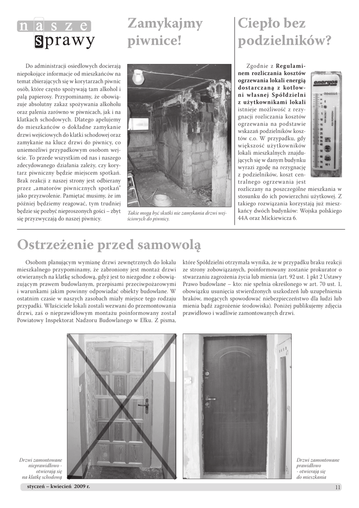 Do administracji osiedlowych docierają niepokojące informacje od mieszkańców na temat zbierających się w korytarzach piwnic osób, które często spożywają tam alkohol i palą papierosy. Przypominamy, że obowiązuje absolutny zakaz spożywania alkoholu oraz palenia zarówno w piwnicach, jak i na klatkach schodowych. Dlatego apelujemy do mieszkańców o dokładne zamykanie drzwi wejściowych do klatki schodowej oraz zamykanie na klucz drzwi do piwnicy, co uniemożliwi przypadkowym osobom wejście. To przede wszystkim od nas i naszego zdecydowanego działania zależy, czy korytarz piwniczny będzie miejscem spotkań. Brak reakcji z naszej strony jest odbierany przez „amatorów piwnicznych spotkań” jako przyzwolenie. Pamiętać musimy, że im później będziemy reagować, tym trudniej będzie się pozbyć nieproszonych gości – zbyt się przyzwyczają do naszej piwnicy. Zamykajmy piwnice! Ciepło bez podzielników? Takie mogą być skutki nie zamykania drzwi wejściowych do piwnicy. Zgodnie z Regu laminem rozliczania kosztów ogrzewania lokali energią dost a rcz a n ą z kot łown i wła snej Spółd ziel n i z użytkownikami lokali istnieje możliwość z rezygnacji rozliczania kosztów ogrzewania na podstawie wskazań podzielników kosztów c.o. W przypadku, gdy większość uży tkowników lokali mieszkalnych znajdujących się w danym budynku wyrazi zgodę na rezygnację z podzielników, koszt centra lnego ogrzewa n ia jest rozliczany na poszczególne mieszkania w stosunku do ich powierzchni użytkowej. Z takiego rozwiązania korzystają już mieszkańcy dwóch budynków: Wojska polskiego 44A oraz Mickiewicza 6. Ostrzeżenie przed samowolą Osobom planującym wymianę drzwi zewnętrznych do lokalu mieszkalnego przypominamy, że zabroniony jest montaż drzwi otwieranych na klatkę schodową, gdyż jest to niezgodne z obowiązującym prawem budowlanym, przepisami przeciwpożarowymi i warunkami jakim powinny odpowiadać obiekty budowlane. W ostatnim czasie w naszych zasobach miały miejsce tego rodzaju przypadki. Właściciele lokali zostali wezwani do przemontowania drzwi, zaś o nieprawidłowym montażu poinformowany został Powiatowy Inspektorat Nadzoru Budowlanego w Ełku. Z pisma, Drzwi zamontowane nieprawidłowo otwierają się na klatkę schodową styczeń – kwiecień 2009 r. które Spółdzielni otrzymała wynika, że w przypadku braku reakcji ze strony zobowiązanych, poinformowany zostanie prokurator o stwarzaniu zagrożenia życia lub mienia (art. 92 ust. 1 pkt 2 Ustawy Prawo budowlane – kto: nie spełnia określonego w art. 70 ust. 1, obowiązku usunięcia stwierdzonych uszkodzeń lub uzupełnienia braków, mogących spowodować niebezpieczeństwo dla ludzi lub mienia bądź zagrożenie środowiska). Poniżej publikujemy zdjęcia prawidłowo i wadliwie zamontowanych drzwi. Drzwi zamontowane prawidłowo - otwierają się do mieszkania 11