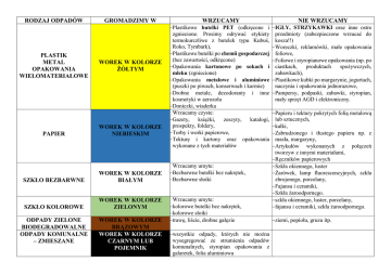 RODZAJ ODPADÓW PLASTIK METAL OPAKOWANIA WIELOMATERIAŁOWE PAPIER GROMADZIMY W WOREK W KOLORZE ŻÓŁTYM WOREK W KOLORZE NIEBIESKIM SZKŁO BEZBARWNE WOREK W KOLORZE BIAŁYM SZKŁO KOLOROWE WOREK W KOLORZE ZIELONYM ODPADY ZIELONE BIODEGRADOWALNE ODPADY KOMUNALNE – ZMIESZANE WOREK W KOLORZE BRĄZOWYM WOREK W KOLORZE CZARNYM LUB POJEMNIK WRZUCAMY NIE WRZUCAMY Plastikowe butelki PET (odkręcone i zgniecione. Prosimy odrywać etykiety termokurczliwe z butelek typu Kubuś, Roko, Tymbark), Plastikowe butelki po chemii gospodarczej (bez zawartości, odkręcone) Opakowania kartonowe po sokach i mleku (zgniecione) Opakowania metalowe i aluminiowe (puszki po piwach, konserwach i karmie) Drobne metale, dezodoranty i inne kosmetyki w aerozolu Doniczki, wiaderka Wrzucamy czyste: Gazety, książki, zeszyty, katalogi, prospekty, foldery, Torby i worki papierowe, Tekturę i kartony oraz opakowania wykonane z tych materiałów IGŁY, STRZYKAWKI oraz inne ostre przedmioty (zabezpieczone wrzucać do kosza!!) Woreczki, reklamówki, małe opakowania foliowe, Foliowe i styropianowe opakowania (np. po ciastkach, produktach spożywczych, zabawkach), Plastikowe kubki po margarynie, jogurtach, naczynia i opakowania jednorazowe, Pampersy, podpaski, zabawki, styropian, mały sprzęt AGD i elektroniczny. Wrzucamy umyte: Bezbarwne butelki bez nakrętek, Bezbarwne słoiki Wrzucamy umyte: kolorowe butelki bez nakrętek, kolorowe słoiki trawę, liście, drobne gałęzie wszystkie odpady, których nie można wysegregować ze strumienia odpadów komunalnych, styropian opakowania z galaretek, folia aluminiowa Papieru i tektury pokrytych folią metalową lub sztucznych, kalki, Zabrudzonego i tłustego papieru np. z masła, margaryny, Artykułów wykonanych z połączeń tworzyw z innymi materiałami, Ręczników papierowych Szkła okiennego, luster Żarówek, lamp fluorescencyjnych, szkła zbrojonego, porcelany, Fajansu i ceramiki, Szkła żaroodpornego. szkła okiennego, luster, porcelany, fajansu i ceramiki, szkła żaroodpornego. ziemi, popiołu, gruzu itp.