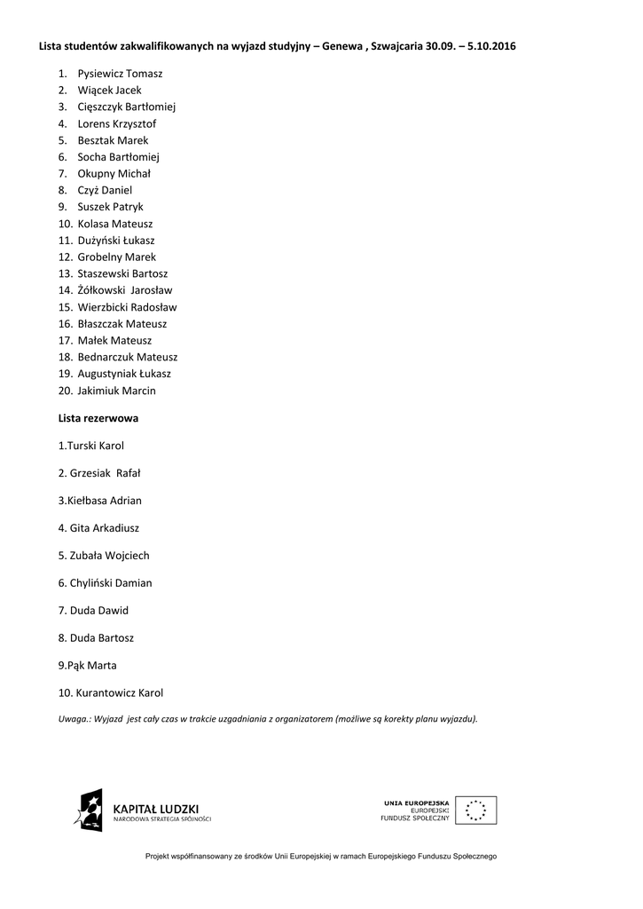 Lista studentów zakwalifikowanych na wyjazd studyjny – Genewa , Szwajcaria 30.09. – 5.10.2016 1. 2. 3. 4. 5. 6. 7. 8. 9. 10. 11. 12. 13. 14. 15. 16. 17. 18. 19. 20. Pysiewicz Tomasz Wiącek Jacek Cięszczyk Bartłomiej Lorens Krzysztof Besztak Marek Socha Bartłomiej Okupny Michał Czyż Daniel Suszek Patryk Kolasa Mateusz Dużyoski Łukasz Grobelny Marek Staszewski Bartosz Żółkowski Jarosław Wierzbicki Radosław Błaszczak Mateusz Małek Mateusz Bednarczuk Mateusz Augustyniak Łukasz Jakimiuk Marcin Lista rezerwowa 1.Turski Karol 2. Grzesiak Rafał 3.Kiełbasa Adrian 4. Gita Arkadiusz 5. Zubała Wojciech 6. Chylioski Damian 7. Duda Dawid 8. Duda Bartosz 9.Pąk Marta 10. Kurantowicz Karol Uwaga.: Wyjazd jest cały czas w trakcie uzgadniania z organizatorem (możliwe są korekty planu wyjazdu). Projekt współfinansowany ze środków Unii Europejskiej w ramach Europejskiego Funduszu Społecznego