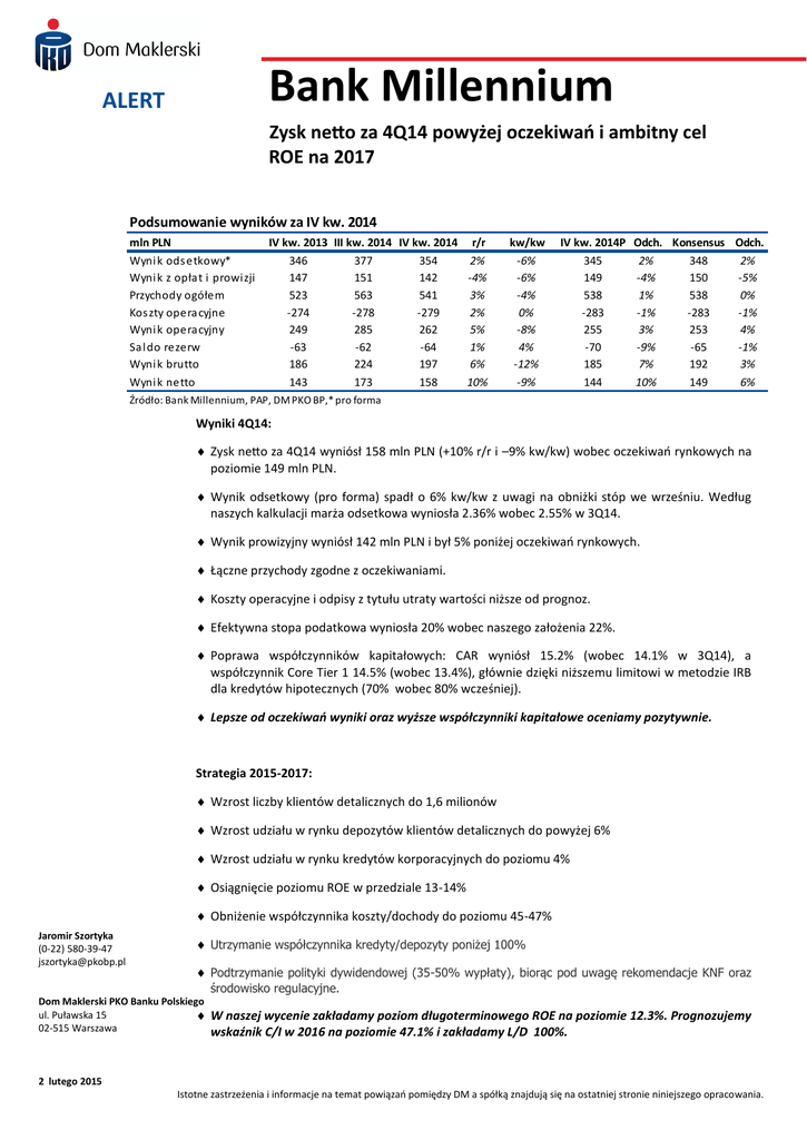 Bank Millennium ALERT Zysk netto za 4Q14 powyżej oczekiwań i ambitny cel ROE na 2017 Podsumowanie wyników za IV kw. 2014 mln PLN IV kw. 2013 III kw. 2014 IV kw. 2014 Wyni k ods etkowy* Wyni k z opła t i prowi zji Przychody ogółem Kos zty opera cyjne Wyni k opera cyjny Sa l do rezerw Wyni k brutto Wyni k netto 346 147 523 -274 249 -63 186 143 377 151 563 -278 285 -62 224 173 354 142 541 -279 262 -64 197 158 r/r kw/kw 2% -4% 3% 2% 5% 1% 6% 10% -6% -6% -4% 0% -8% 4% -12% -9% IV kw. 2014P Odch. Konsensus Odch. 345 149 538 -283 255 -70 185 144 2% -4% 1% -1% 3% -9% 7% 10% 348 150 538 -283 253 -65 192 149 2% -5% 0% -1% 4% -1% 3% 6% Źródło: Bank Millennium, PAP, DM PKO BP,* pro forma Wyniki 4Q14: Zysk netto za 4Q14 wyniósł 158 mln PLN (+10% r/r i –9% kw/kw) wobec oczekiwań rynkowych na poziomie 149 mln PLN. Wynik odsetkowy (pro forma) spadł o 6% kw/kw z uwagi na obniżki stóp we wrześniu. Według naszych kalkulacji marża odsetkowa wyniosła 2.36% wobec 2.55% w 3Q14. Wynik prowizyjny wyniósł 142 mln PLN i był 5% poniżej oczekiwań rynkowych. Łączne przychody zgodne z oczekiwaniami. Koszty operacyjne i odpisy z tytułu utraty wartości niższe od prognoz. Efektywna stopa podatkowa wyniosła 20% wobec naszego założenia 22%. Poprawa współczynników kapitałowych: CAR wyniósł 15.2% (wobec 14.1% w 3Q14), a współczynnik Core Tier 1 14.5% (wobec 13.4%), głównie dzięki niższemu limitowi w metodzie IRB dla kredytów hipotecznych (70% wobec 80% wcześniej). Lepsze od oczekiwań wyniki oraz wyższe współczynniki kapitałowe oceniamy pozytywnie. Strategia 2015-2017: Wzrost liczby klientów detalicznych do 1,6 milionów Wzrost udziału w rynku depozytów klientów detalicznych do powyżej 6% Wzrost udziału w rynku kredytów korporacyjnych do poziomu 4% Osiągnięcie poziomu ROE w przedziale 13-14% Obniżenie współczynnika koszty/dochody do poziomu 45-47% Jaromir Szortyka (0-22) 580-39-47 [email protected] Utrzymanie współczynnika kredyty/depozyty poniżej 100% Podtrzymanie polityki dywidendowej (35-50% wypłaty), biorąc pod uwagę rekomendacje KNF oraz środowisko regulacyjne. Dom Maklerski PKO Banku Polskiego ul. Puławska 15 02-515 Warszawa W naszej wycenie zakładamy poziom długoterminowego ROE na poziomie 12.3%. Prognozujemy wskaźnik C/I w 2016 na poziomie 47.1% i zakładamy L/D 100%. 2 lutego 2015 Istotne zastrzeżenia i informacje na temat powiązań pomiędzy DM a spółką znajdują się na ostatniej stronie niniejszego opracowania. Dom Maklerski PKO Banku Polskiego ul. Puławska 15, 02-515 Warszawa tel. (0-22) 521-80-00, fax (0-22) 521-79-46 e-mail: [email protected] Telefony kontaktowe Biuro Analiz Rynkowych Dyrektor Sektor wydobywczy Przemysł paliwowy, chemiczny, spożywczy Sektor energetyczny, deweloperski Sektor finansowy Handel, media, telekomunikacja, informatyka Przemysł, budownictwo, inne Analiza techniczna Artur Iwański (022) 521 79 31 [email protected] Monika Kalwasińska (022) 521 79 41 [email protected] Stanisław Ozga (022) 521 79 13 [email protected] Jaromir Szortyka (022) 580 39 47 [email protected] Włodzimierz Giller (022) 521 79 17 [email protected] Piotr Łopaciuk (022) 521 48 12 [email protected] Przemysław Smoliński (022) 521 79 10 [email protected] Paweł Małmyga (022) 521 65 73 [email protected] Analiza techniczna Biuro Klientów Instytucjonalnych Wojciech Żelechowski Dariusz Andrzejak Krzysztof Kubacki Tomasz Ilczyszyn Michał Sergejev Tomasz Zabrocki (0-22) 521 79 19 [email protected] (0-22) 521 91 39 [email protected] (0-22) 521 91 33 [email protected] (0-22) 521 82 10 [email protected] (0-22) 521 82 14 [email protected] (0-22) 521 82 13 [email protected] Piotr Dedecjus Maciej Kałuża Igor Szczepaniec Marcin Borciuch Joanna Wilk Mark Cowley (0-22) 521 91 40 [email protected] (0-22) 521 91 50 [email protected] (0-22) 521 65 41 [email protected] (0-22) 521 82 12 [email protected] (0-22) 521 48 93 [email protected] (0-22) 521 52 46 [email protected] Objaśnienie używanej terminologii fachowej min (max) 52 tyg - minimum ( maksimum) kursu rynkowego akcji w okresie ostatnich 52 tygodni kapitalizacja - iloczyn ceny rynkowej akcji i liczby akcji EV - suma kapitalizacji i długu netto spółki free float (%) - udział liczby akcji ogółem pomniejszonej o 5% pakiety akcji znajdujące się w posiadaniu jednego akcjonariusza i akcje własne należące do spółki, w ogólnej liczbie akcji śr obrót/msc - średni obrót na miesiąc obliczony jako suma wartości obrotu za ostatnie 12 miesięcy podzielona przez 12 ROE - stopa zwrotu z kapitałów własnych ROA - stopa zwrotu z aktywów EBIT - zysk operacyjny EBITDA - zysk operacyjny + amortyzacja EPS - zysk netto na 1 akcję DPS - dywidenda na 1 akcję CEPS - suma zysku netto i amortyzacji na 1 akcję P/E - iloraz ceny rynkowej akcji i EPS P/BV - iloraz ceny rynkowej akcji i wartości księgowej jednej akcji EV/EBITDA - iloraz kapitalizacji powiększonej o dług netto spółki oraz EBITDA marża brutto na sprzedaży - relacja zysku brutto na sprzedaży do przychodów netto ze sprzedaży marża EBITDA - relacja sumy zysku operacyjnego i amortyzacji do przychodów netto ze sprzedaży marża EBIT - relacja zysku operacyjnego do przychodów netto ze sprzedaży rentowność netto - relacja zysku netto do przychodów netto ze sprzedaży Rekomendacje stosowane przez DM PKO BP Rekomendacja KUPUJ oznacza, że autor rekomendacji uważa, iż akcje spółki posiadają co najmniej 10% potencjał wzrostu kursu Rekomendacja TRZYMAJ oznacza, że autor rekomendacji uważa, iż akcje spółki posiadają potencjał wzrostu kursu w przedziale od 0 do 10% Rekomendacja SPRZEDAJ oznacza, że autor rekomendacji uważa, iż akcje spółki posiadają potencjał spadku kursu Rekomendacje wydawane przez DM PKO BP obowiązują przez okres 12 miesięcy od daty wydania lub do momentu zrealizowania kursu docelowego, chyba, że w tym okresie zostaną zaktualizowane. DM PKO BP dokonuje aktualizacji wydawanych rekomen