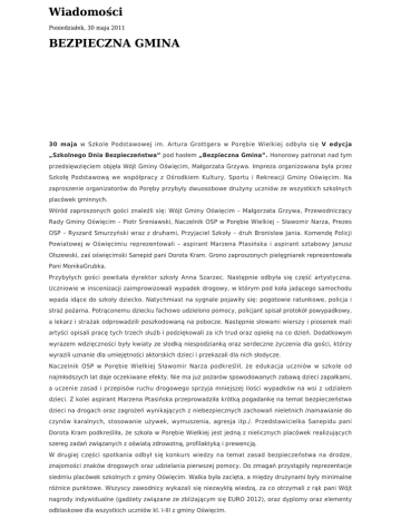 Wiadomości Poniedziałek, 30 maja 2011 BEZPIECZNA GMINA 30 maja w Szkole Podstawowej im. Artura Grottgera w Porębie Wielkiej odbyła się V edycja „Szkolnego Dnia Bezpieczeństwa” pod hasłem „Bezpieczna Gmina”. Honorowy patronat nad tym przedsięwzięciem objęła Wójt Gminy Oświęcim, Małgorzata Grzywa. Impreza organizowana była przez Szkołę Podstawową we współpracy z Ośrodkiem Kultury, Sportu i Rekreacji Gminy Oświęcim. Na zaproszenie organizatorów do Poręby przybyły dwuosobowe drużyny uczniów ze wszystkich szkolnych placówek gminnych. Wśród zaproszonych gości znaleźli się: Wójt Gminy Oświęcim – Małgorzata Grzywa, Przewodniczący Rady Gminy Oświęcim – Piotr Śreniawski, Naczelnik OSP w Porębie Wielkiej – Sławomir Narza, Prezes OSP – Ryszard Smurzyński wraz z druhami, Przyjaciel Szkoły – druh Bronisław Jania. Komendę Policji Powiatowej w Oświęcimiu reprezentowali – aspirant Marzena Ptasińska i aspirant sztabowy Janusz Olszewski, zaś oświęcimski Sanepid pani Dorota Kram. Grono zaproszonych pielęgniarek reprezentowała Pani MonikaGrubka. Przybyłych gości powitała dyrektor szkoły Anna Szarzec. Następnie odbyła się część artystyczna. Uczniowie w inscenizacji zaimprowizowali wypadek drogowy, w którym pod koła jadącego samochodu wpada idące do szkoły dziecko. Natychmiast na sygnale pojawiły się: pogotowie ratunkowe, policja i straż pożarna. Potrąconemu dziecku fachowo udzielono pomocy, policjant spisał protokół powypadkowy, a lekarz i strażak odprowadzili poszkodowaną na pobocze. Następnie słowami wierszy i piosenek mali artyści opisali pracę tych trzech służb i podziękowali za ich trud oraz opiekę na co dzień. Dodatkowym wyrazem wdzięczności były kwiaty ze słodką niespodzianką oraz serdeczne życzenia dla gości, którzy wyrazili uznanie dla umiejętności aktorskich dzieci i przekazali dla nich słodycze. Naczelnik OSP w Porębie Wielkiej Sławomir Narza podkreślił, że edukacja uczniów w szkole od najmłodszych lat daje oczekiwane efekty. Nie ma już pożarów spowodowanych zabawą dzieci zapałkami, a uczenie zasad i przepisów ruchu drogowego sprzyja mniejszej ilości wypadków na wsi z udziałem dzieci. Z kolei aspirant Marzena Ptasińska przeprowadziła krótką pogadankę na temat bezpieczeństwa dzieci na drogach oraz zagrożeń wynikających z niebezpiecznych zachowań nieletnich /namawianie do czynów karalnych, stosowanie używek, wymuszenia, agresja itp./. Przedstawicielka Sanepidu pani Dorota Kram podkreśliła, że szkoła w Porębie Wielkiej jest jedną z nielicznych placówek realizujących szereg zadań związanych z oświatą zdrowotną, profilaktyką i prewencją. W drugiej części spotkania odbył się konkurs wiedzy na temat zasad bezpieczeństwa na drodze, znajomości znaków drogowych oraz udzielania pierwszej pomocy. Do zmagań przystąpiły reprezentacje siedmiu placówek szkolnych z gminy Oświęcim. Walka była zacięta, a między drużynami były minimalne różnice punktowe. Wszyscy zawodnicy wykazali się niezwykłą wiedzą, za co otrzymali z rąk pani Wójt nagrody indywidualne (gadżety związane ze zbliżającym się EURO 2012), oraz dyplomy oraz elementy odblaskowe dla wszystkich uczniów kl. I-III z gminy Oświęcim. Następnie odbyły się pokazy przygotowane przez strażaków z OSP w Porębie Wielkiej. W ruch poszły węże i armatki strażackie i zainscenizowany pożar został ugaszony. Mały prysznic dosięgnął także wszystkich zgromadzonych na boisku szkolnym. Największą frajdę uczniom sprawiło siedzenie za kierownicą nowoczesnego wozu strażackiego. Wszyscy mieli również możliwość poćwiczenia udzielania pierwszej pomocy. Do tego celu przeszkoleni przez współpracowników Jurka Owsiaka nauczyciele wykorzystali fantomy, które szkoła otrzymała od Wielkiej Orkiestry Świątecznej Pomocy. Myślimy, że ten dzień na długo pozostanie w pamięci zarówno dzieci, pracowników szkoły, jak i przybyłych gości. O tym, jak ważne jest współdziałanie w/w służb można się przekonać każdego dnia, zaś dziękować im za służbę dla zdrowia i bezpieczeństwa należy do końca świata i o jeden dzień dłużej. Opracowały: Maria Biela, Urszula Mitoraj Nauczyciele SP w Porębie Wielkiej Składam serdeczne podziękowania za współorganizację imprezy Dyrektorowi OKSiR-u w Brzezince Pani Jadwidze Szczerbowskiej wraz z pracownikami, Strażakom OSP w Porębie Wielkiej za przygotowanie pokazów, Urzędowi Gminy Oświęcim za przekazanie elementów odblaskowych, nauczycielkom - Pani Marii Biela i Urszuli Mitoraj, które wraz z uczniami przygotowały imprezę, pracownikom szkoły oraz wszystkim, którzy w jakikolwiek sposób przyczynili się do uświetnienia uroczystości. Dyrektor SP w Porębie Wielkiej – Anna Szarzec
