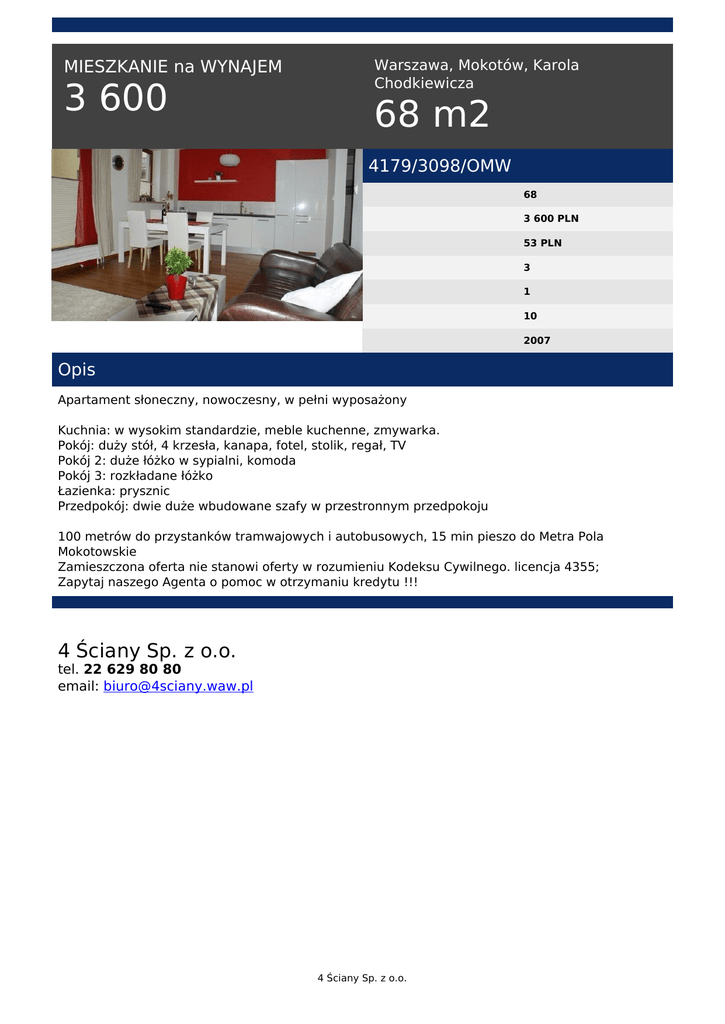 MIESZKANIE na WYNAJEM 3 600 Warszawa, Mokotów, Karola Chodkiewicza 68 m2 4179/3098/OMW 68 3 600 PLN 53 PLN 3 1 10 2007 Opis Apartament słoneczny, nowoczesny, w pełni wyposażony Kuchnia: w wysokim standardzie, meble kuchenne, zmywarka. Pokój: duży stół, 4 krzesła, kanapa, fotel, stolik, regał, TV Pokój 2: duże łóżko w sypialni, komoda Pokój 3: rozkładane łóżko Łazienka: prysznic Przedpokój: dwie duże wbudowane szafy w przestronnym przedpokoju 100 metrów do przystanków tramwajowych i autobusowych, 15 min pieszo do Metra Pola Mokotowskie Zamieszczona oferta nie stanowi oferty w rozumieniu Kodeksu Cywilnego. licencja 4355; Zapytaj naszego Agenta o pomoc w otrzymaniu kredytu !!! 4 Ściany Sp. z o.o. tel. 22 629 80 80 email: [email protected] 4 Ściany Sp. z o.o. Powered by TCPDF (www.tcpdf.org)