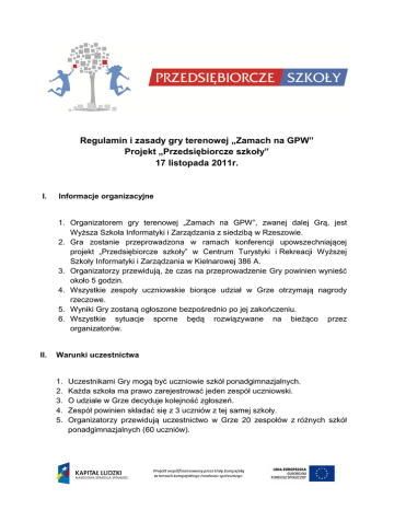 Regulamin i zasady gry terenowej „Zamach na GPW” Projekt „Przedsiębiorcze szkoły” 17 listopada 2011r. I. Informacje organizacyjne 1. Organizatorem gry terenowej „Zamach na GPW”, zwanej dalej Grą, jest Wyższa Szkoła Informatyki i Zarządzania z siedzibą w Rzeszowie. 2. Gra zostanie przeprowadzona w ramach konferencji upowszechniającej projekt „Przedsiębiorcze szkoły” w Centrum Turystyki i Rekreacji Wyższej Szkoły Informatyki i Zarządzania w Kielnarowej 386 A. 3. Organizatorzy przewidują, że czas na przeprowadzenie Gry powinien wynieść około 5 godzin. 4. Wszystkie zespoły uczniowskie biorące udział w Grze otrzymają nagrody rzeczowe. 5. Wyniki Gry zostaną ogłoszone bezpośrednio po jej zakończeniu. 6. Wszystkie sytuacje sporne będą rozwiązywane na bieżąco przez organizatorów. II. Warunki uczestnictwa 1. 2. 3. 4. 5. Uczestnikami Gry mogą być uczniowie szkół ponadgimnazjalnych. Każda szkoła ma prawo zarejestrować jeden zespół uczniowski. O udziale w Grze decyduje kolejność zgłoszeń. Zespół powinien składać się z 3 uczniów z tej samej szkoły. Organizatorzy przewidują uczestnictwo w Grze 20 zespołów z różnych szkół ponadgimnazjalnych (60 uczniów). 6. Gra rozpocznie się o godzinie 10:00. Uczestnicy Gry zostaną przetransportowani z miejsca rejestracji do Centrum Turystyki i Rekreacji w Kielnarowej, gdzie zostanie przeprowadzona Gra. III. Zasady rozgrywki 1. Uczniowie biorący udział w Grze wcielają się w Agentów Bezpieczeństwa Wewnętrznego, których celem jest odnalezienie miejsca podłożenia ładunku wybuchowego znajdującej się w budynku GPW oraz jego rozbrojenie. 2. Podczas Gry zespoły będą musiały rozwiązać szereg zagadek ekonomicznych i logicznych, które doprowadzą ich do celu. 3. W przypadku braku rozwiązania zadania ekonomicznego lub logicznego zespół musi przejść rundę karną, której trasa zostanie wskazana przez organizatorów. 4. O końcowym rankingu zdecydują wyniki uzyskane w poszczególnych częściach Gry: wynik uzyskany w teście wiedzy ekonomicznej składającym się z 30 pytań testowych jednokrotnego i wielokrotnego wyboru oraz pytań otwartych, kolejność rozwiązania głównego zadania – pierwszy zespół za odgadnięcie zagadki głównej otrzymuje 60 pkt., drugi 57 pkt., trzeci 54 pkt. … dwudziesty zespół – 3 pkt. 5. Za rozwiązanie zagadek ekonomicznych i logicznych nie są przyznawane dodatkowe punkty do końcowego rankingu. 6. Gra rozpoczyna się testem wiedzy ekonomicznej. Czas startu poszczególnych zespołów będzie uzależniony od czasu rozwiązania testu. 7. Po rozwiązaniu testu każdy z zespołów otrzyma wskazówkę, która poprowadzi zespół do kolejnego zadania. 8. Zespoły będą musiały poruszać się po głównym budynku dydaktycznym WSIiZ w Kielnarowej w celu odgadnięcia zagadki głównej. 9. Ranking zespołów zostanie ogłoszony po zakończeniu Gry przez wszystkie zespoły uczniowskie. Maksymalna liczba punktów do zdobycia to: Zagadka główna = 60 punktów, Test wiedzy ekonomicznej = 40 punktów W sumie maksymalna liczba punktów do zdobycia = 100