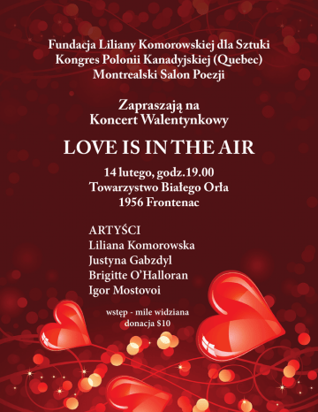 Fundacja Liliany Komorowskiej dla Sztuki Kongres Polonii Kanadyjskiej (Quebec) Montrealski Salon Poezji Zapraszają na Koncert Walentynkowy LOVE IS IN THE AIR 14 lutego, godz.19.00 Towarzystwo Białego Orła 1956 Frontenac ARTYŚCI Liliana Komorowska Justyna Gabzdyl Brigitte O’Halloran Igor Mostovoi wstęp - mile widziana donacja $10